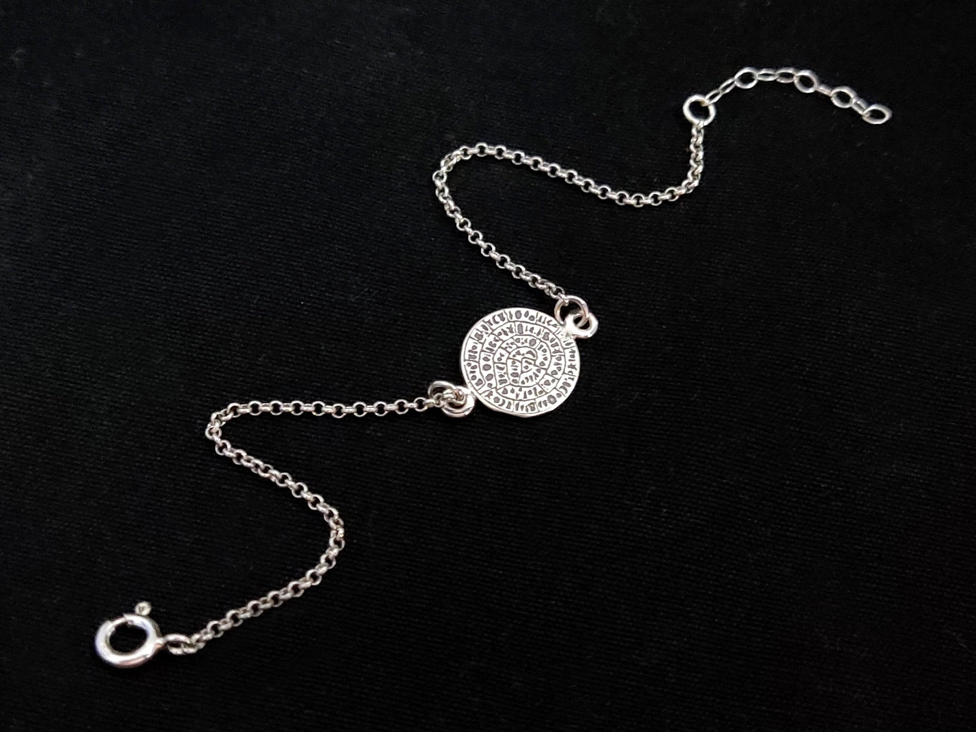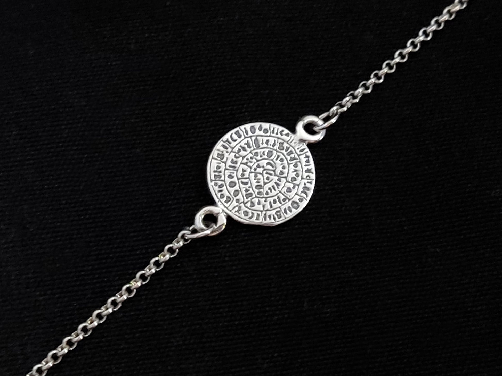 Wir präsentieren unser wunderschönes, verstellbares Armband aus Sterlingsilber 925, gefertigt in Griechenland. Das Armband ist von 17–20 cm (6,63–7,80 Zoll) und 2 mm breit verstellbar und passt somit perfekt zu jedem Handgelenk. Das Herzstück bildet der antike, minoische Diskos von Phaistos mit einem Durchmesser von 10 mm. Mit dem 925er-Stempel ist dieses Schmuckstück eine perfekte Mischung aus griechischem Erbe und modernem Stil. Kostenloser Versand inklusive. Verleihen Sie Ihrer Schmucksammlung mit diesem einzigartigen Stück einen Hauch von Eleganz.