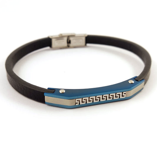 Stanless Steel Greek Key Silver-Blue Design Black Leather Bracelet