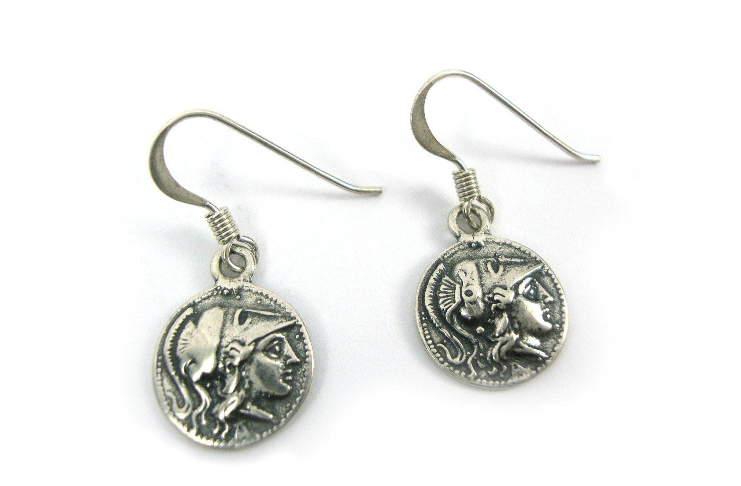 Greek Earrings, Sterling Solid Silver 925 Small Earrings Ancient Greek Coin Goddess Athena 13mm, Griechische Silber Ohrringe, Bijoux Grecs