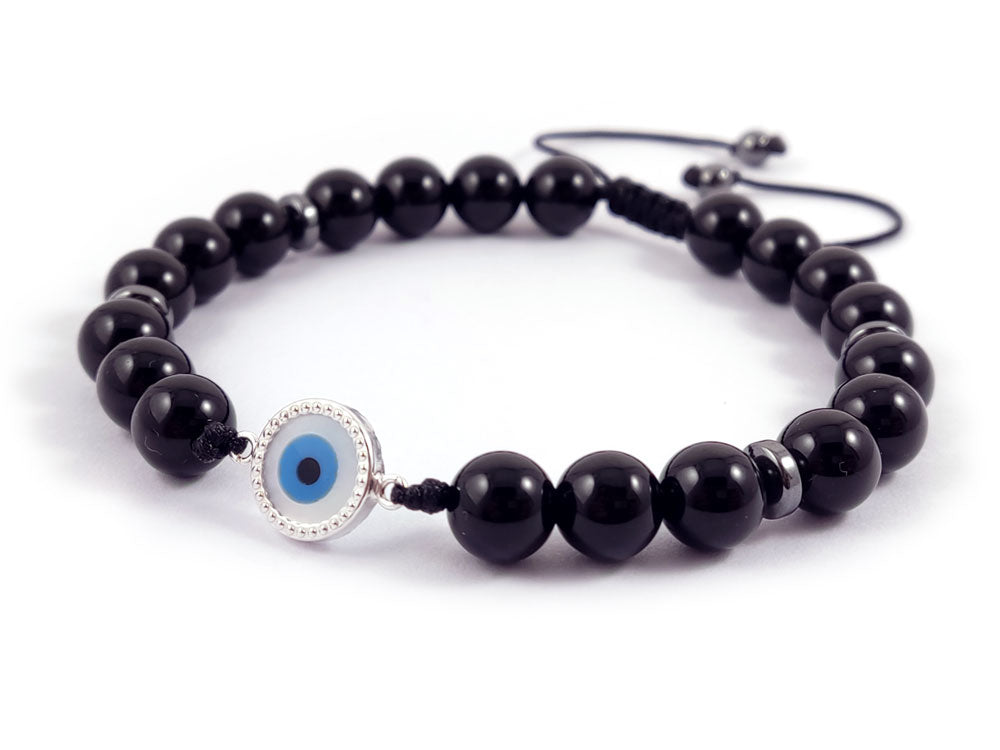 Sterling Silver 925 Evil Eye Mother Of Pearl And Natural Black Onyx Stones 8mm Bracelet