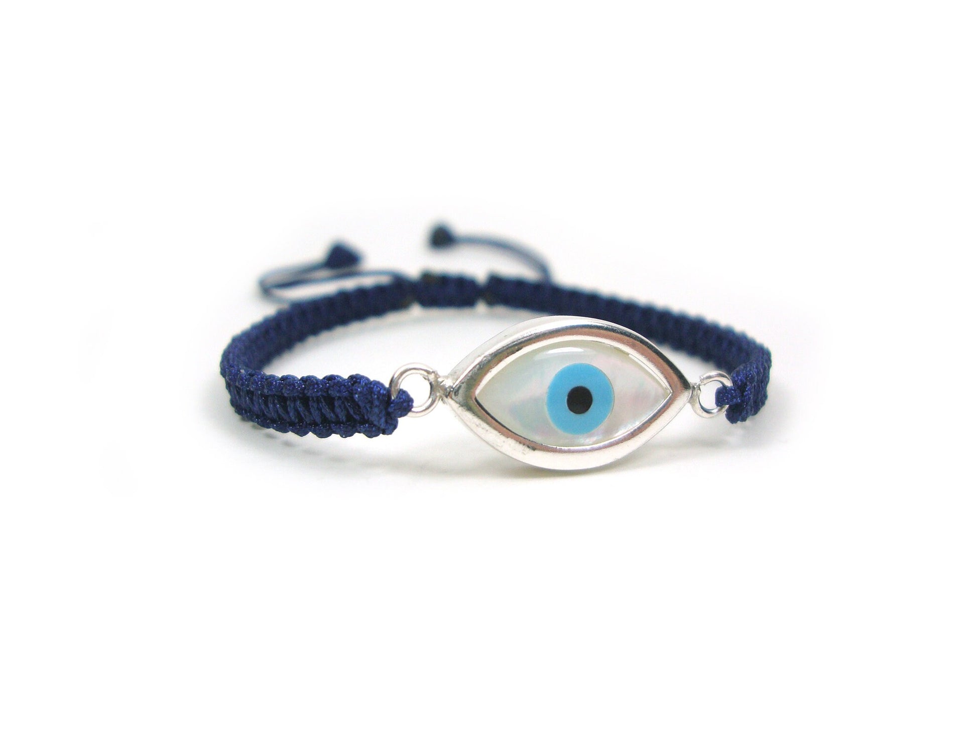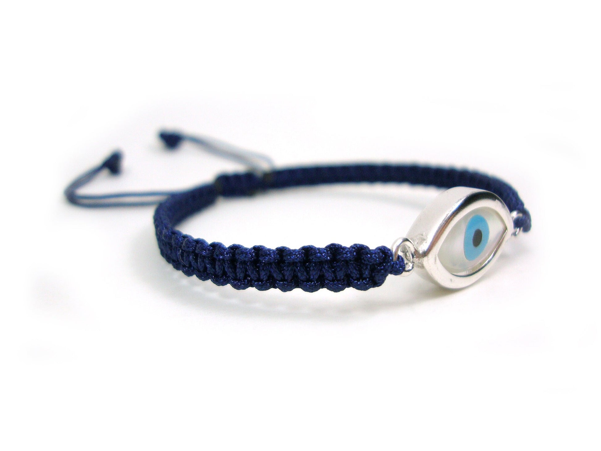 Sterling Silver 925 Greek Evil Eye Shape Good Luck 10mm Handmade Adjustable Macrame Blue Bracelet , Griechisches Armband, Bijoux Grecque