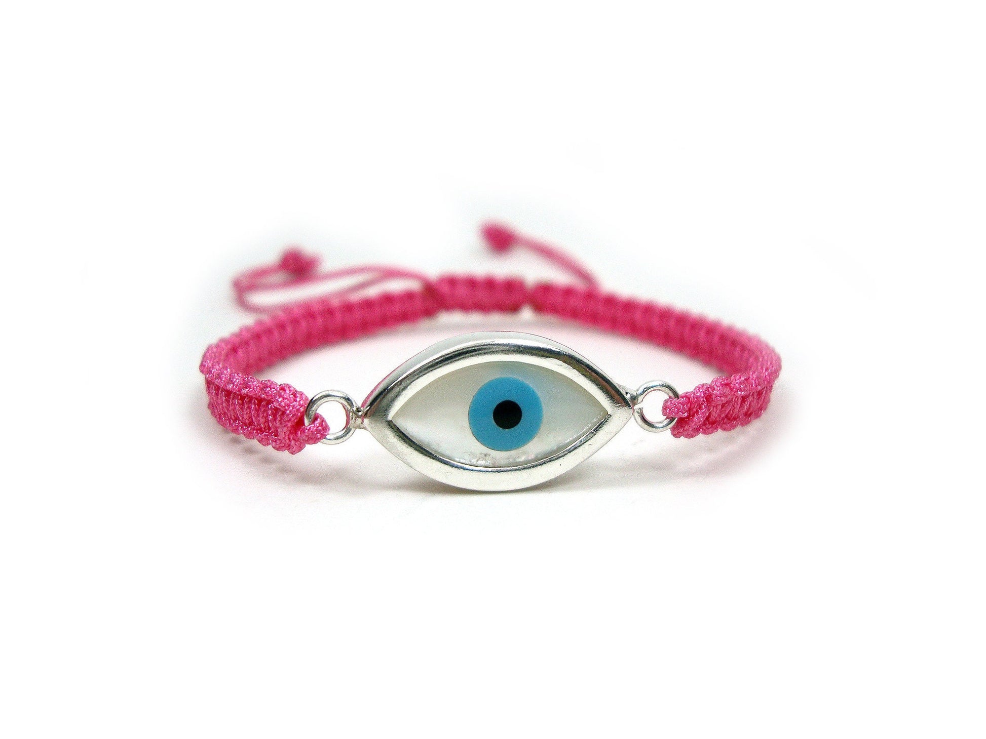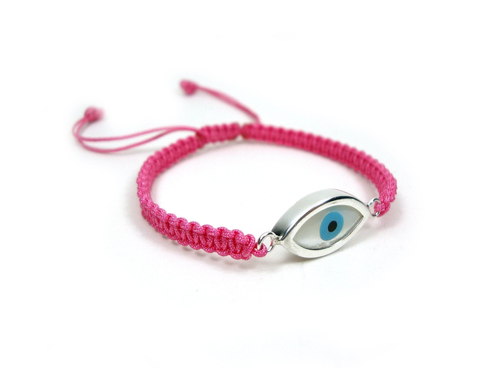 Sterling Silver 925 Greek Evil Eye Shape Good Luck 10mm Handmade Adjustable Macrame Pink Bracelet , Griechisches Armband, Bijoux Grecque