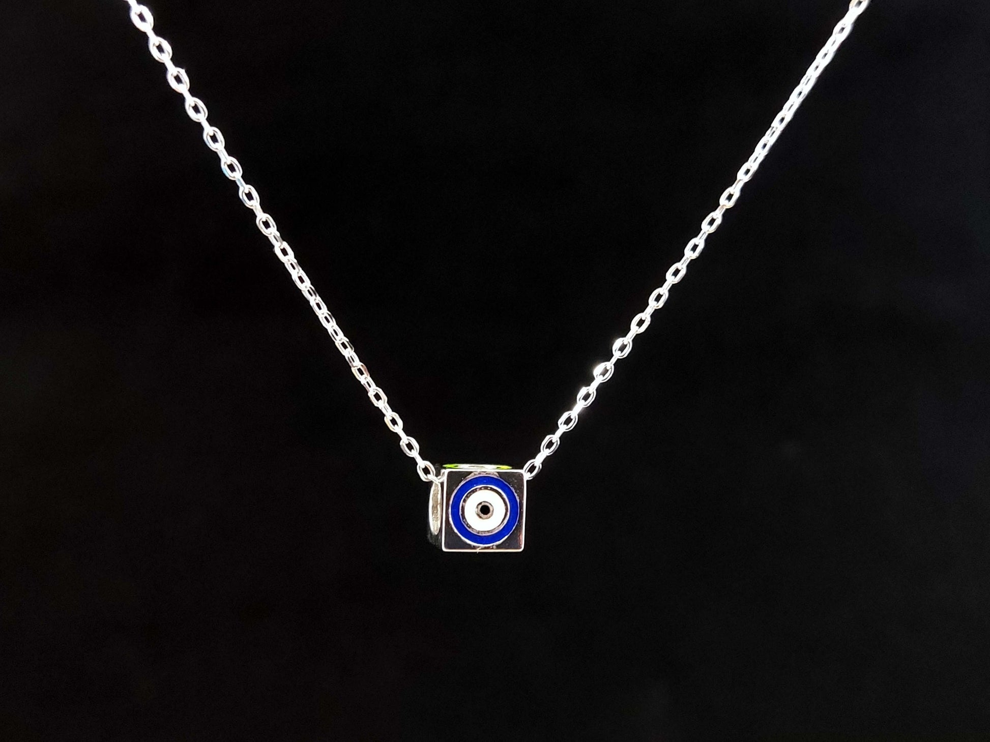 Sterling Silver 925 Cube Multicolor Good Luck Blue Evil Eye Chain Pendant Necklace, Griechischer Silber Kette, Bijoux Grecque, Greek Jewelry