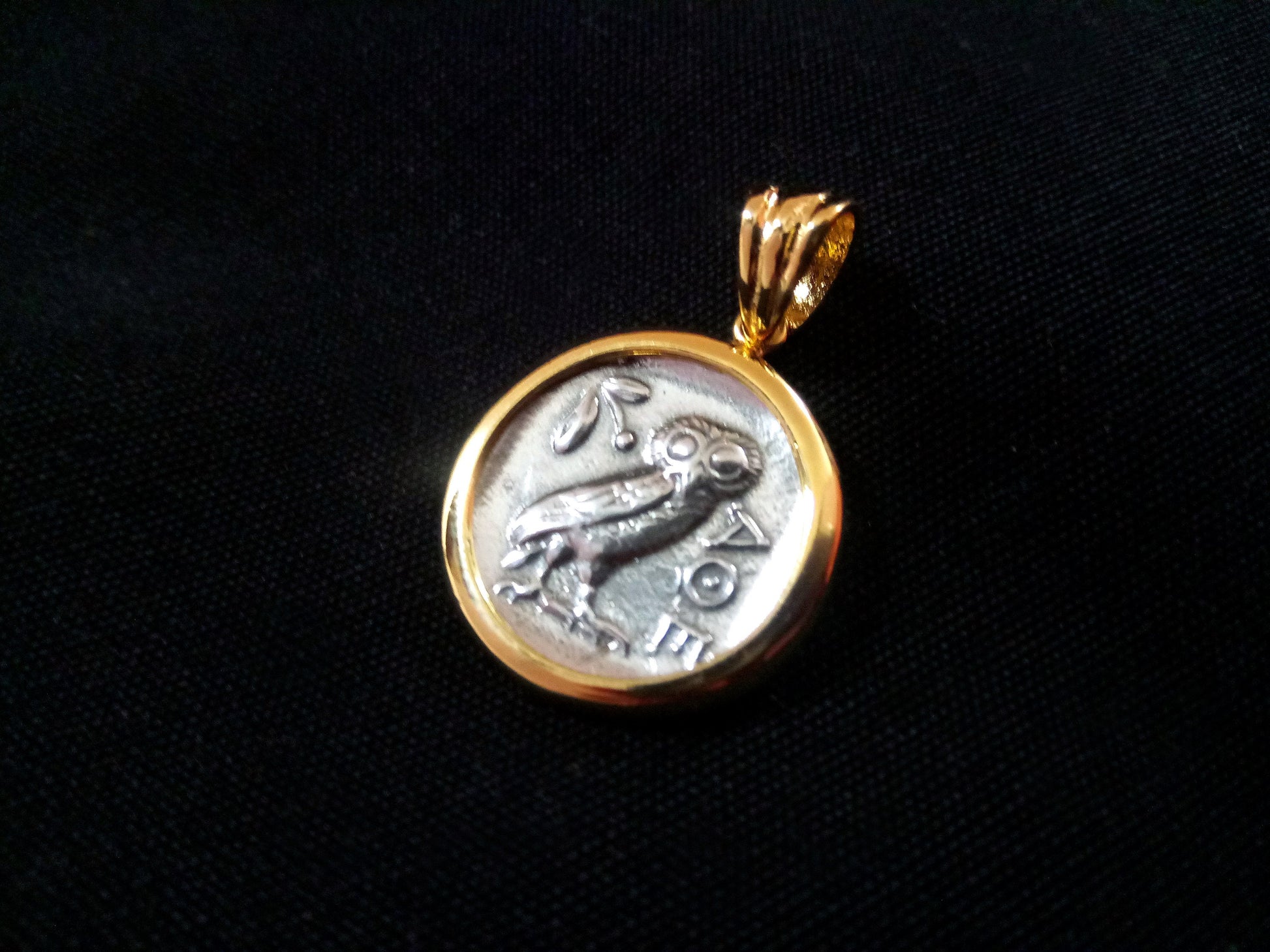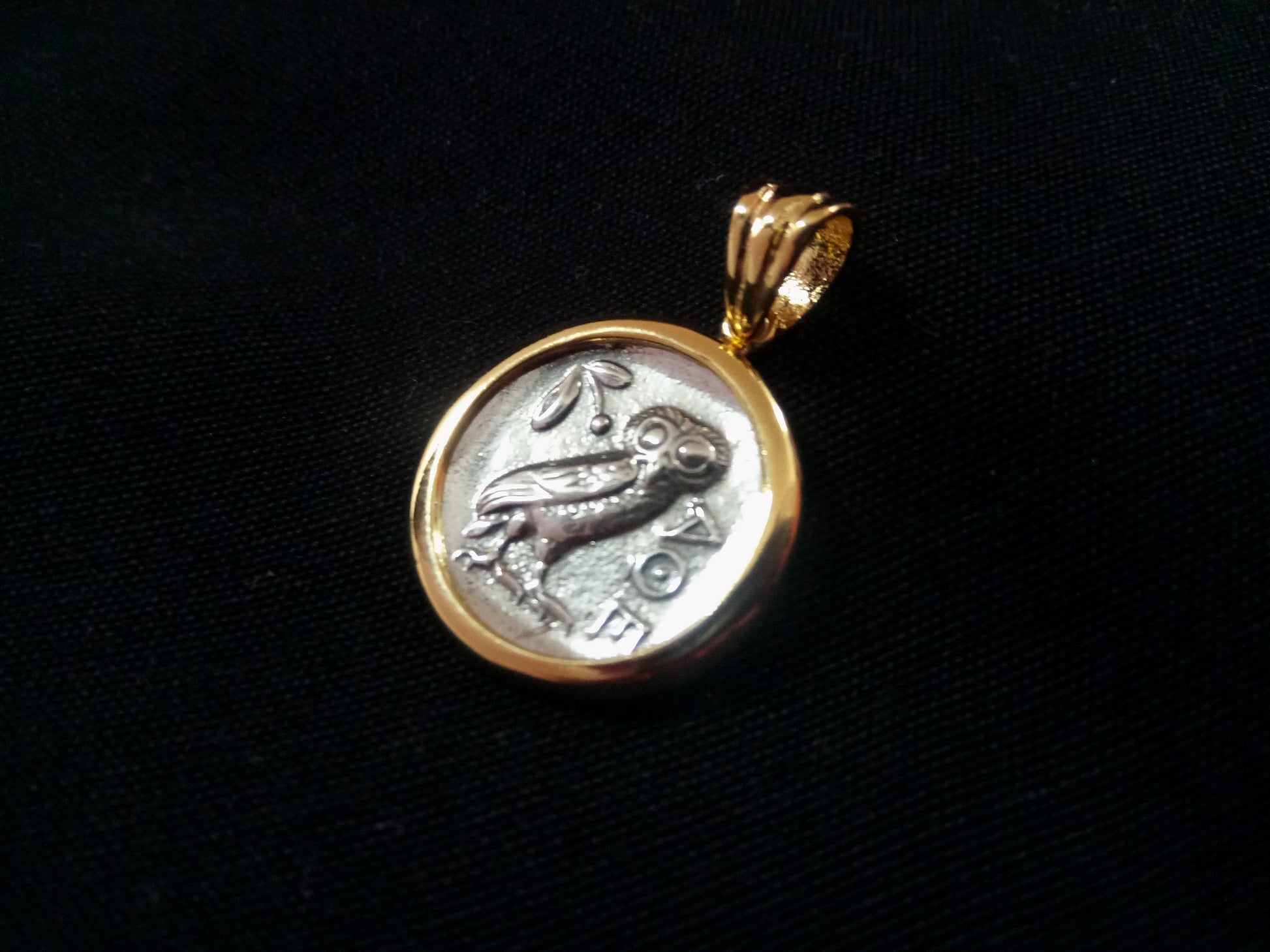 Sterling Silver 925 Greek Owl Gold Plated 21 mm Greek Pendant, Greek Jewelry Owl Pendant, Griechische Vergoldete Eule Anhanger Schmuck