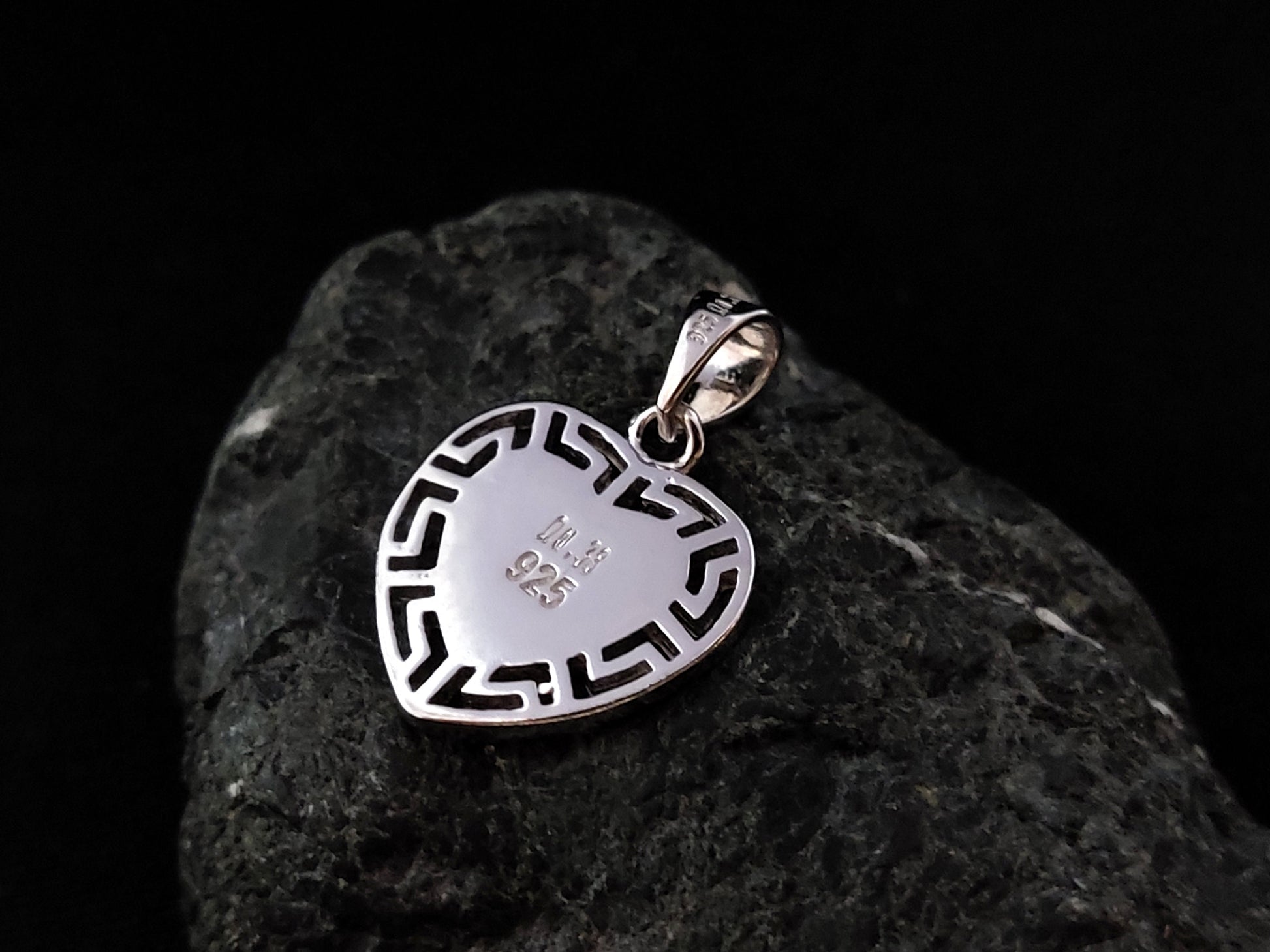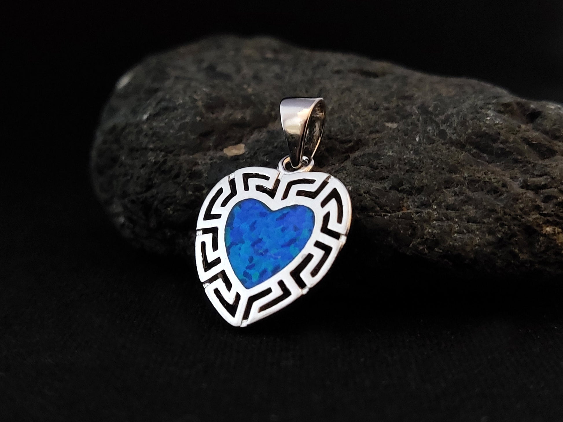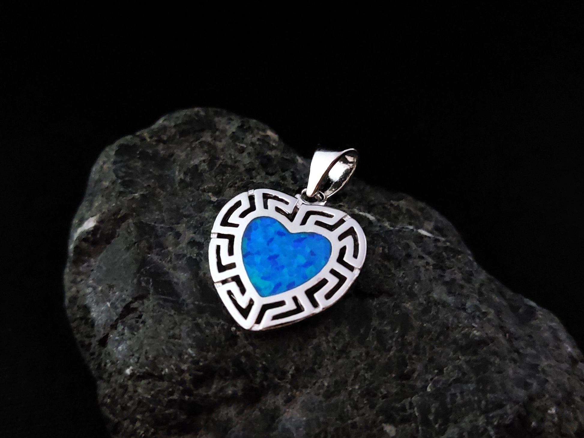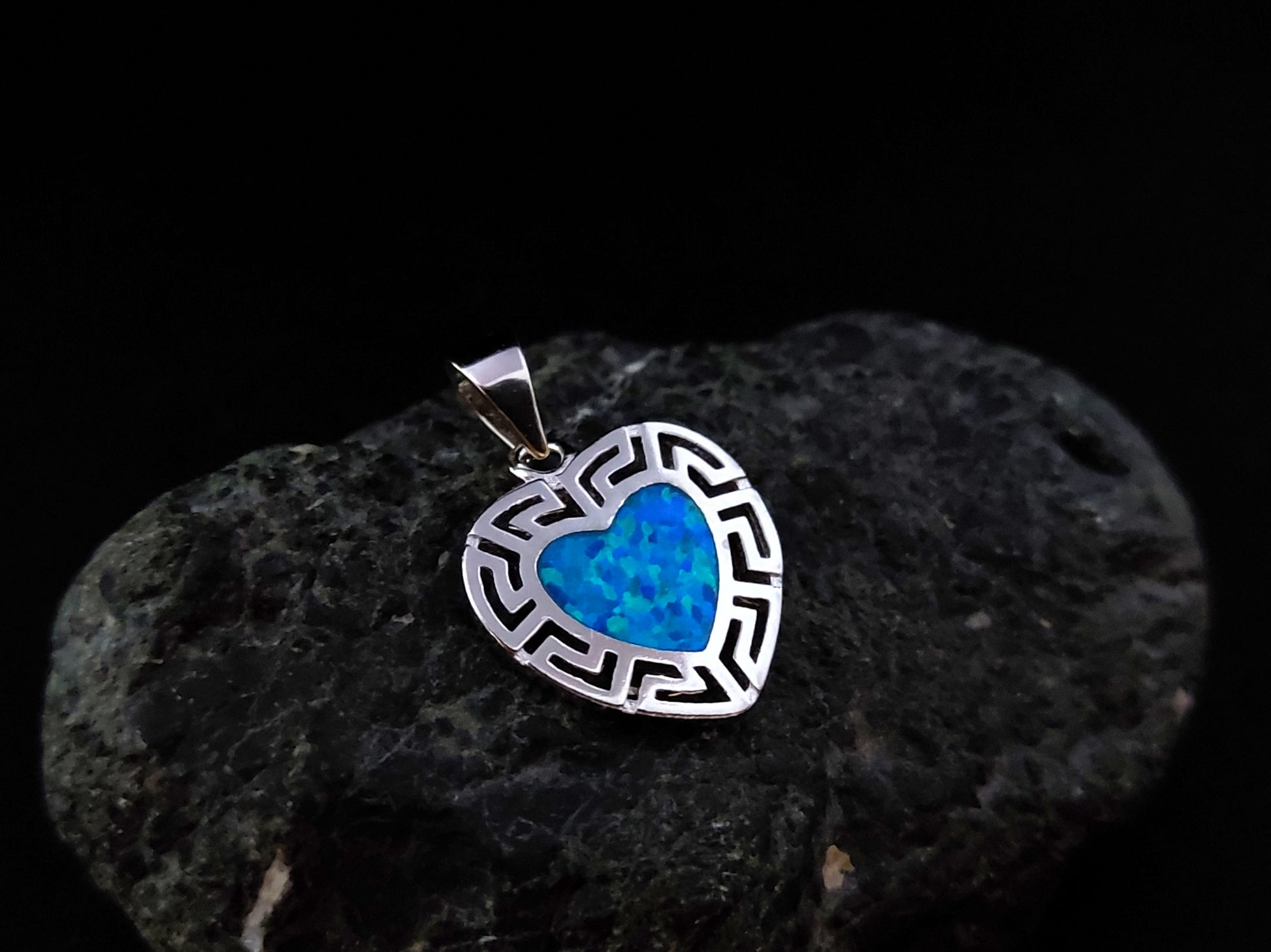 Sterling Silver 925 Heart Fire Rainbow Blue Opal 14x15mm, Greek Key Meander Pendant, Griechisches Silber Herz Anhanger Seestern Schmuck