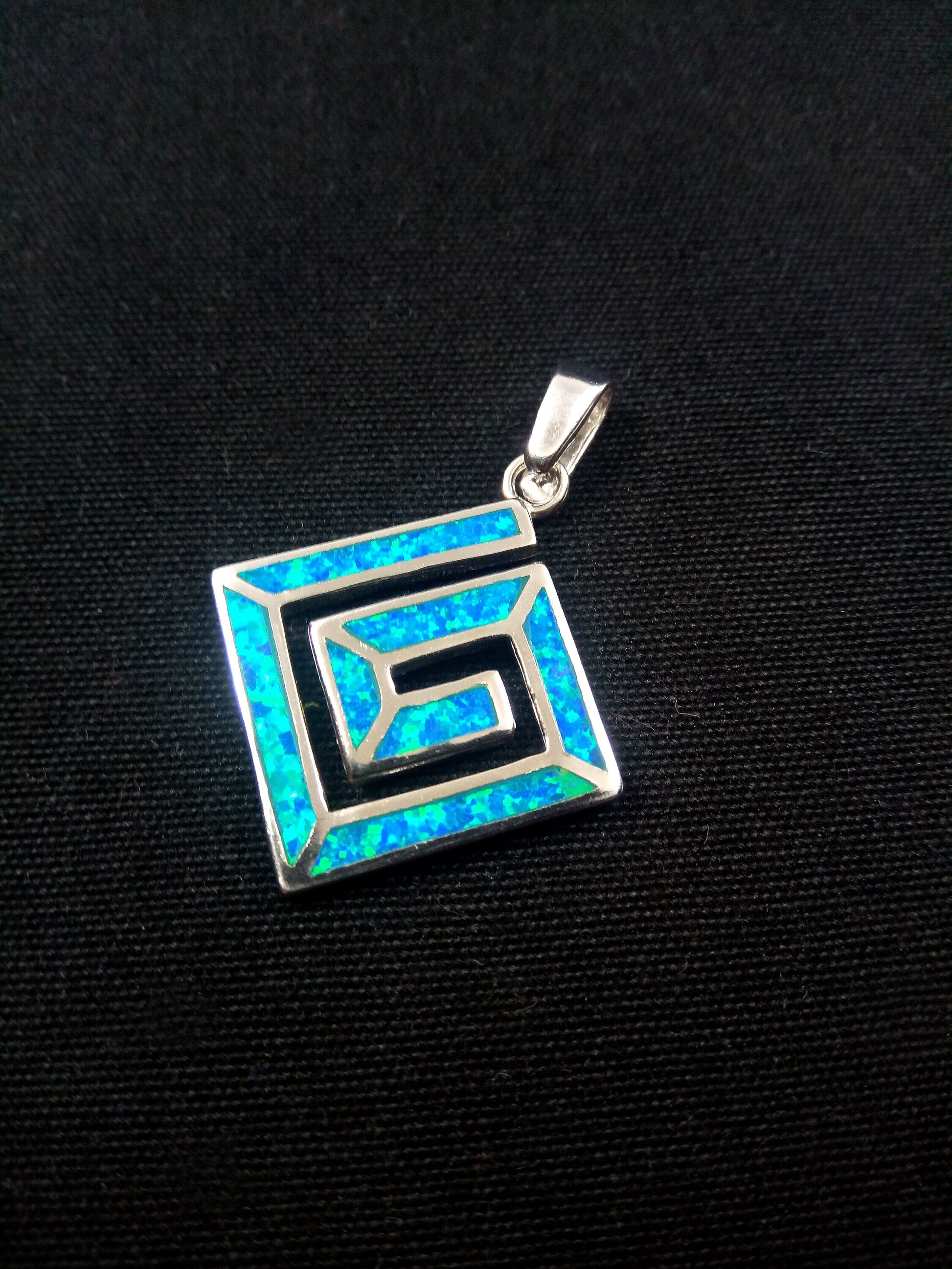 Greek Key Blue Opal Square Silver Pendant 20x20mm