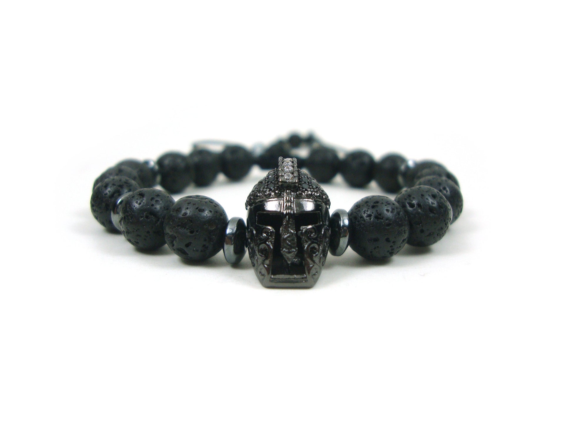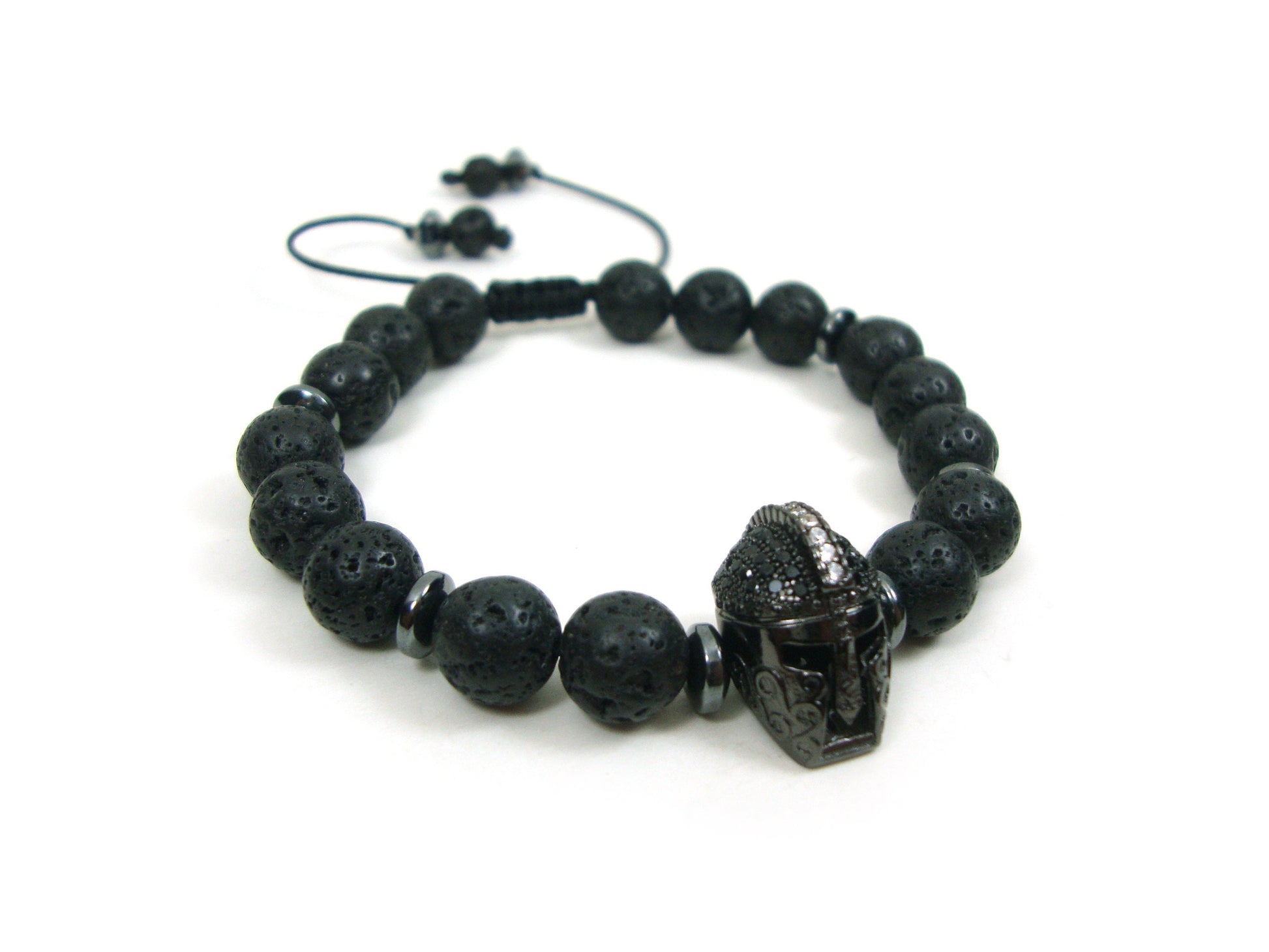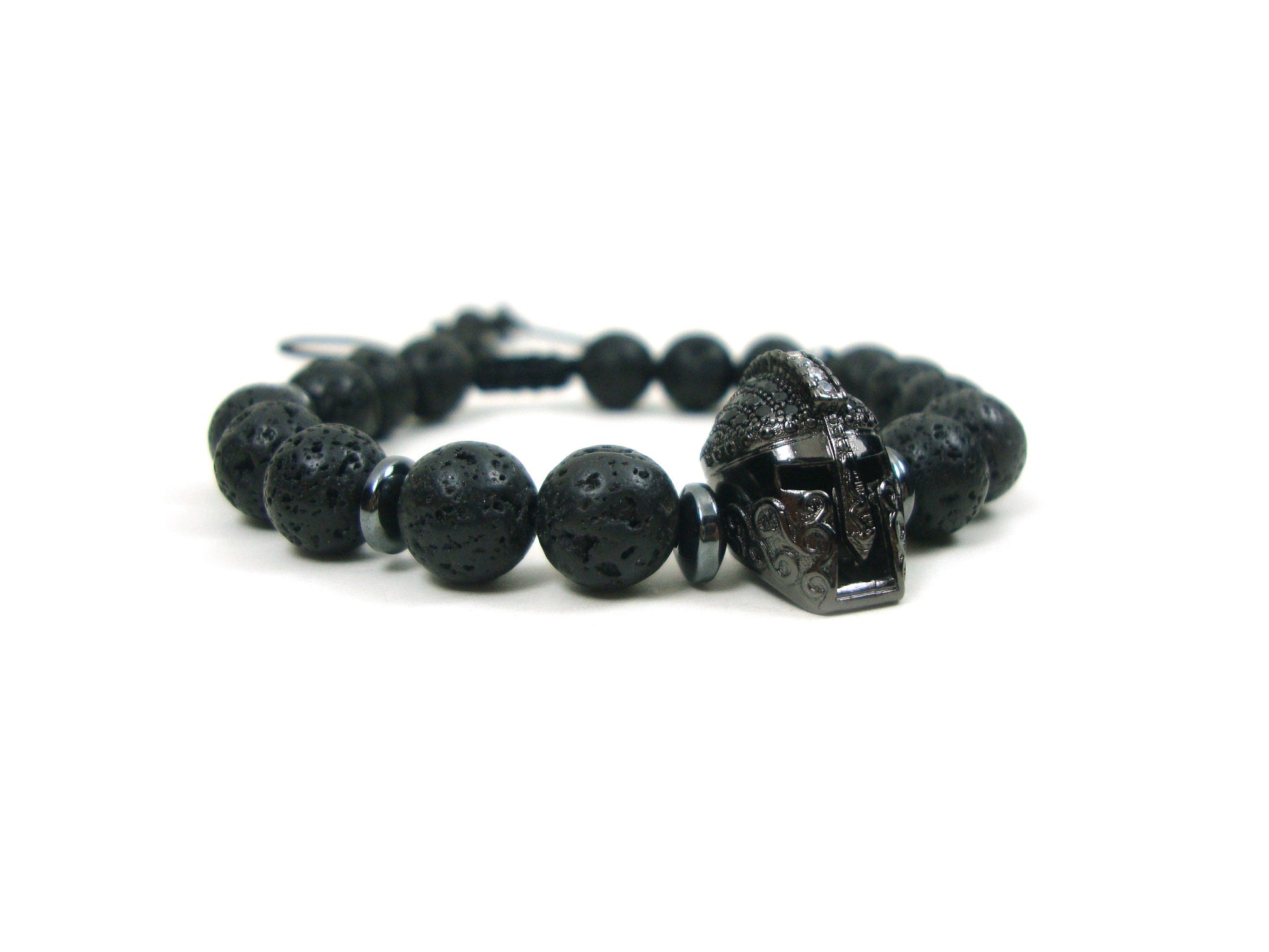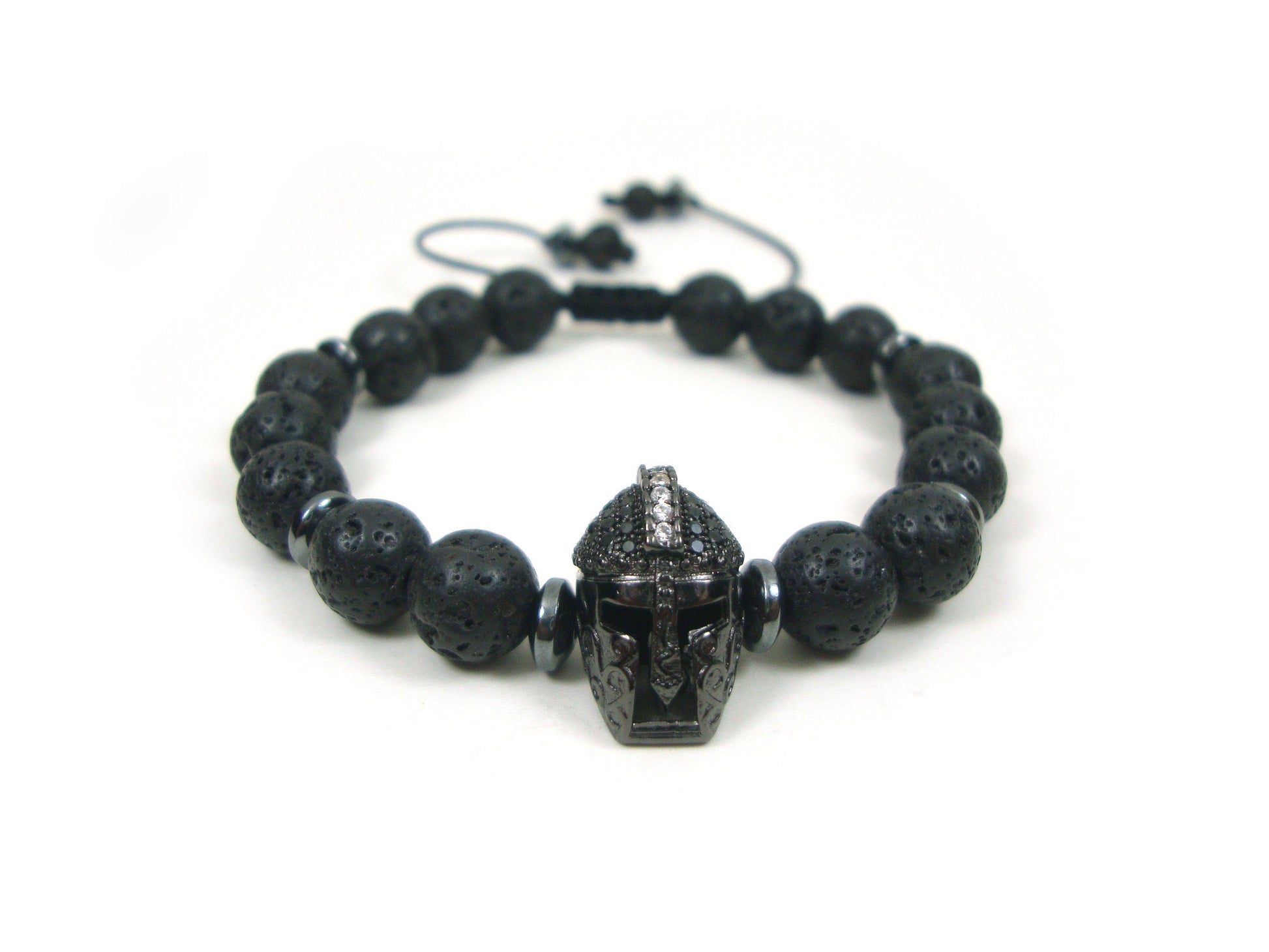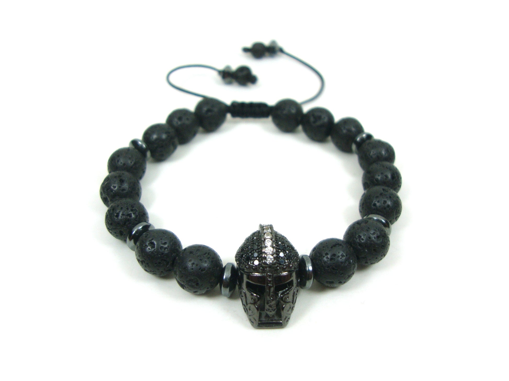 Greek Lava Spartan Warrior Helmet Adjustable Bracelet, Volcanic Lava Black Round Stones 8 mm Bracelet, Gladiator Helmet Adjustable Bracelet