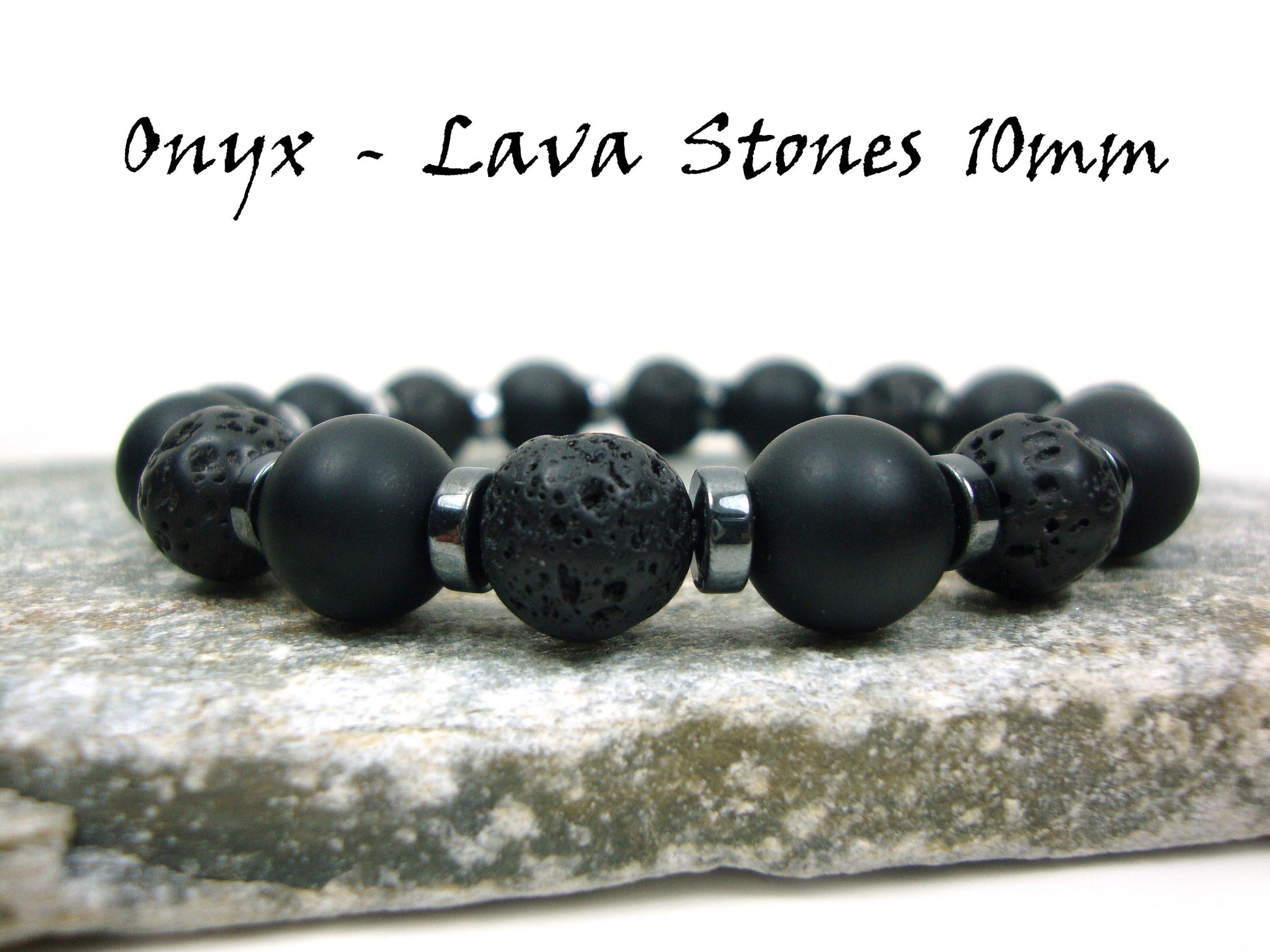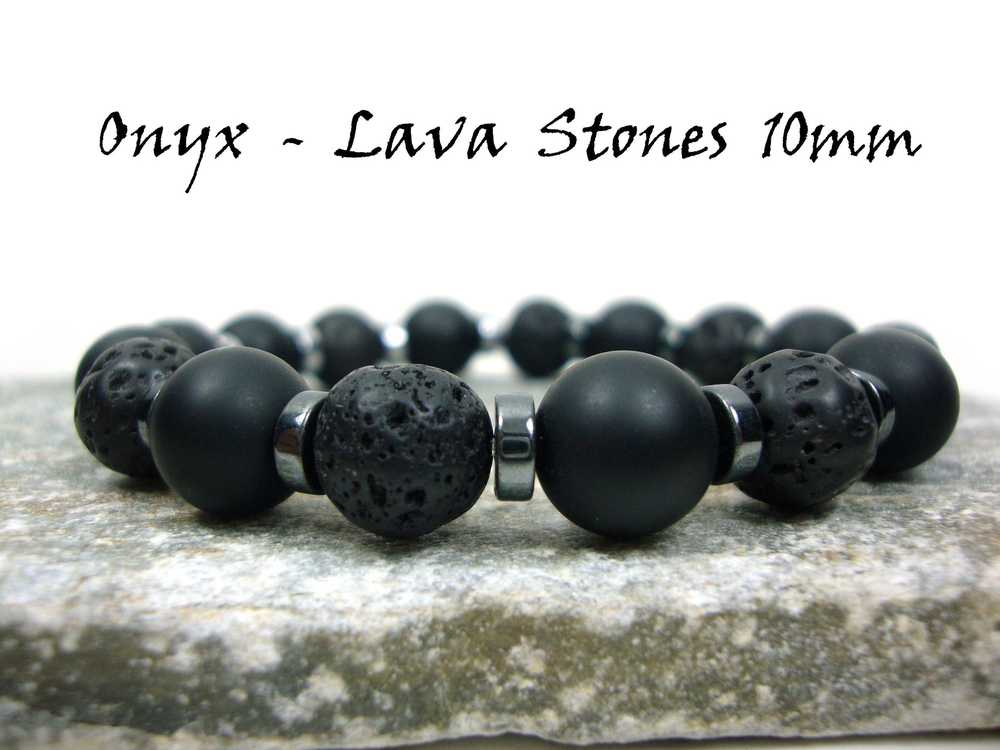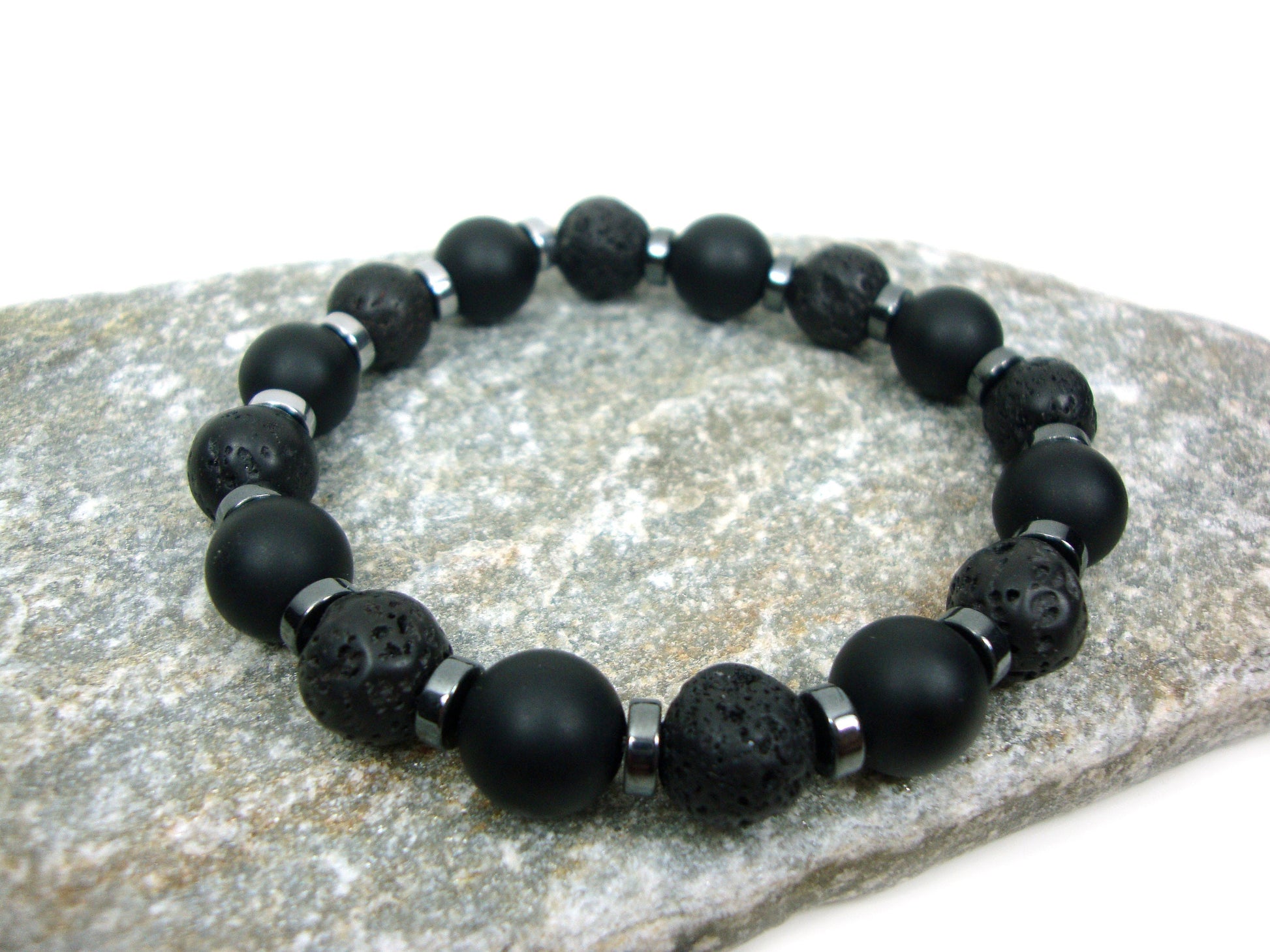 Natural Volacanic Santorini Greek Black Lava Stones, Black Matt Onyx Stones 10mm, Hematite Silver Color Stones Bracelet, Lava Bracelet
