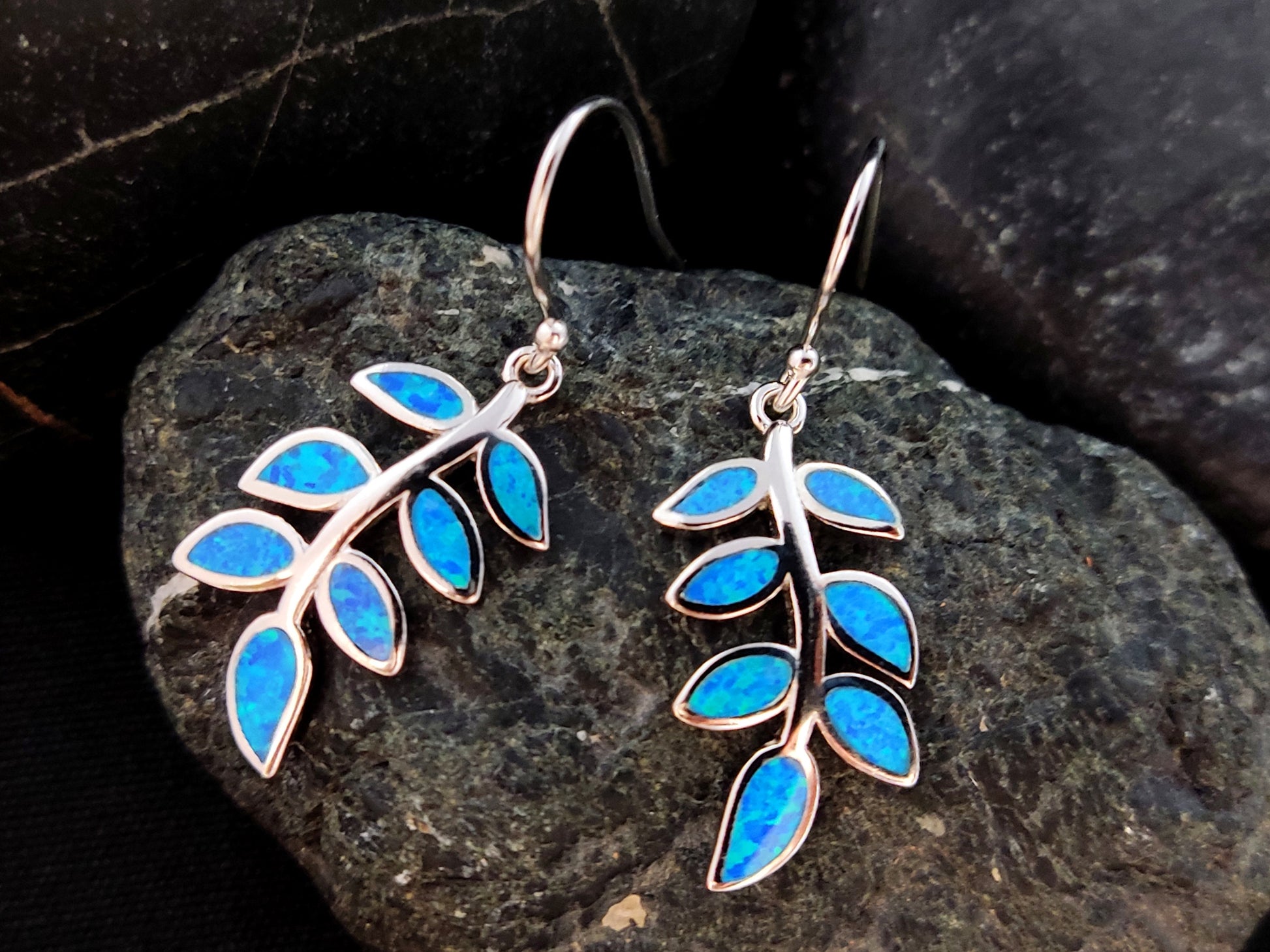 Sterling Silver 925 Greek Olive Leaf Leaves Blue Opal Dangle Earrings, Leaf Silver Earrings, Griechische Ohrringe, Bijoux Grecque, 25x12mm