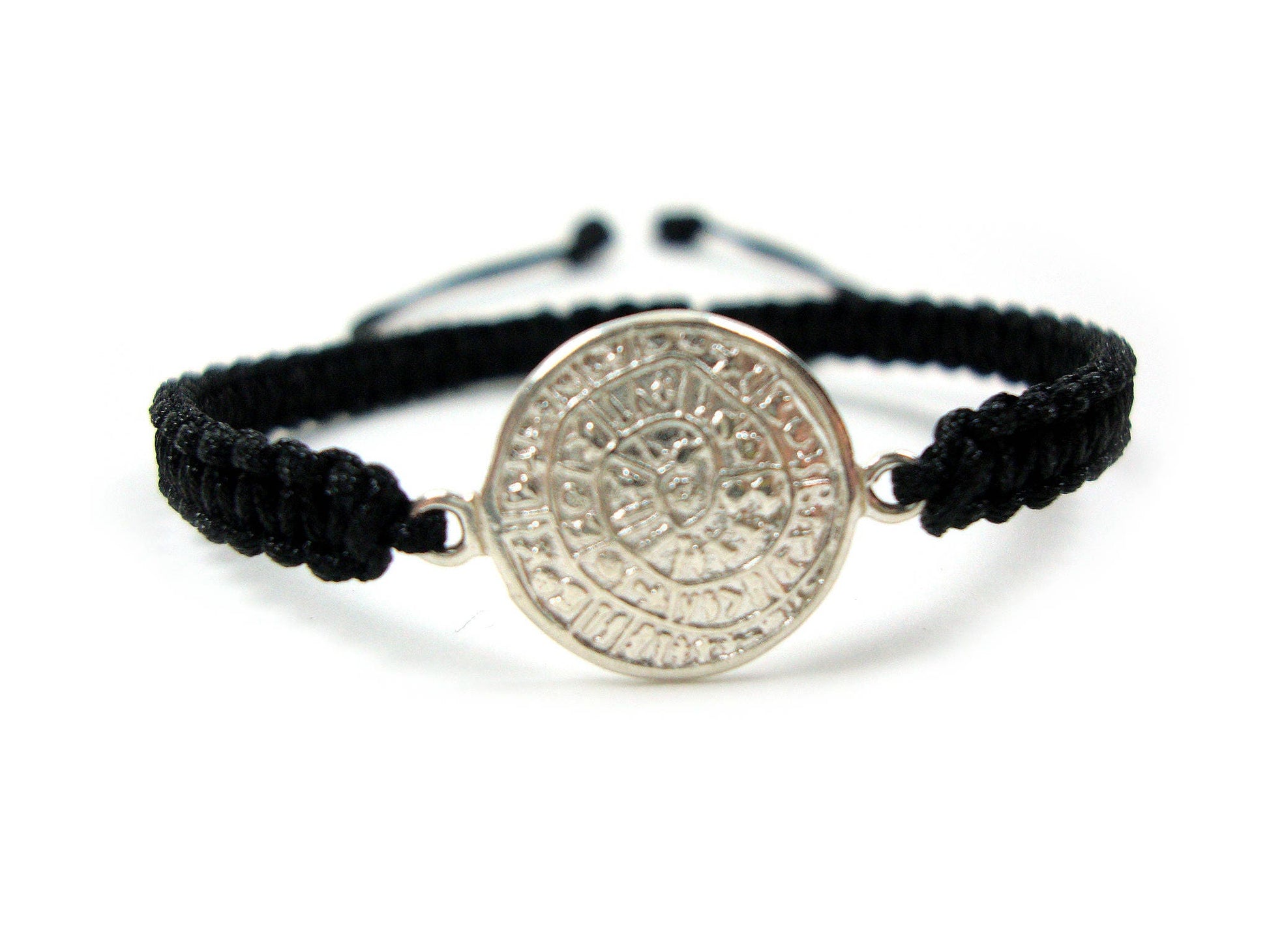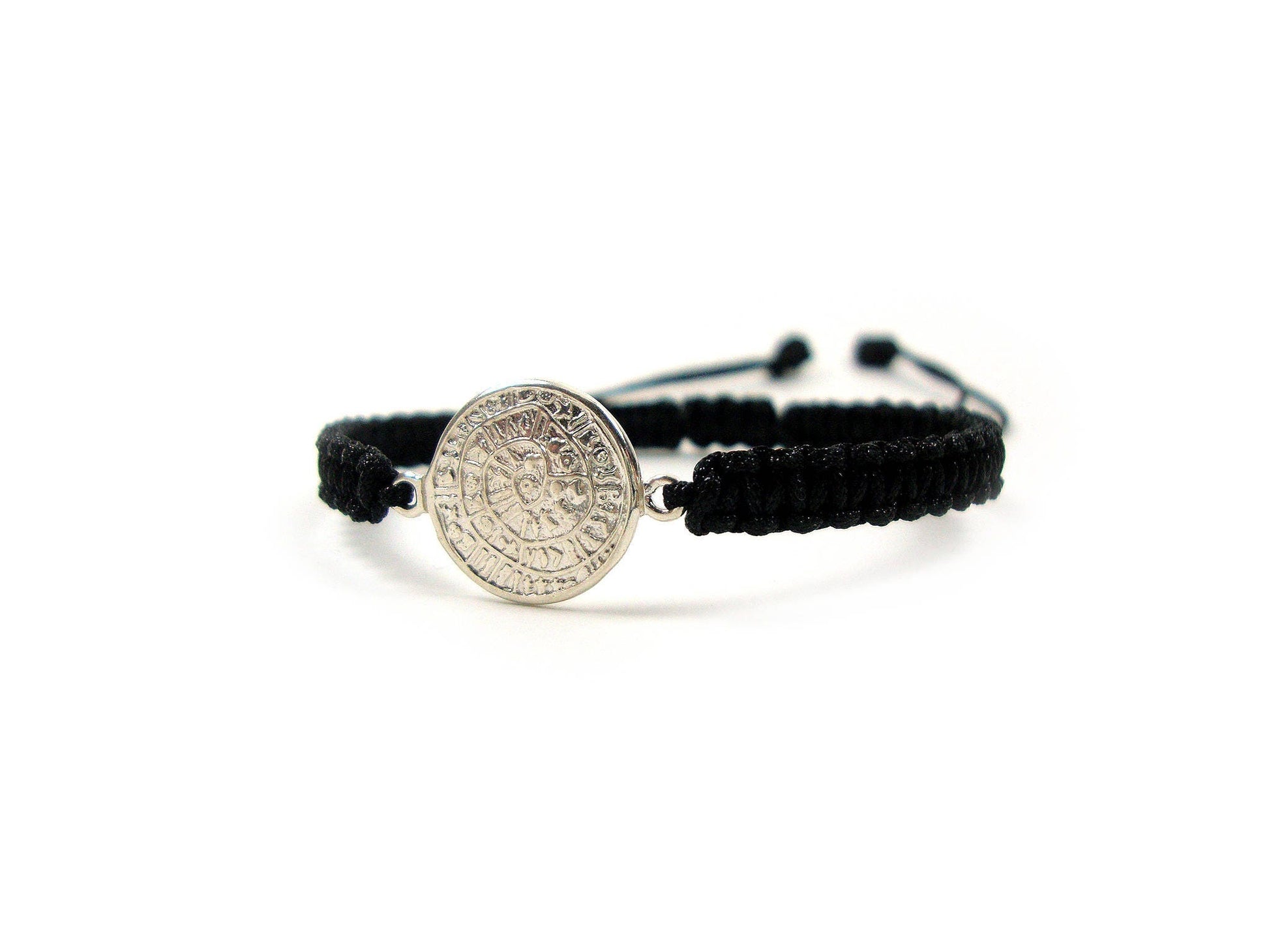 Sterling Silver 925 Ancient Greek Minoan Phaistos Disc 14 mm Macrame Adjustable Bracelet , Phaistos Disc Armband, Bijoux Grecque