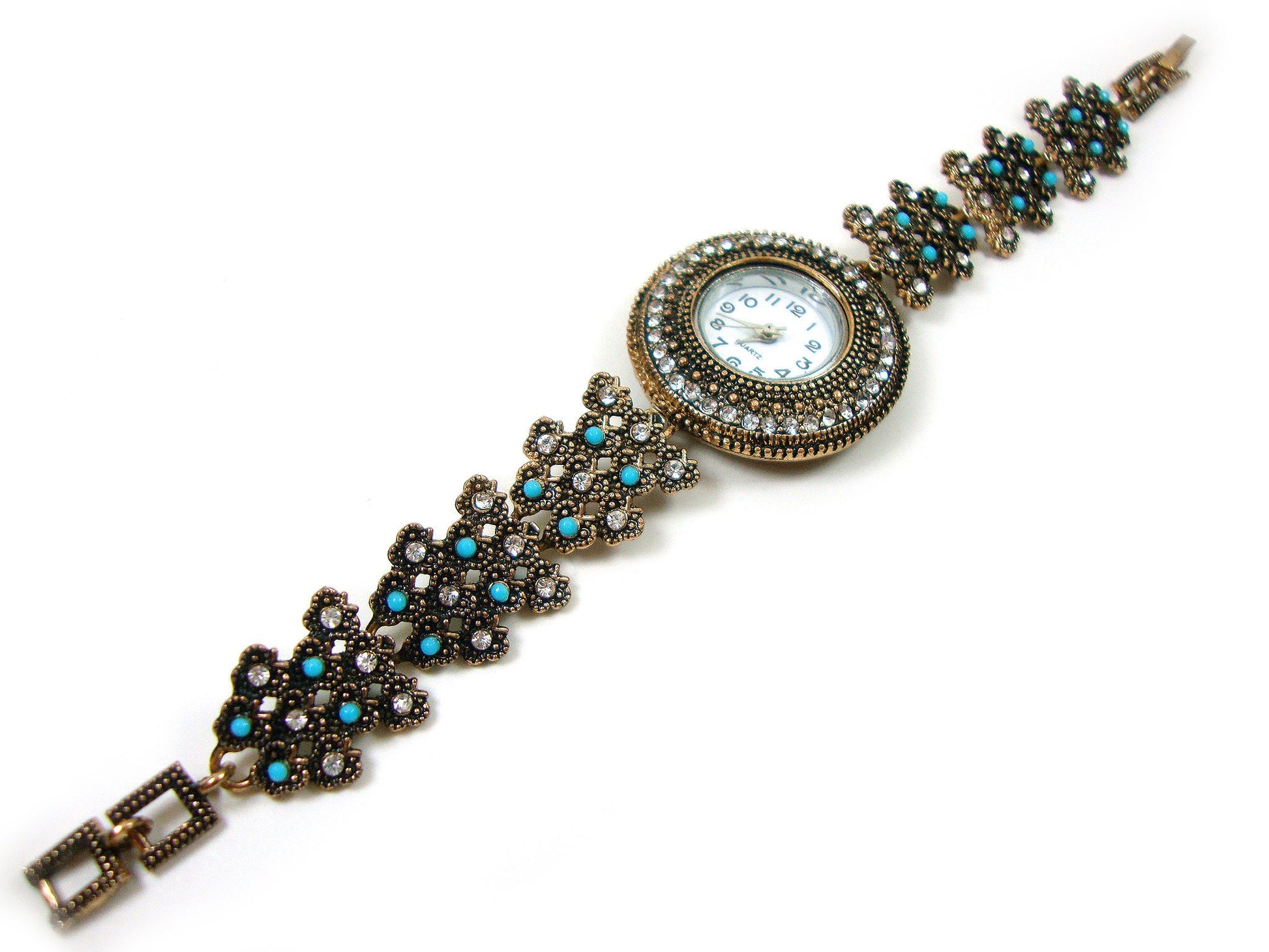 Greek Byzantine Modern Watch ,Blue Stones & Crystals Quartz Round Ethnic Watch, Turkish Bracelet Watch, Greek Jewelry, Greek Turkish Jewelry