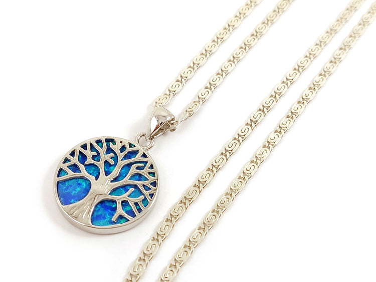 Sterling Silver 925 Fire Rainbow Blue Opal Tree Of Life Chain Pendant Necklace, Griechischer Opal Kette, Bijoux Grecque, Greek Jewelry