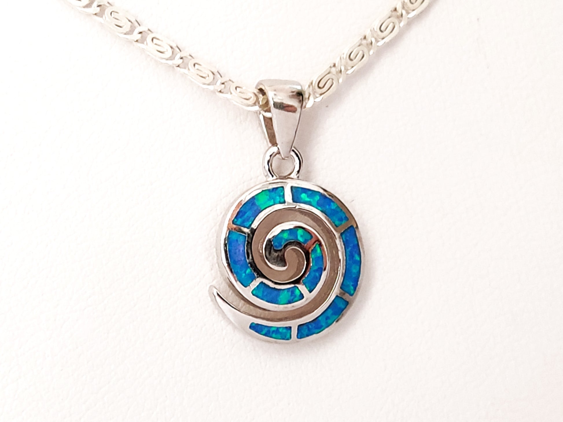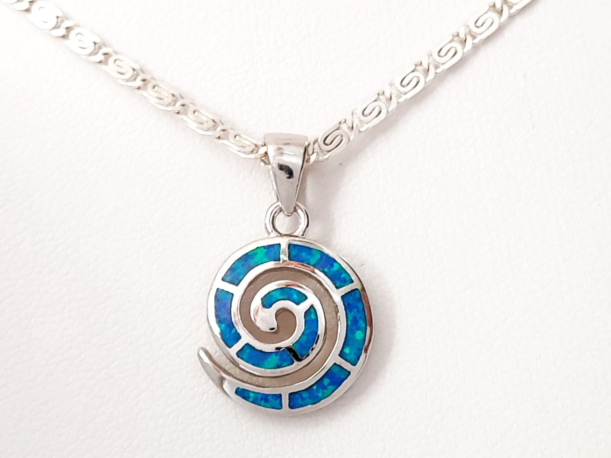 Greek Spiral Blue Opal Chain Silver Pendant 15mm Necklace