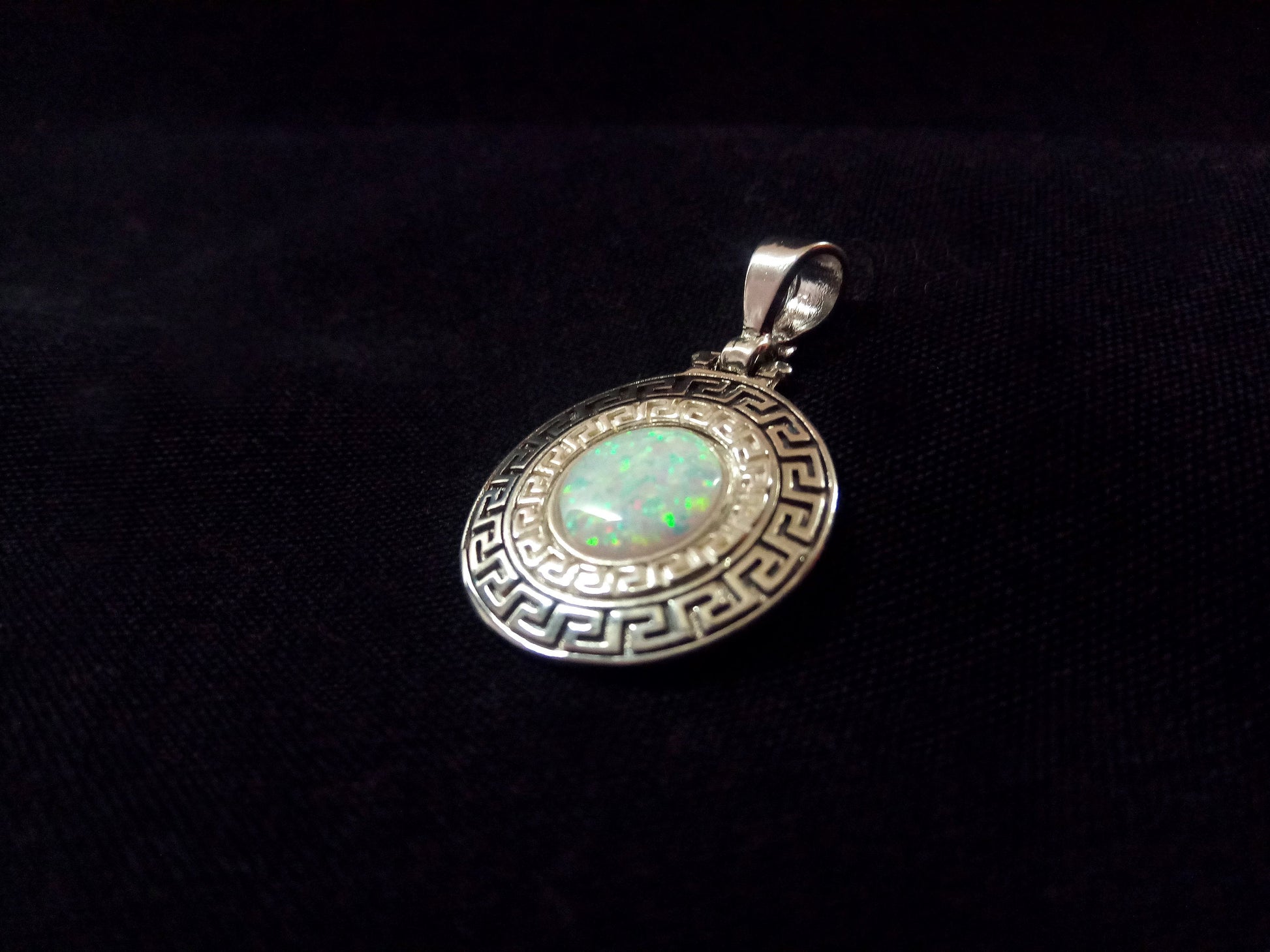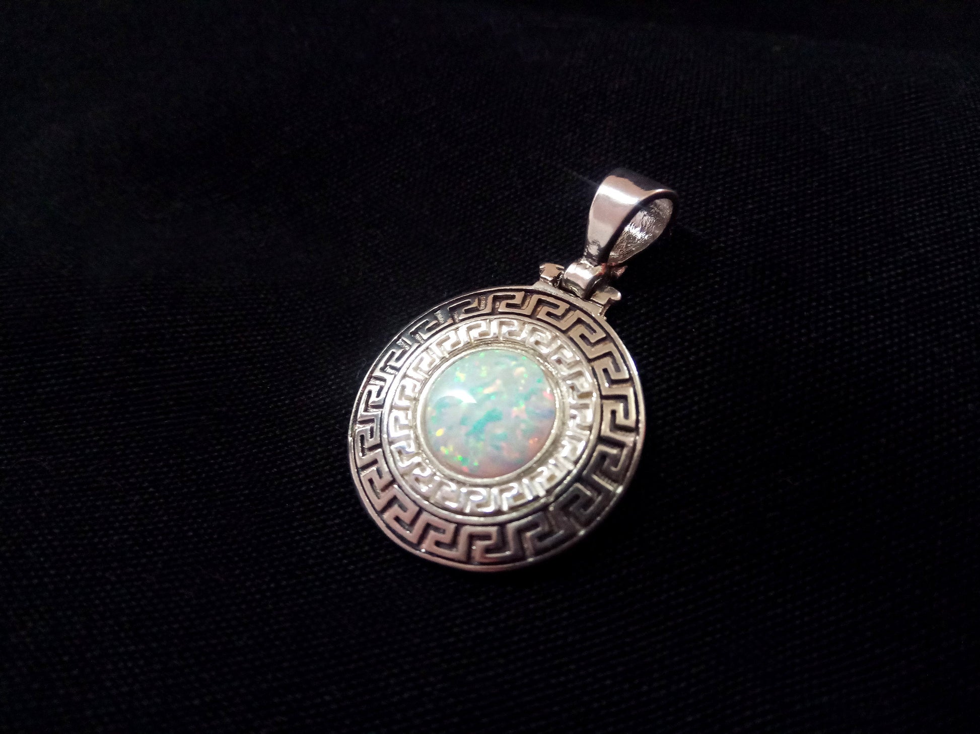 Sterling Silver 925 Fire Rainbow White Opal Greek Key Meander Round Shape Pendant 21mm, Ancient Greek Infinity Opal Pendant, Opal Stones