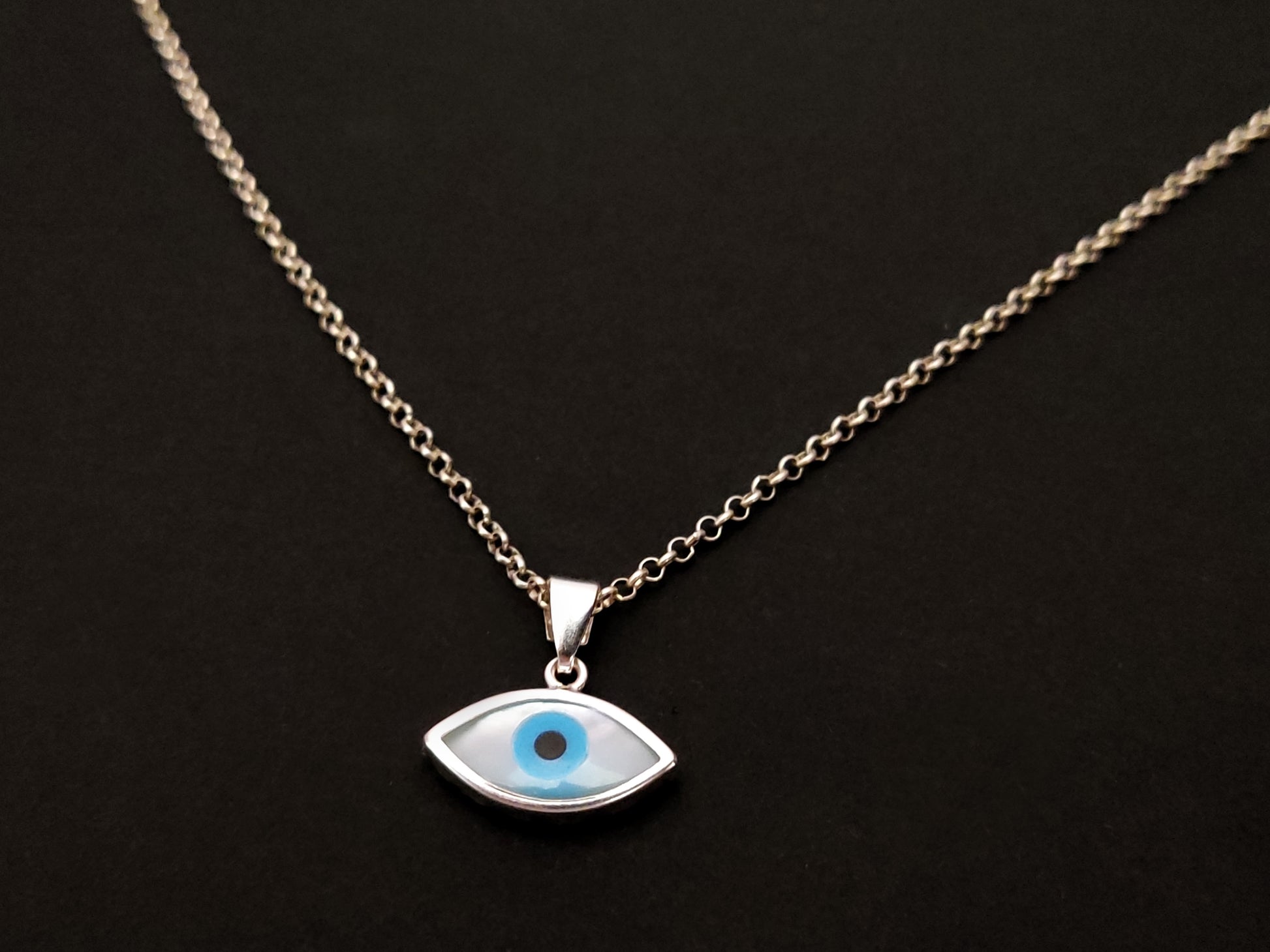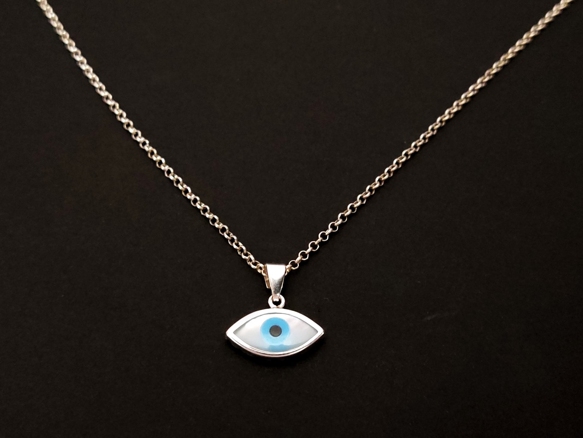 Greek Silver Mother of Pearl Evil Eye Pendant 7x14 Necklace