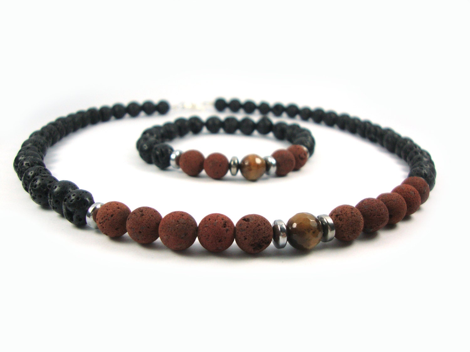 Santorini Jewelry Set Natural Black Volcanic Black & Brown Lava 8mm - Natural Tiger Eye 8mm, Lava Bracelet, Lava Necklace