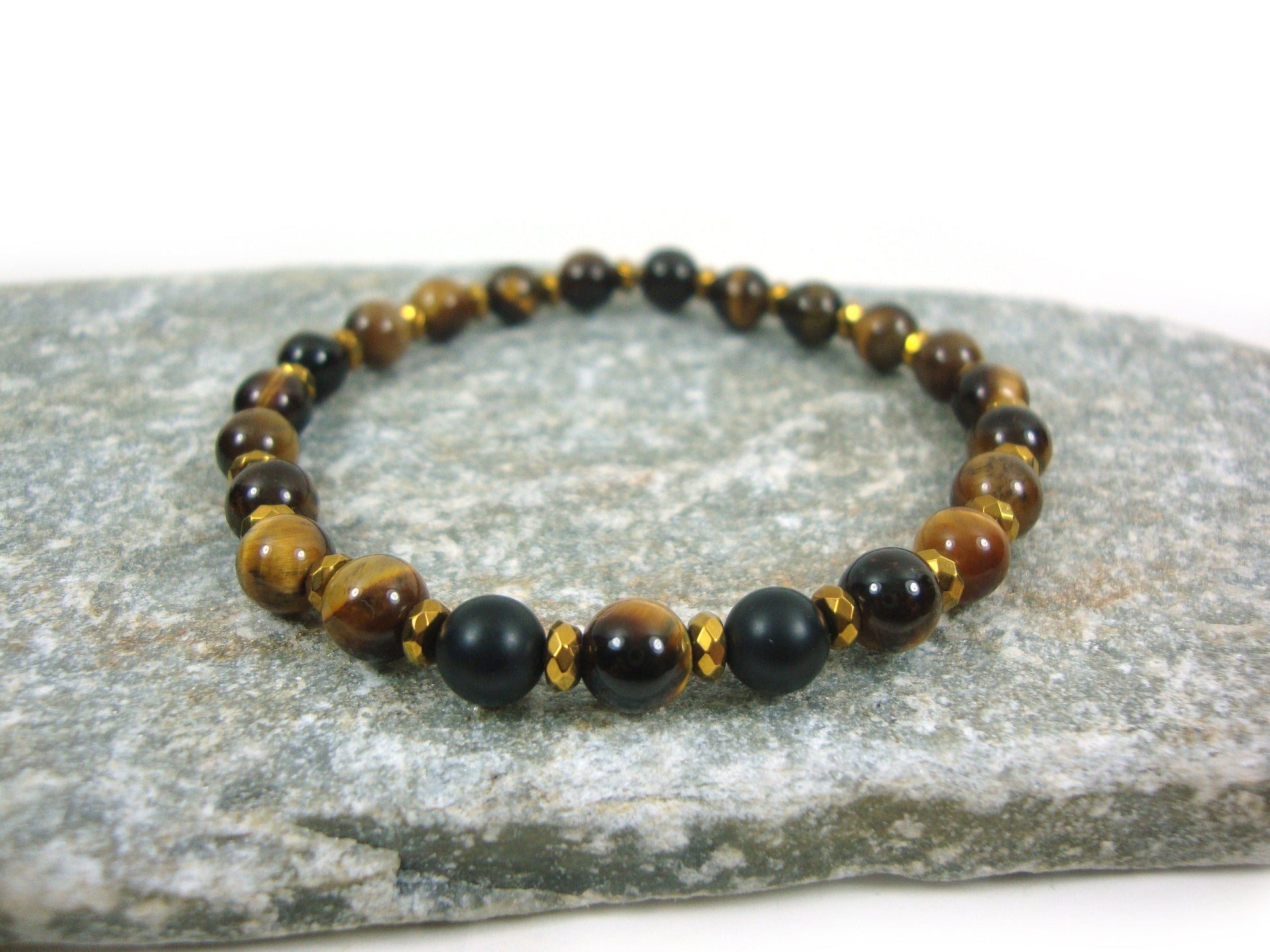 Natural Tiger Eye - Lava Stones 6mm - Gold Color Hematite Spacers Stretch Bracelet, Tiger Eye Bracelet, Tiger Eye Stones, Men Women Unisex