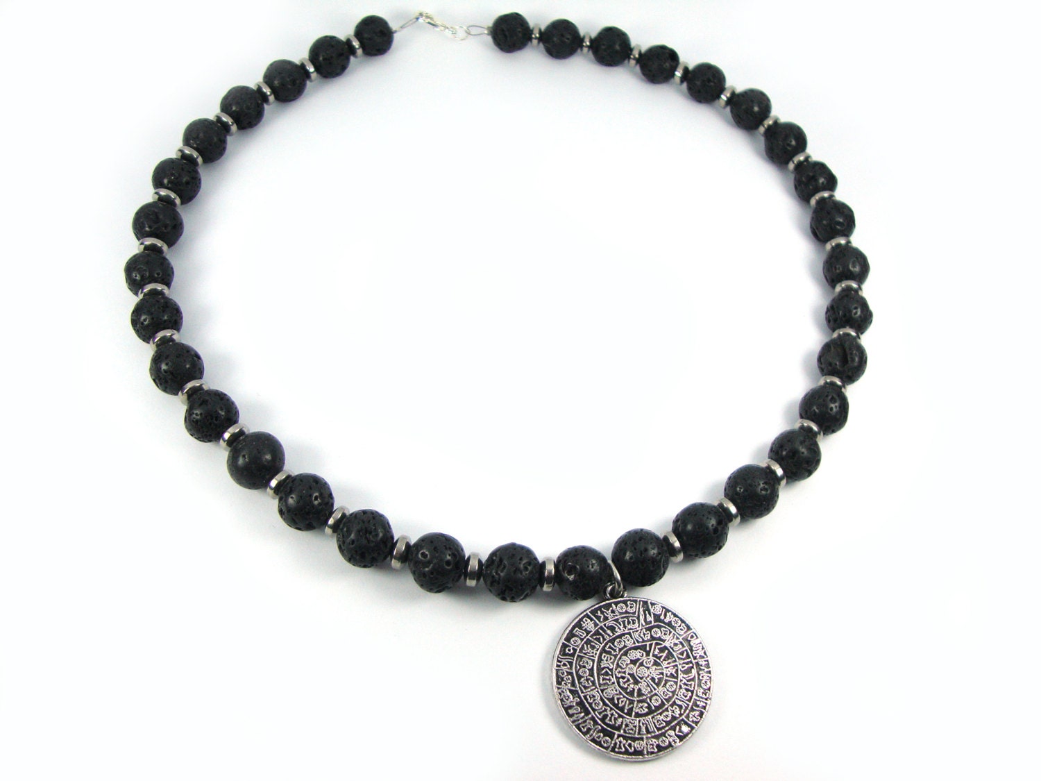 Santorini Greek Natural Black Volcanic Lava 10mm - Hematite - Sterling Silver 925 Phaistos Disc 30 mm Greek Lava Necklace, Greek Lava