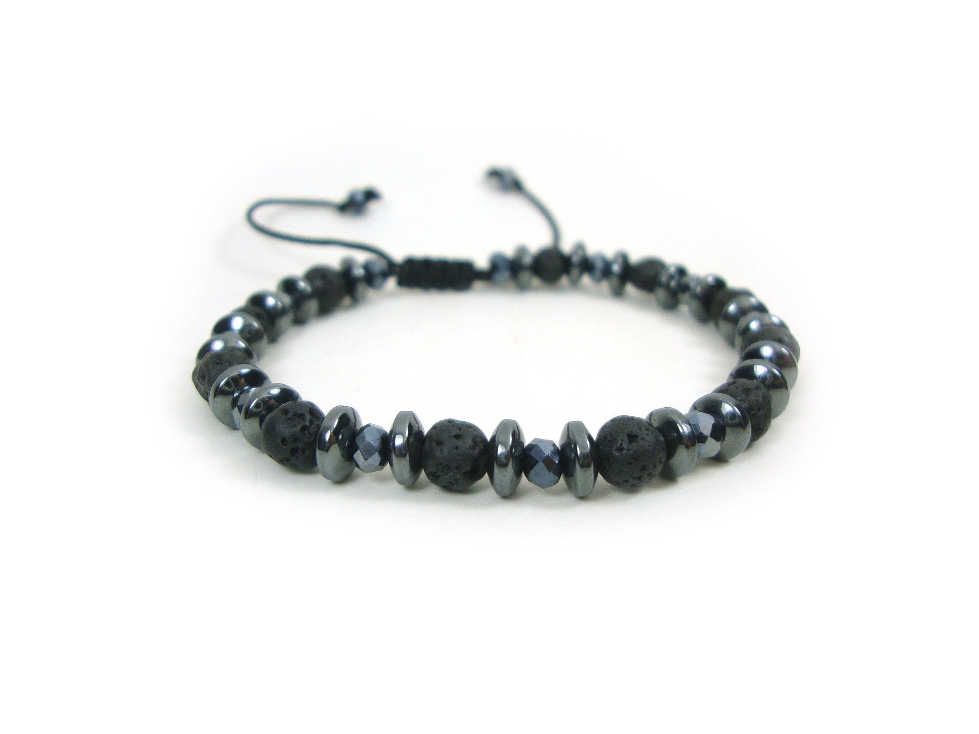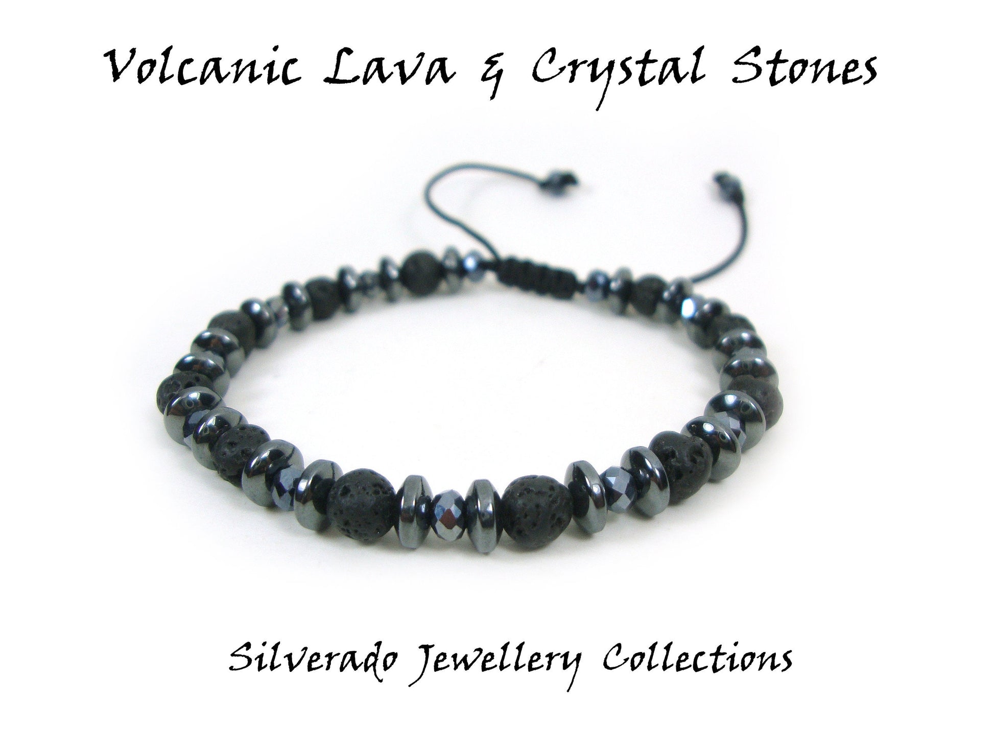 Volcanic Lava 6mm & Black Crystal 4mm Stones Gemstone Adjustable Bracelet, Men Women Unisex Bracelet, Black Round Lava Boho Macrame Bracelet