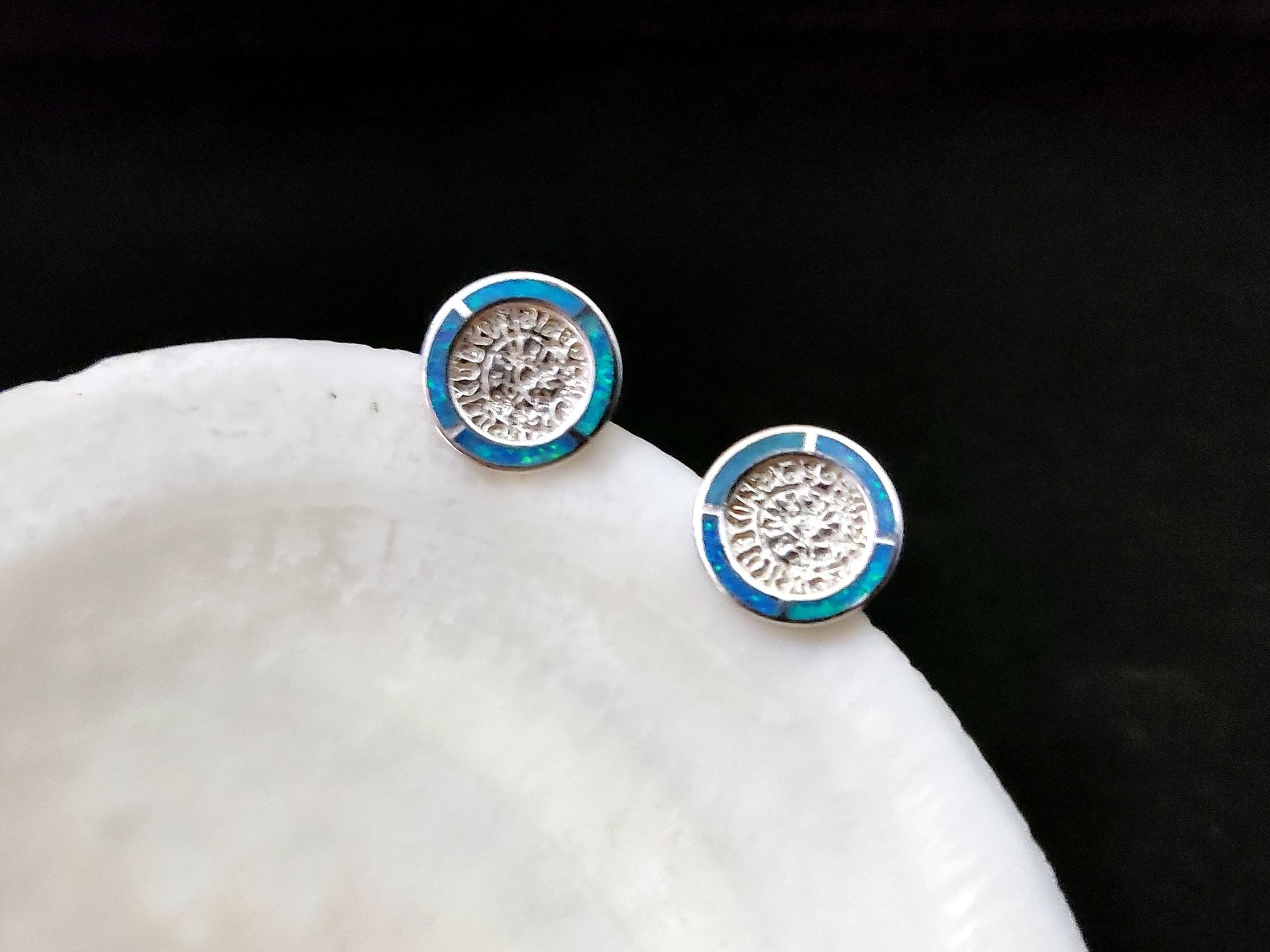 Introducing our exquisite Sterling Silver 925 Fire Blue Opal Stud Earrings, a true homage to the ancient Greek Minoan civilization and the legendary Phaistos Disc. These handcrafted earrings are a testament to timeless beauty and craftsmanship.
