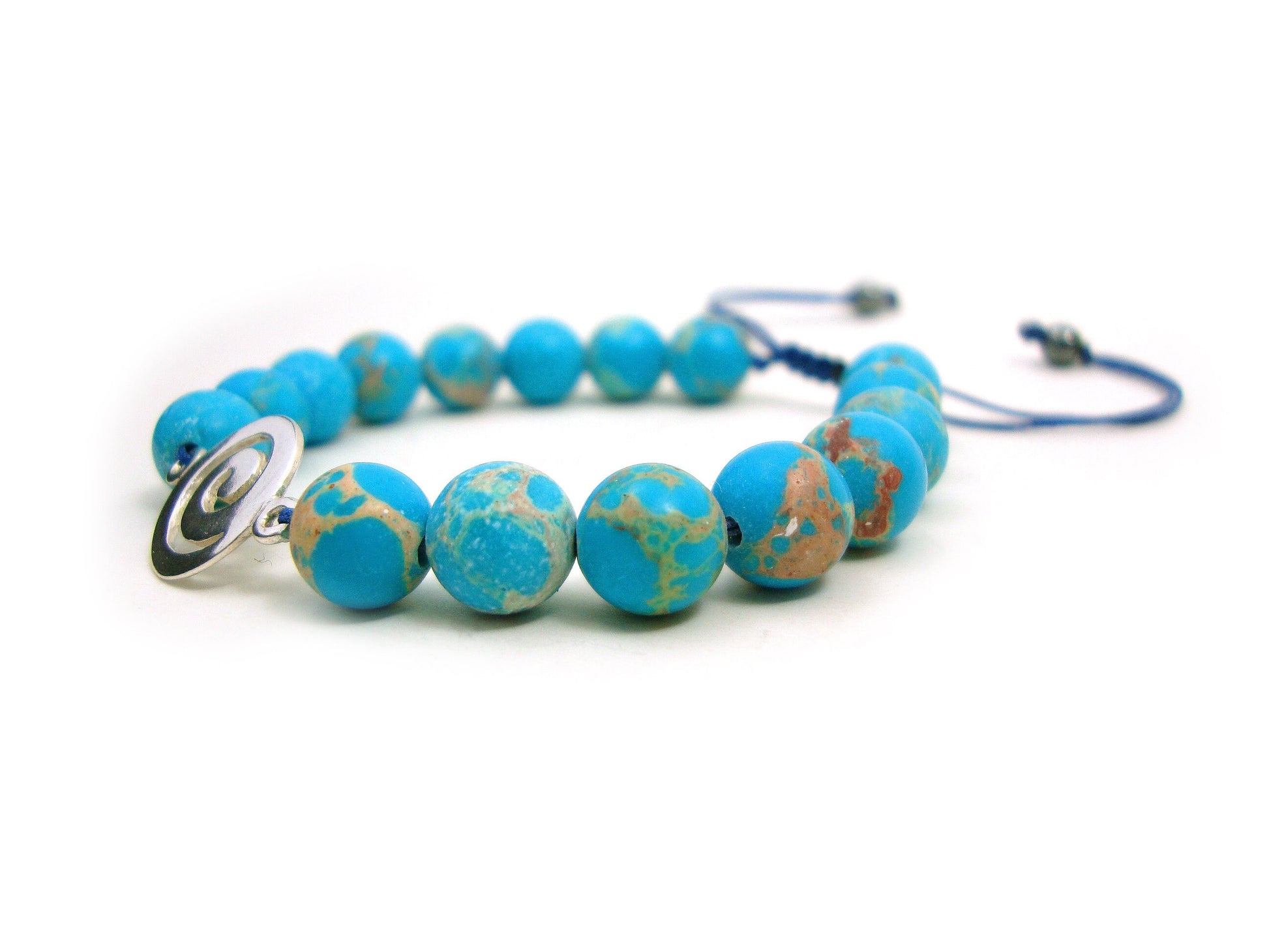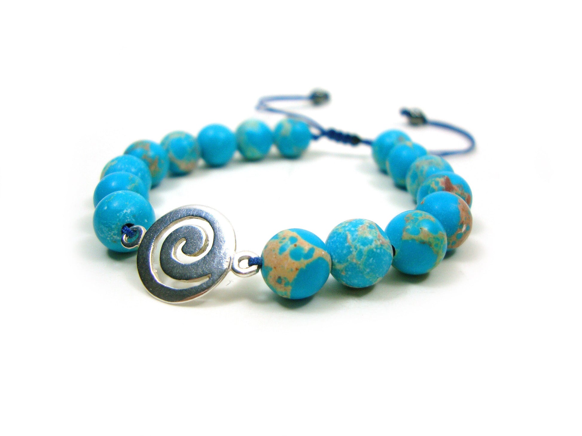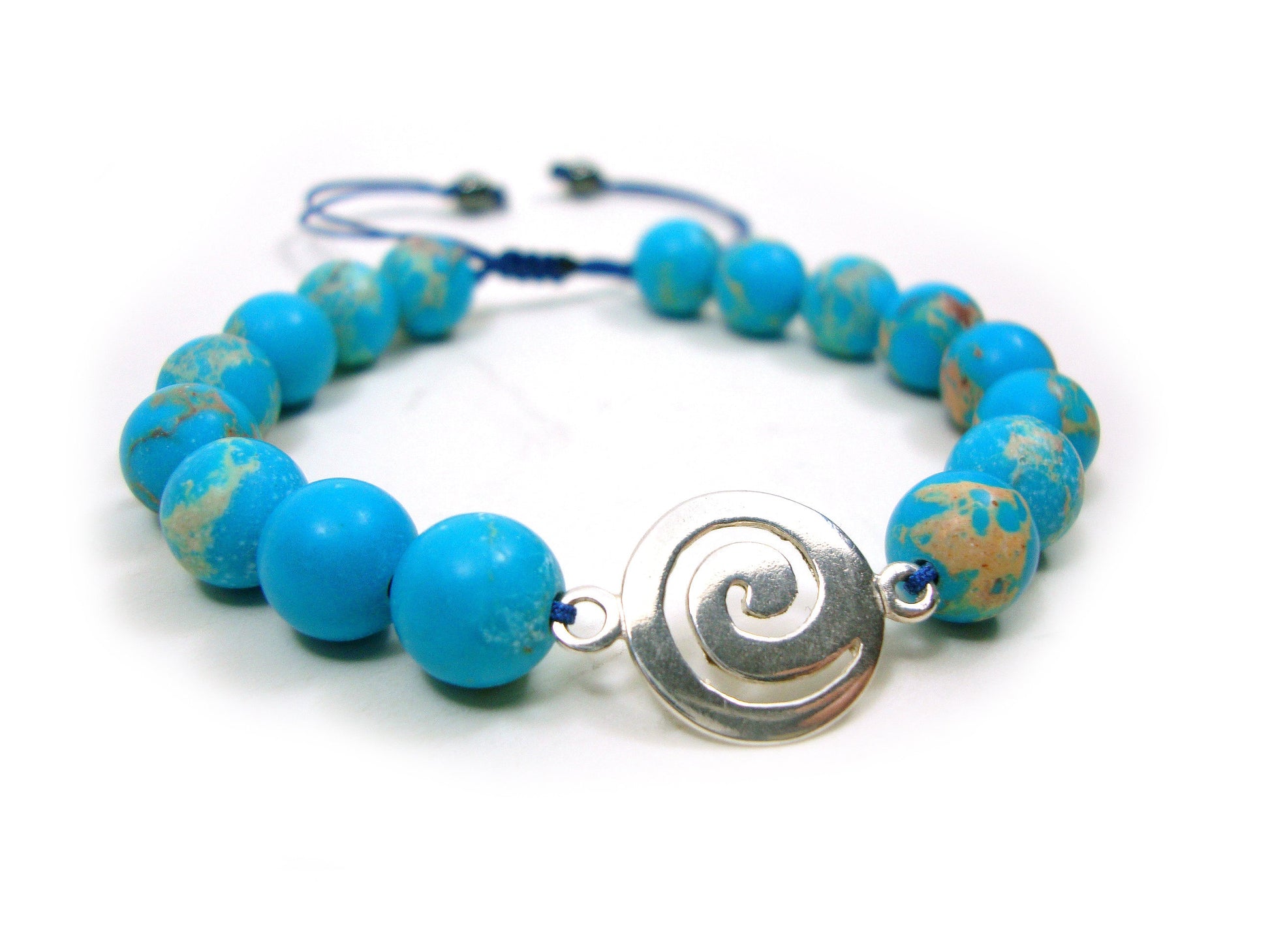 Sterling Silver 925 Ancient Greek Spiral Infinity Key & Earth Blue Natural Agate Stones 8mm Macrame Bracelet, Agate Stein Armband