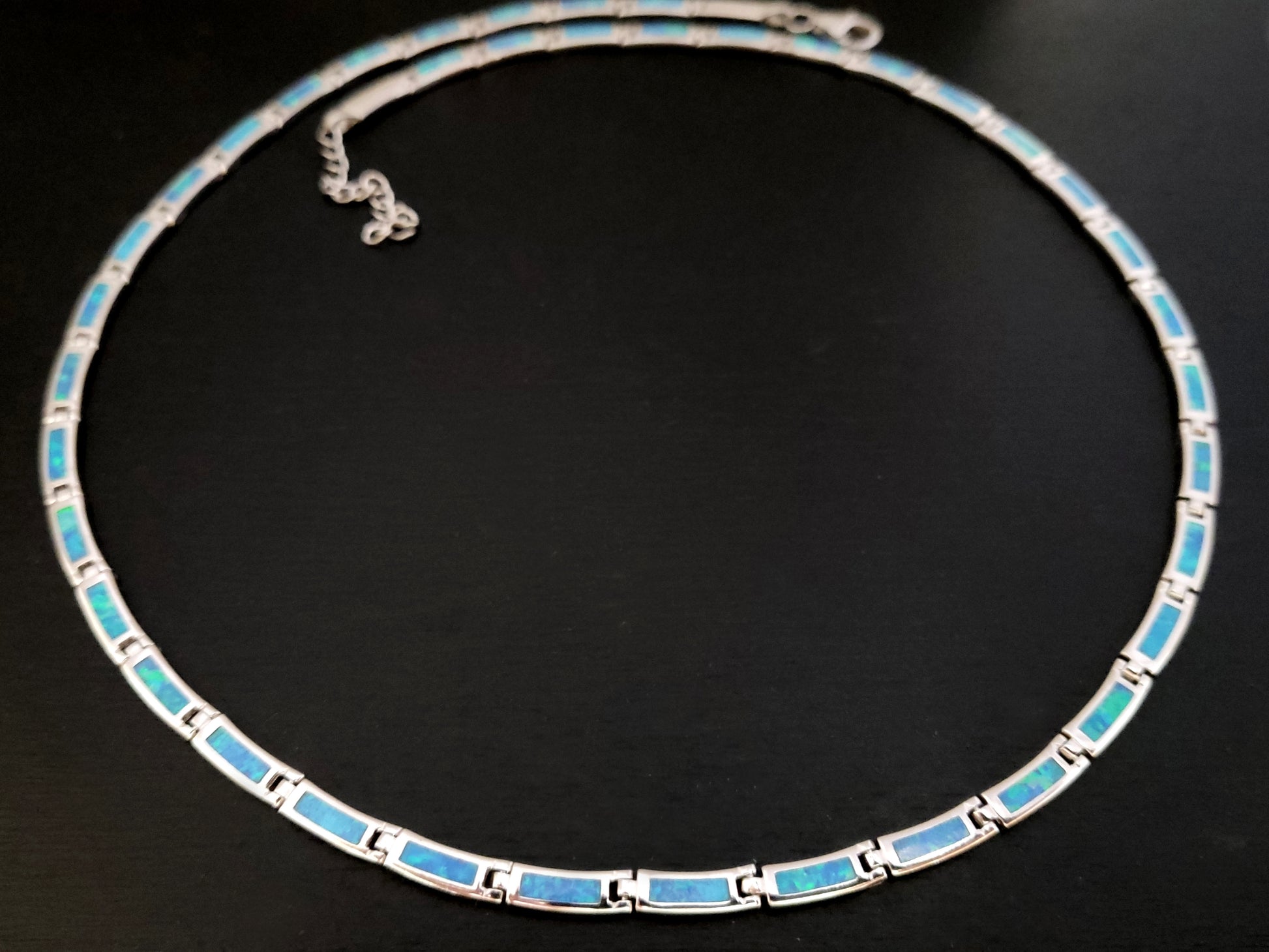 This stylish and elegant silver necklace is made of Sterling Silver 925 with blue opal stones. A beautiful piece of jewelry that can be used at any time of the day without any restrictions.