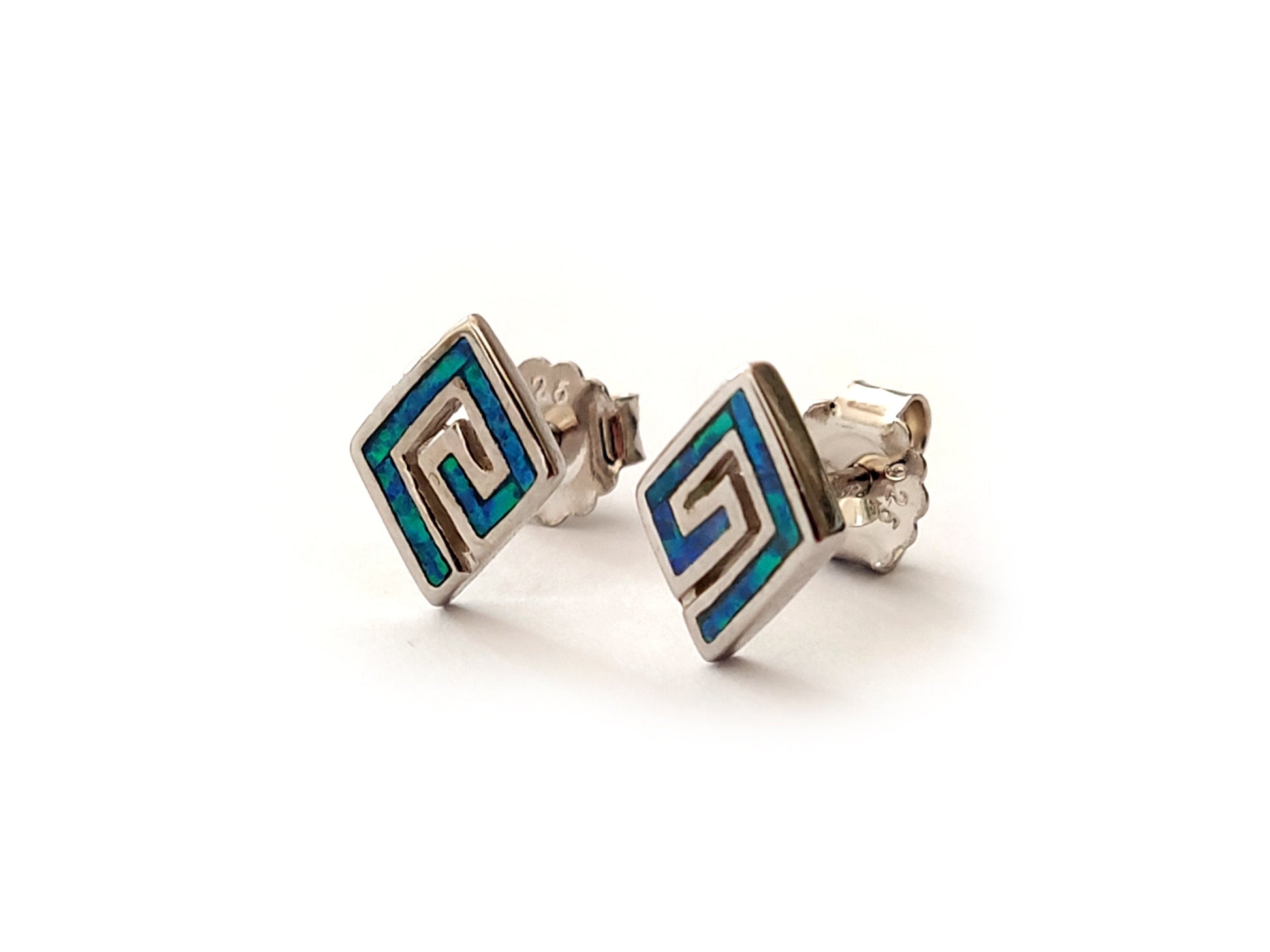 Greek Opal Earrings, Square Earrings, Small Earrings 10x7mm, Sterling Silver 925, Greek Key Opal Jewelry, Greek Jewelry, Round Earrings