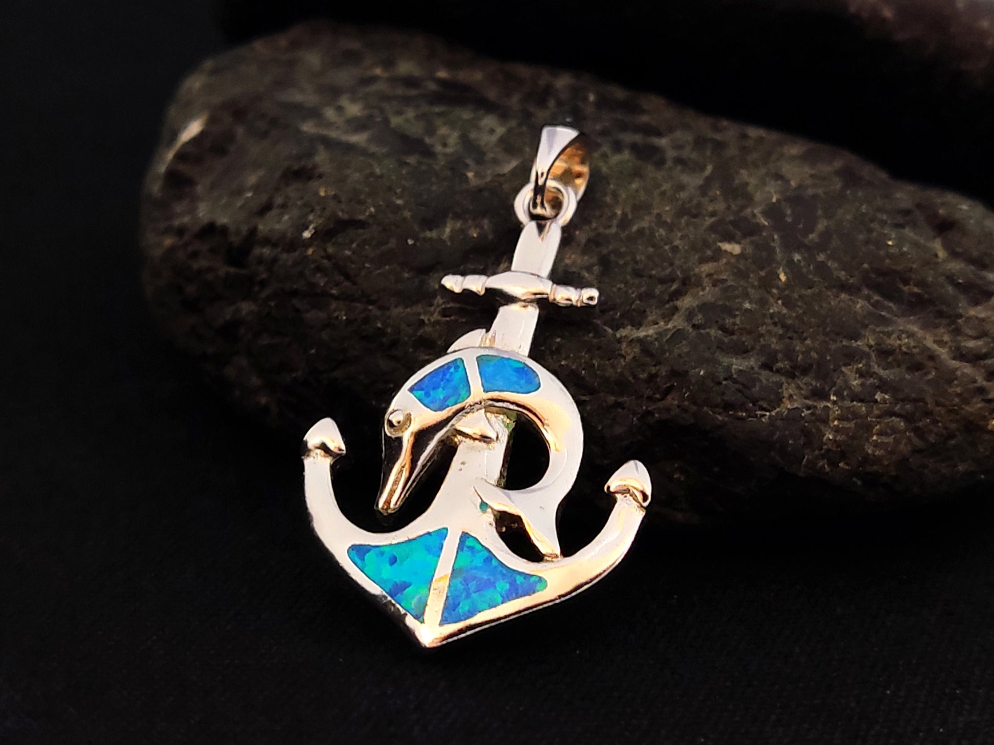 Sterling Silver 925 Blue Opal Anchor Dolphin Greek Pendant 30x19mm, Opal Stones, Greek Jewelry, Griechisches Opal Anhanger, Minoan Grec