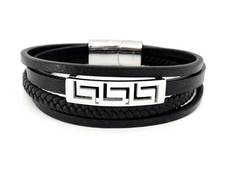 Greek Key Stainless Steel Leather Bracelet Gold Plated Meander