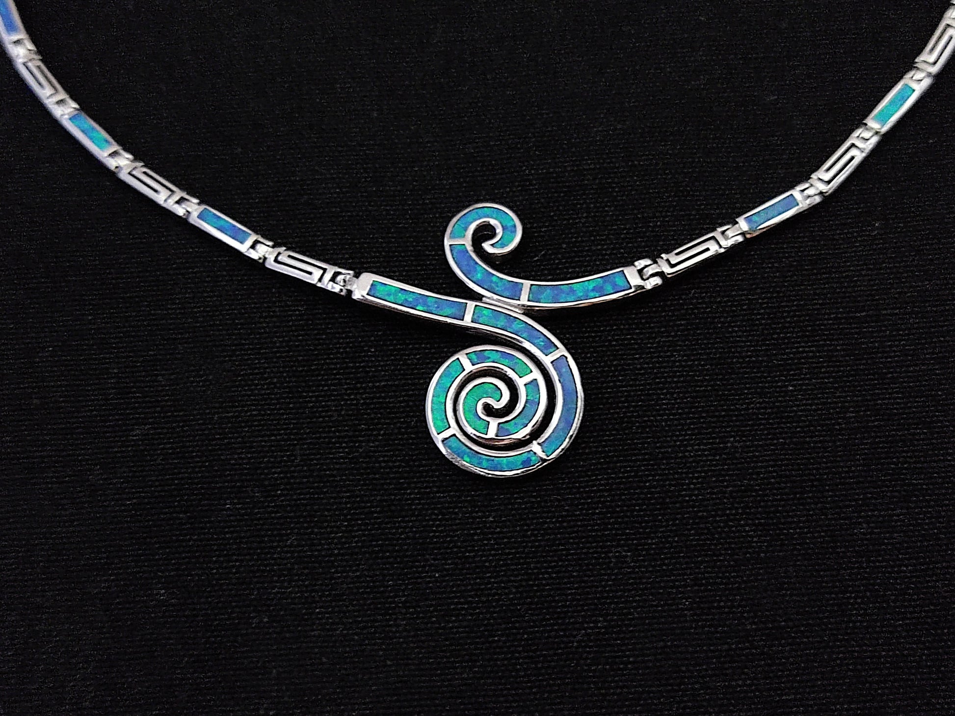 Sterling Silver 925 Fire Rainbow Blue Opal Greek Double Spiral Wave Necklace ,Griechischer Opal Silber Kette, Bijoux Grecque, Greek Jewelry