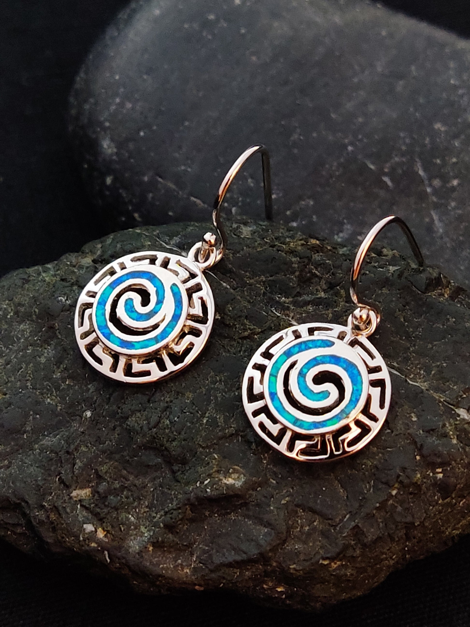Sterling Silver 925 Greek Key Circle Of Life Spiral Meander Blue Opal Dangle Earrings 14mm, Griechischer Blau Opal Ohrringe, Bijoux Grecque
