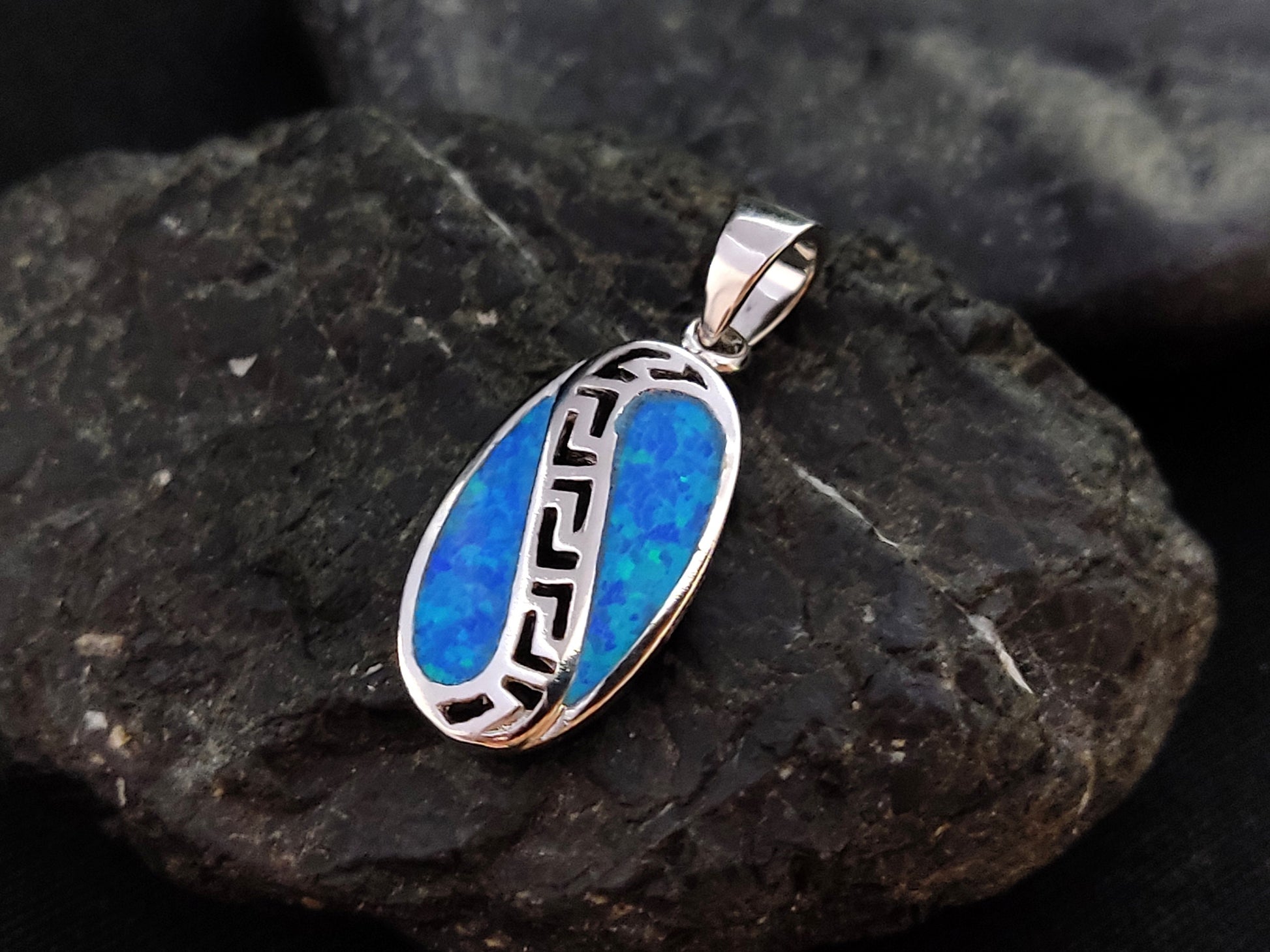 Sterling Silver 925 Oval Fire Rainbow Blue Opal 11x20mm, Greek Key Meander Pendant, Griechisches Silber Herz Anhanger Seestern Schmuck