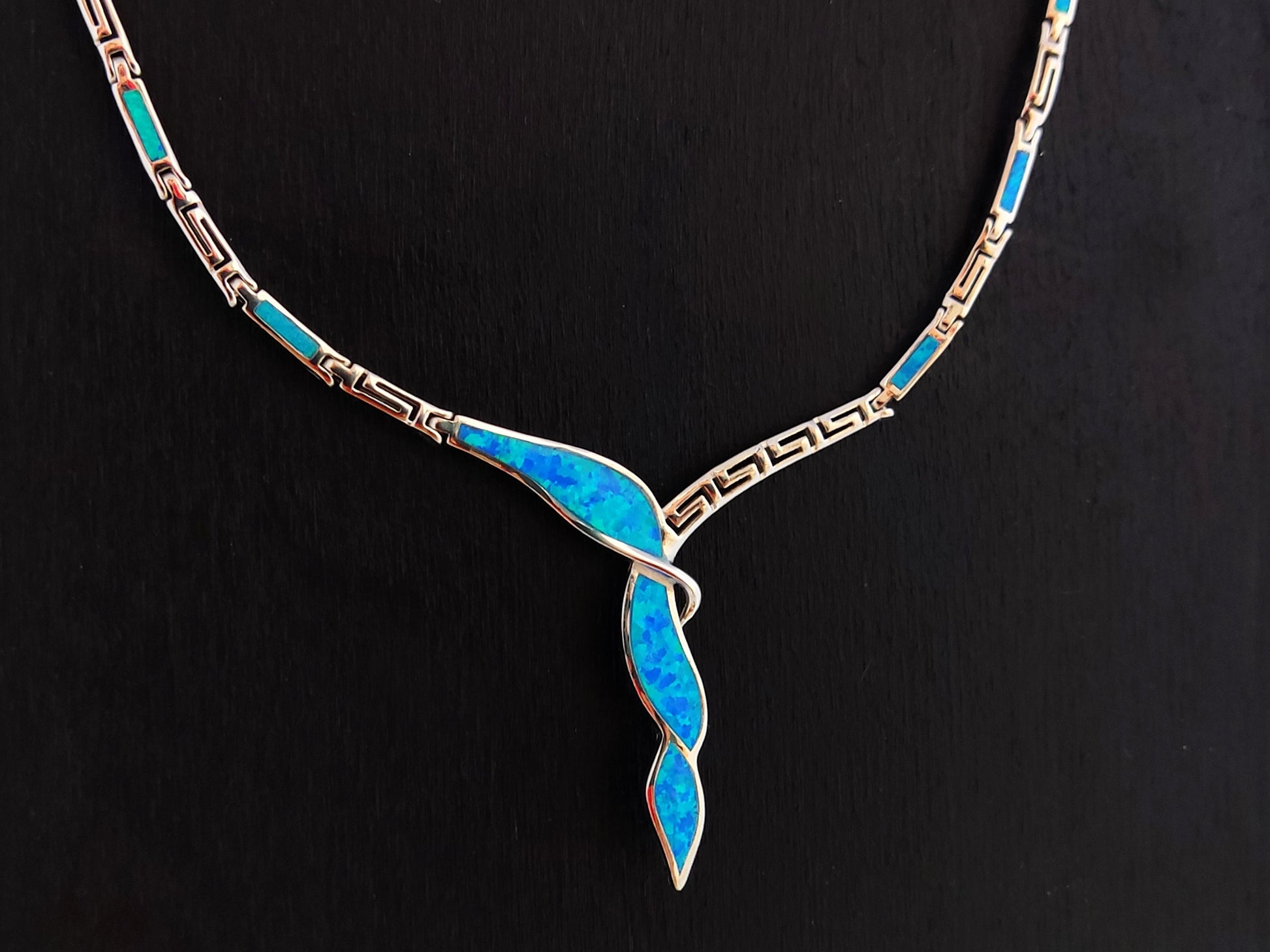 Silver Greek Opal Necklace, Blue Opal Greek Key Weaved Meander Necklace ,Griechischer Opal Silber Kette, Bijoux Grecque, Greek Jewelry