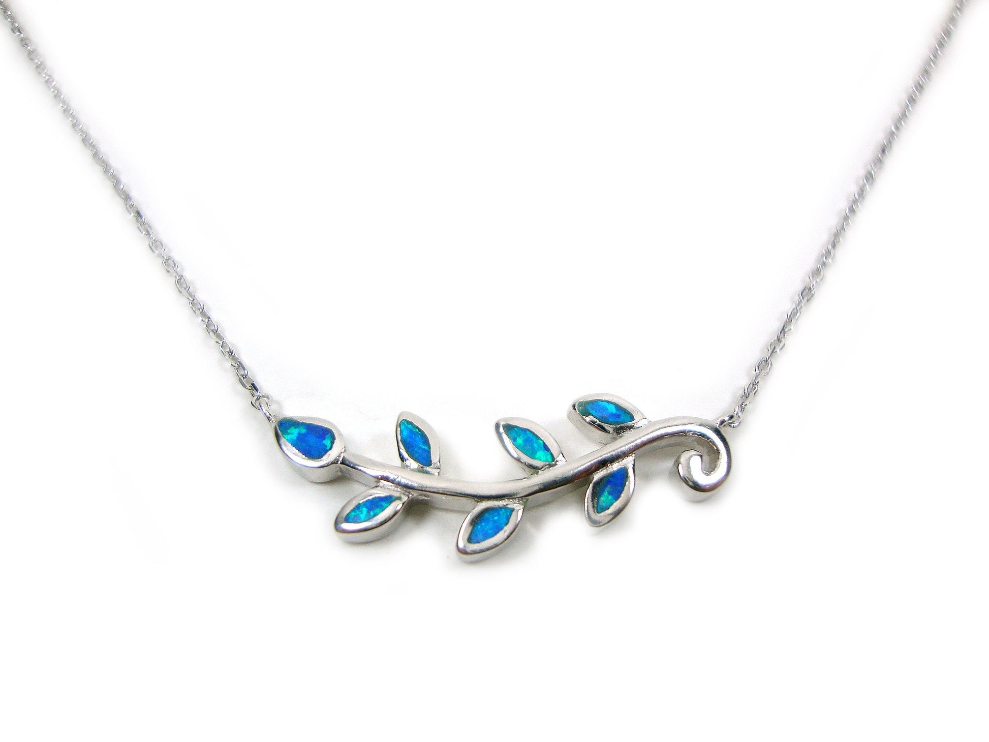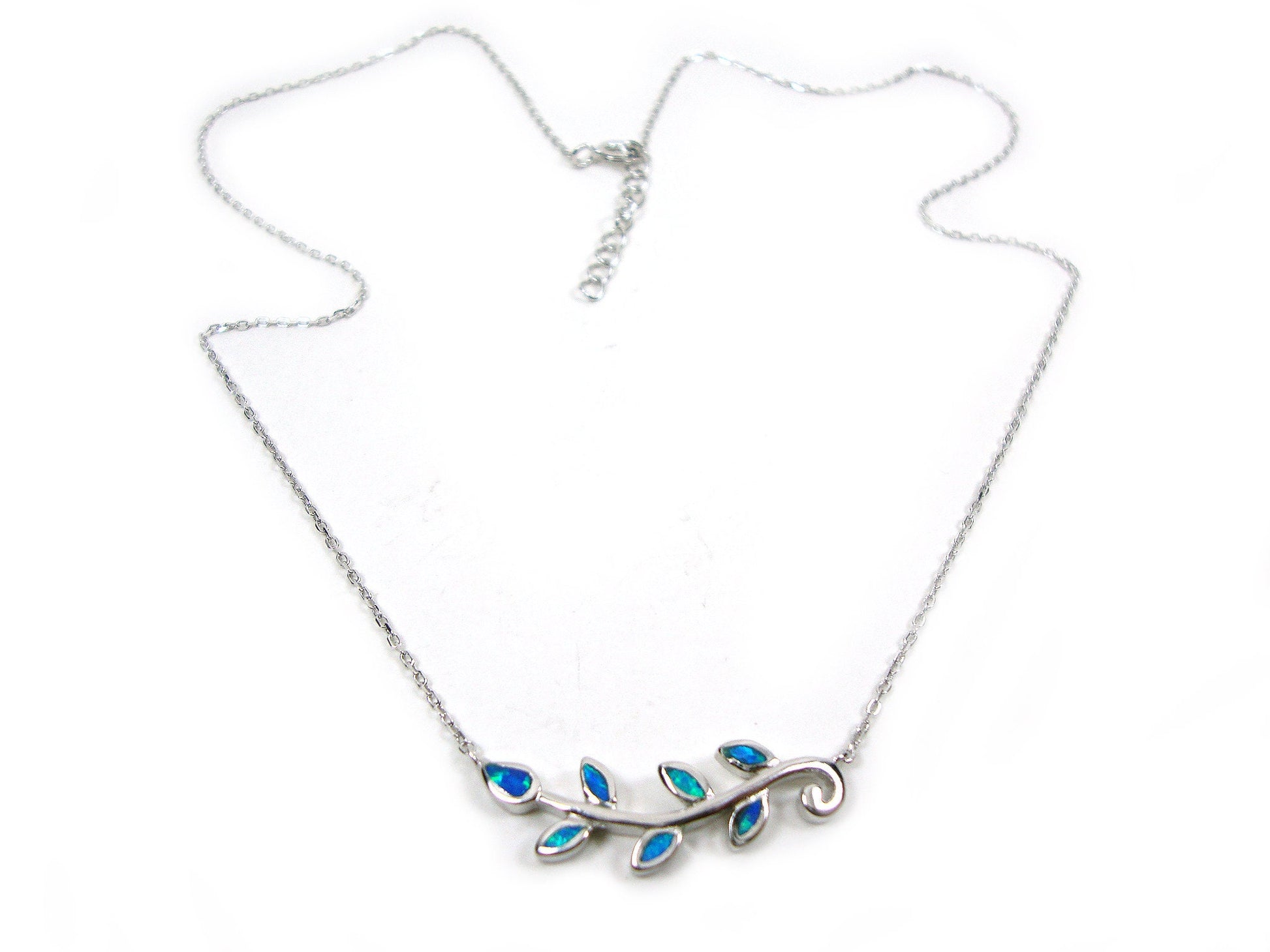 Sterling Silver 925 Blue Opal Greek Olive Leaves Pendant & Chain Necklace, Ancient Greek Leaf leaves Opal Pendant, Olive Leaves Necklace