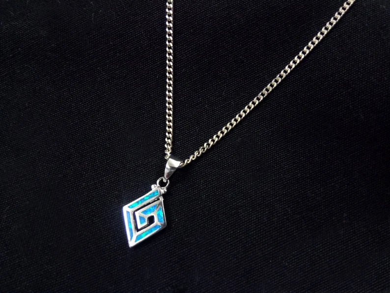Sterling Silver 925 Fire Rainbow Blue Opal Greek Meander Diamond Shape Pendant 13x16mm