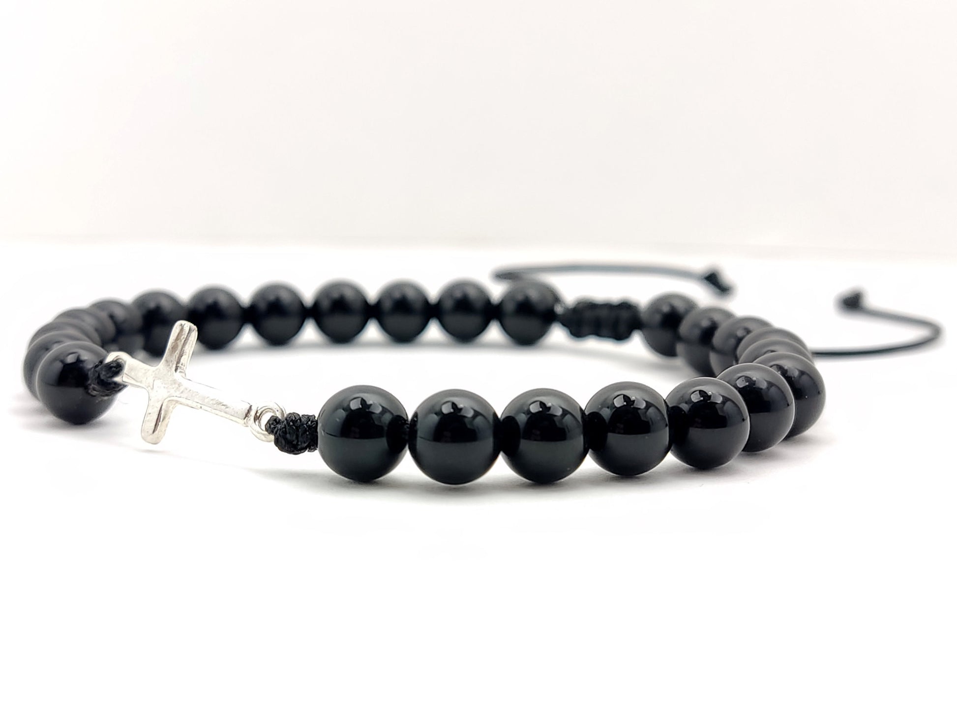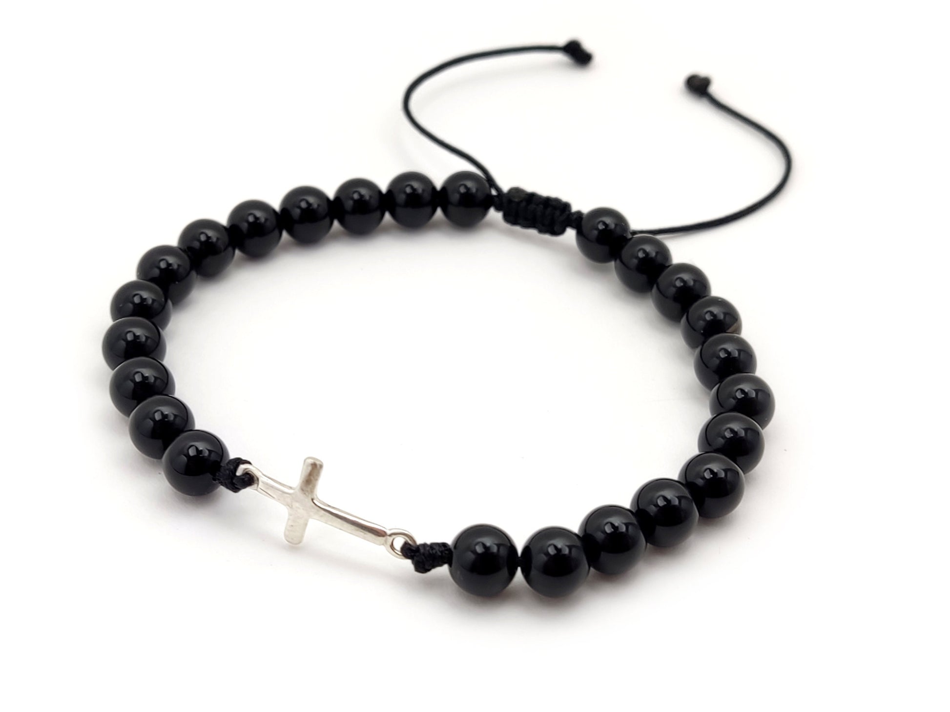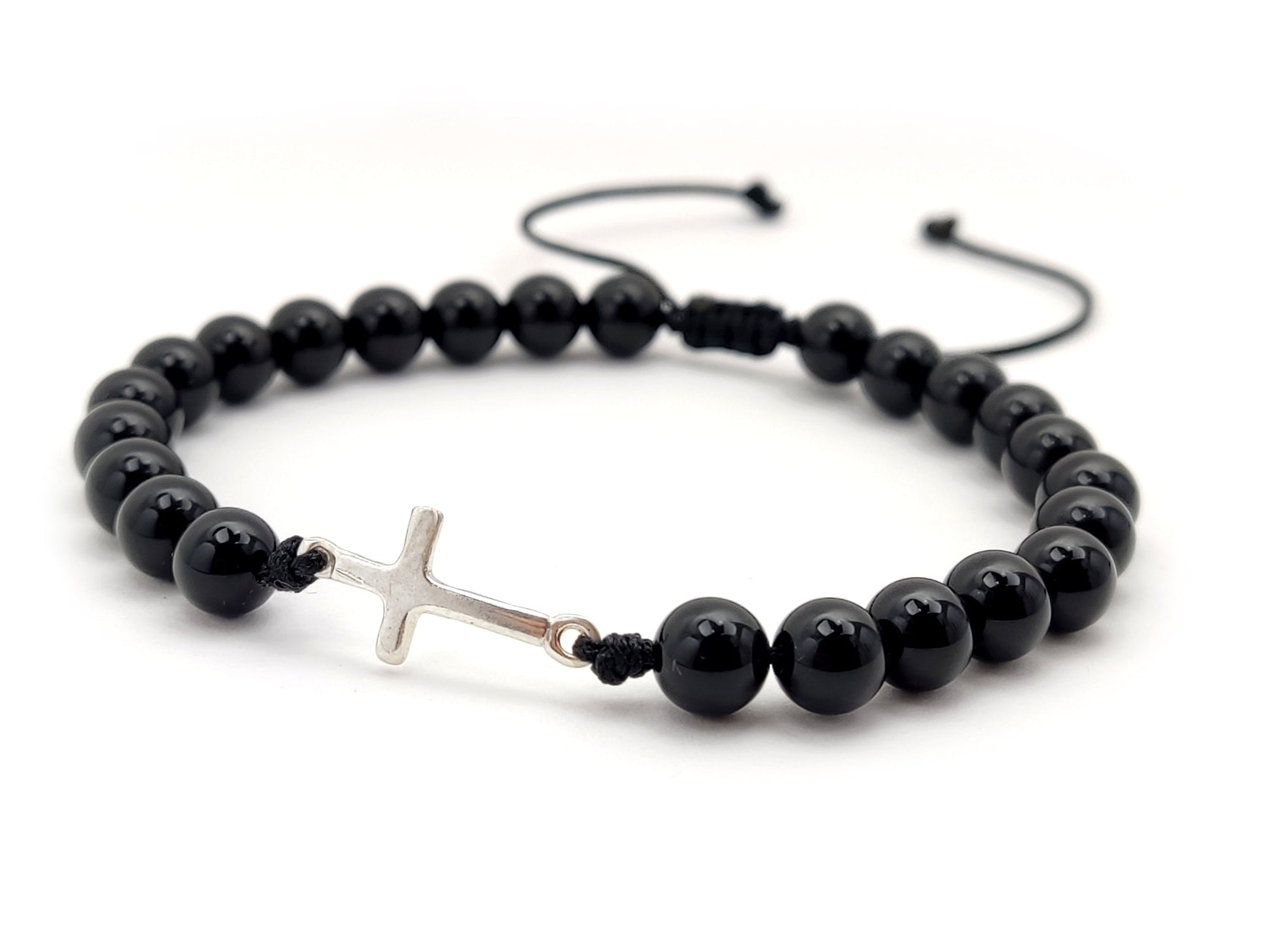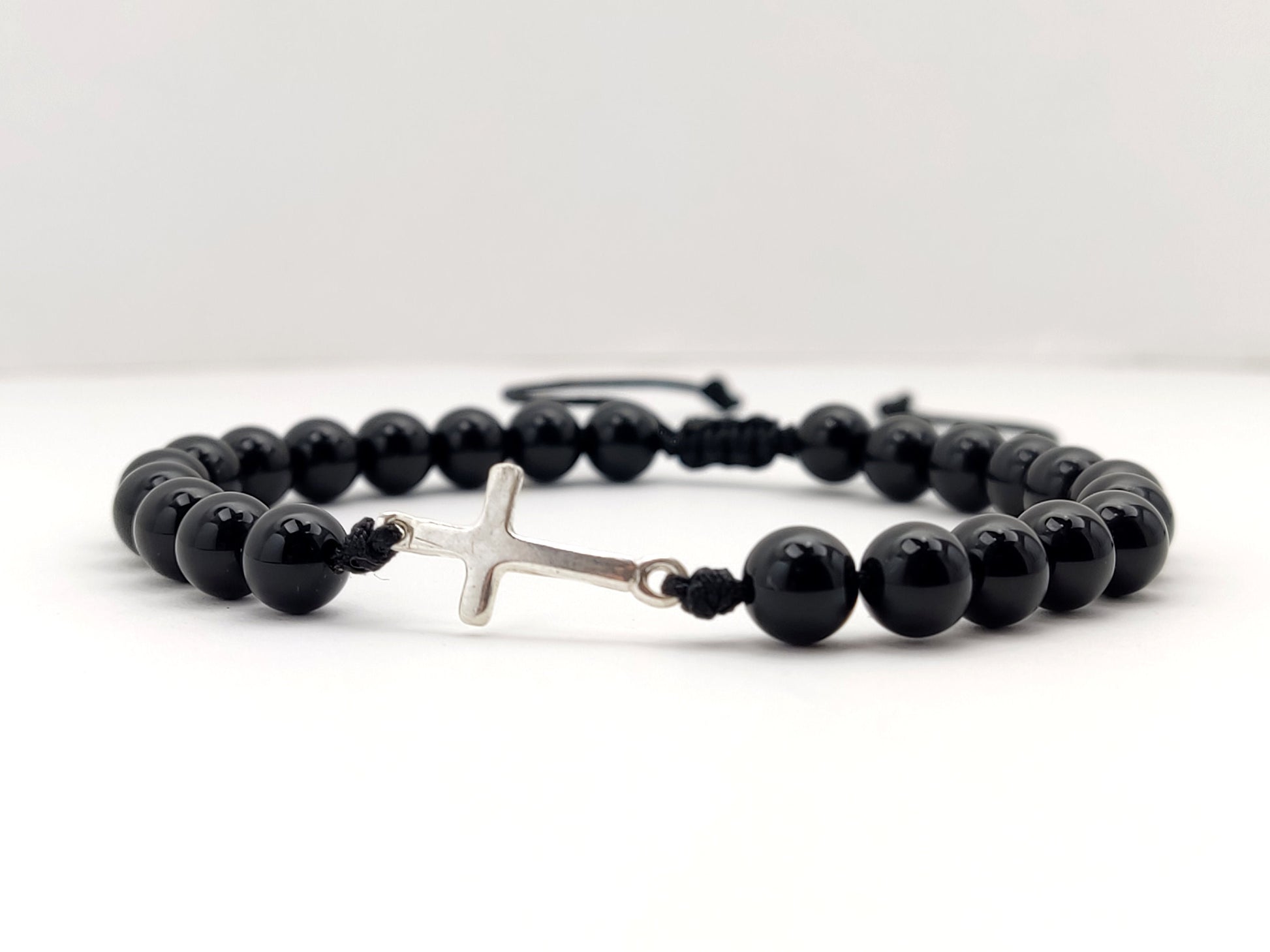 Greek Silver Bracelet, Onyx Jewelry, Silver Cross Bracelet Made With Natural Onyx Black Stones 6mm, Griechischer Silber Armband, Adjustable