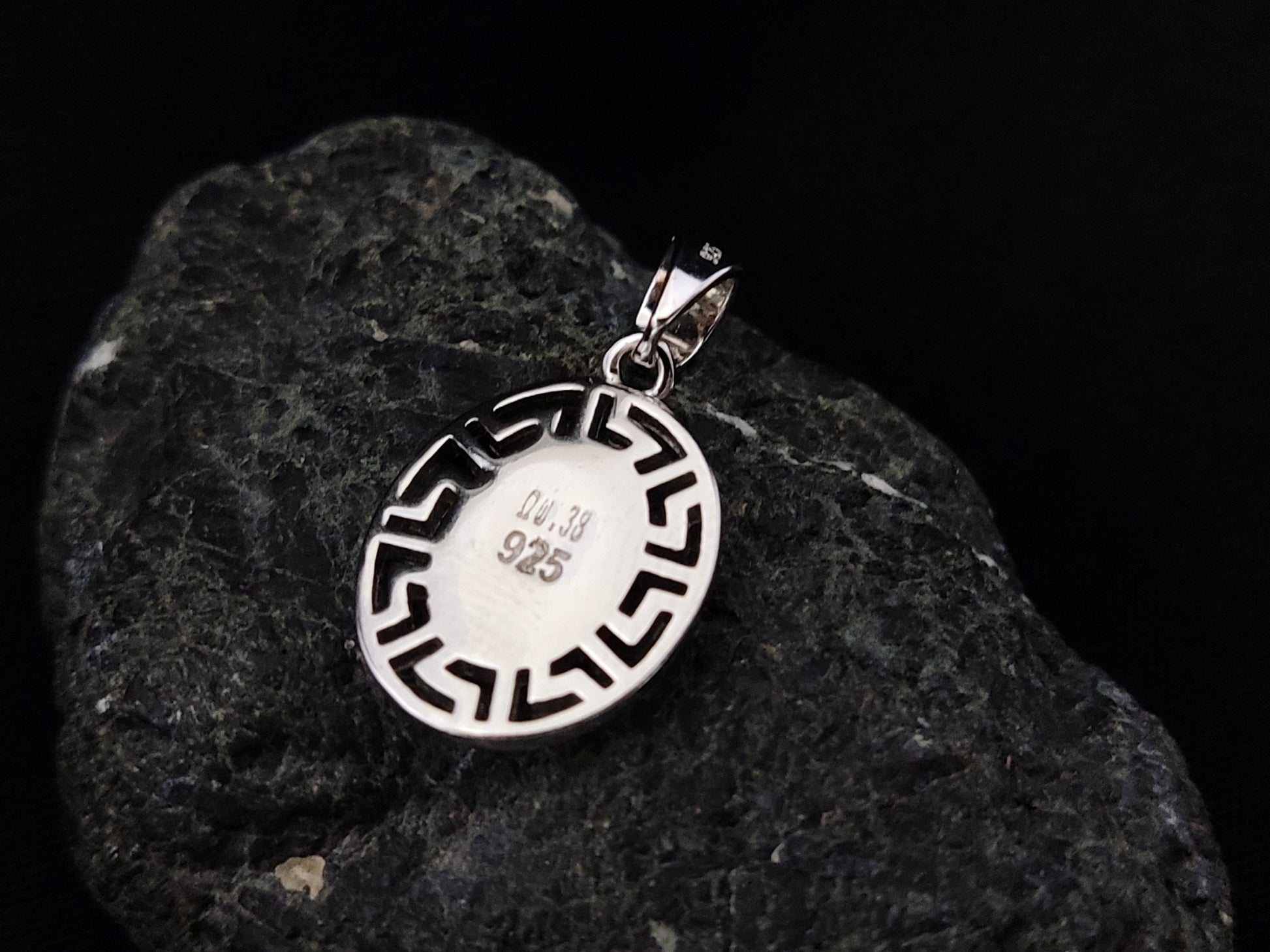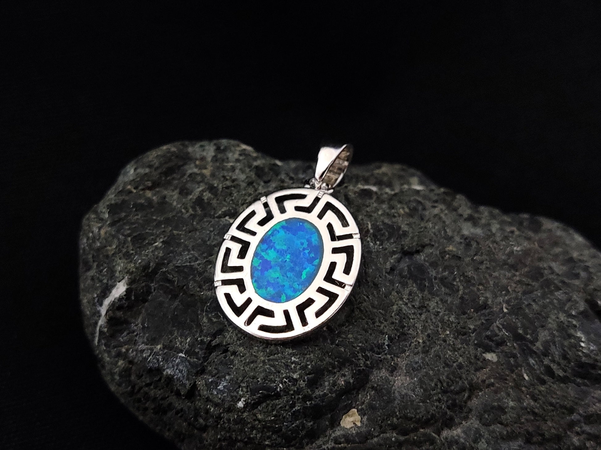 Sterling Silver 925 Fire Rainbow Blue Opal Greek Meander Small Oval Pendant 17x14mm, Ancient Greek Oval Infinity Opal Pendant, Opal Jewelry