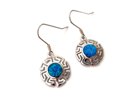 Boucles d'oreilles rondes en opale bleue, clé grecque, 16 mm