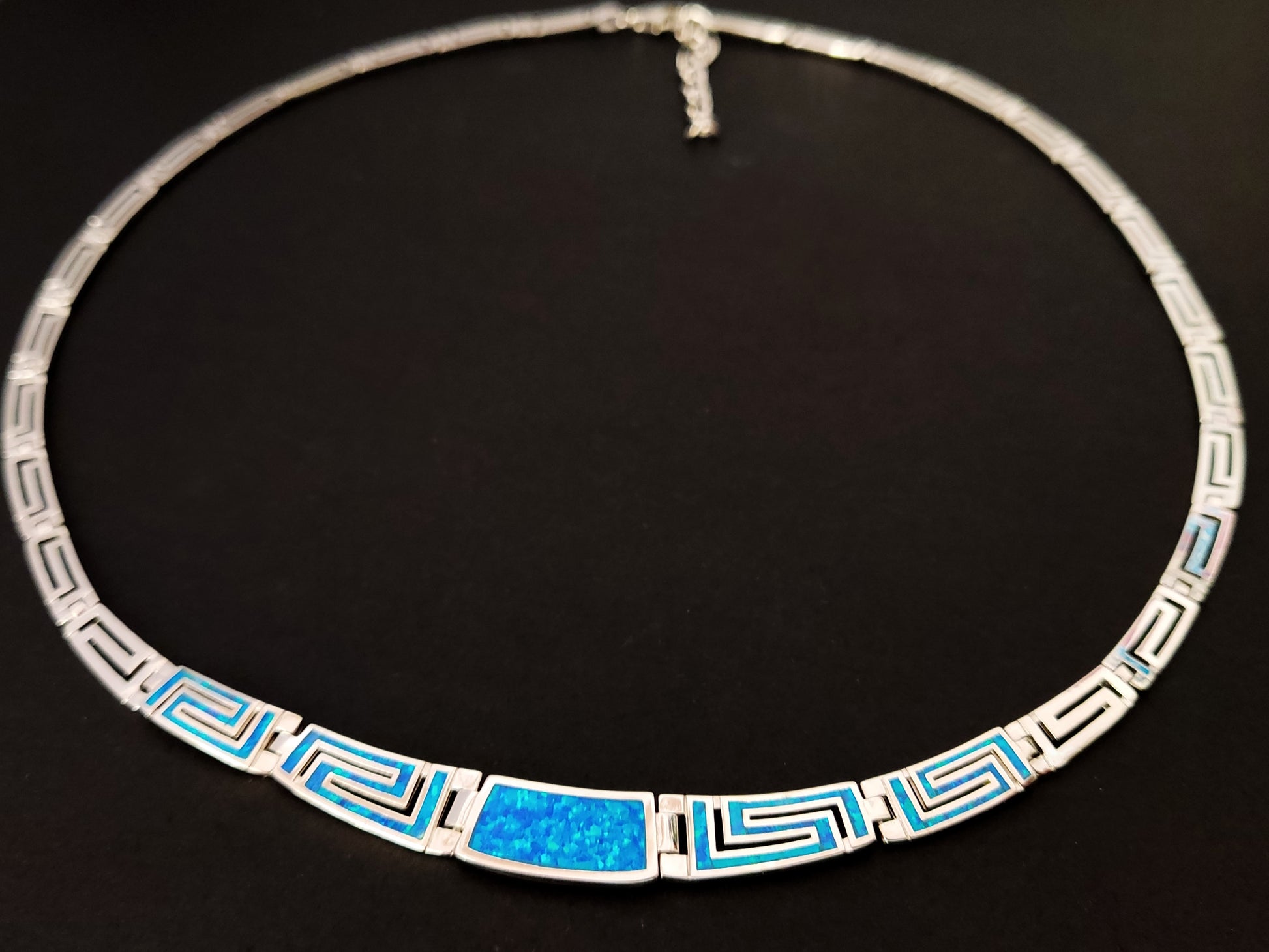 Cet étonnant collier en argent grec est composé d'argent sterling 925 et de pierres d'opale bleu océan qui donnent un look élégant et captivant. Il fait partie de la collection de bijoux grecs en argent et d'autres colliers d'opale bleue peuvent être trouvés ici .