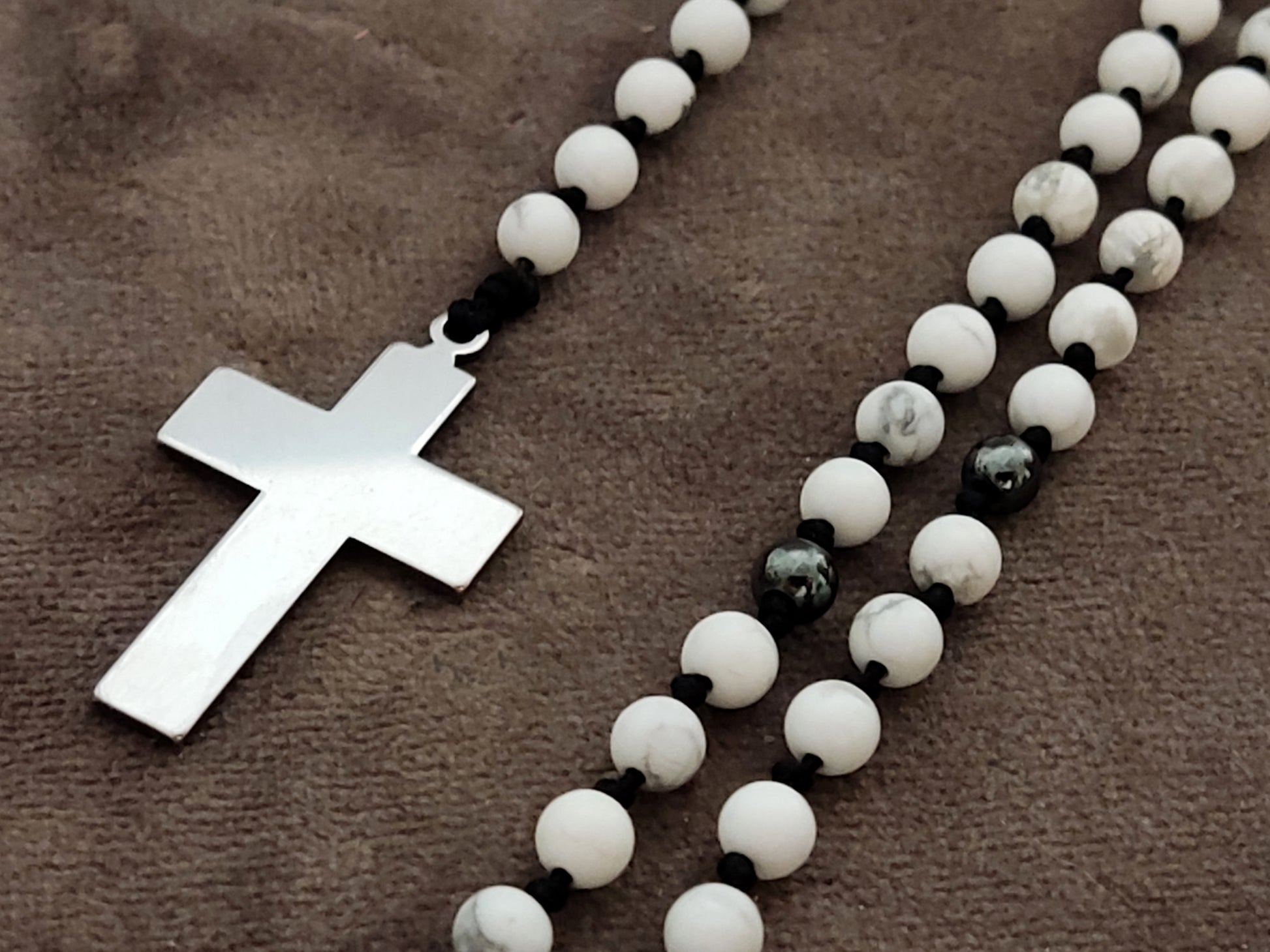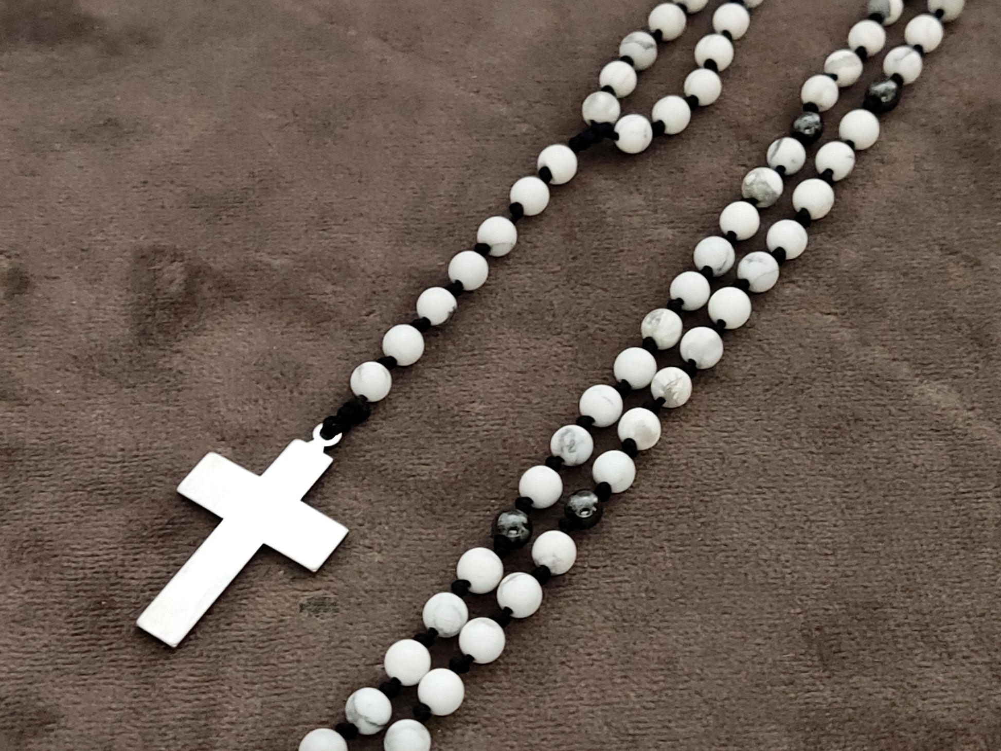 Collier chapelet fait main | Pierres naturelles de howlite et d’hématite blanches | Croix en acier inoxydable | Longueur réglable | Fabriqué en Grèce