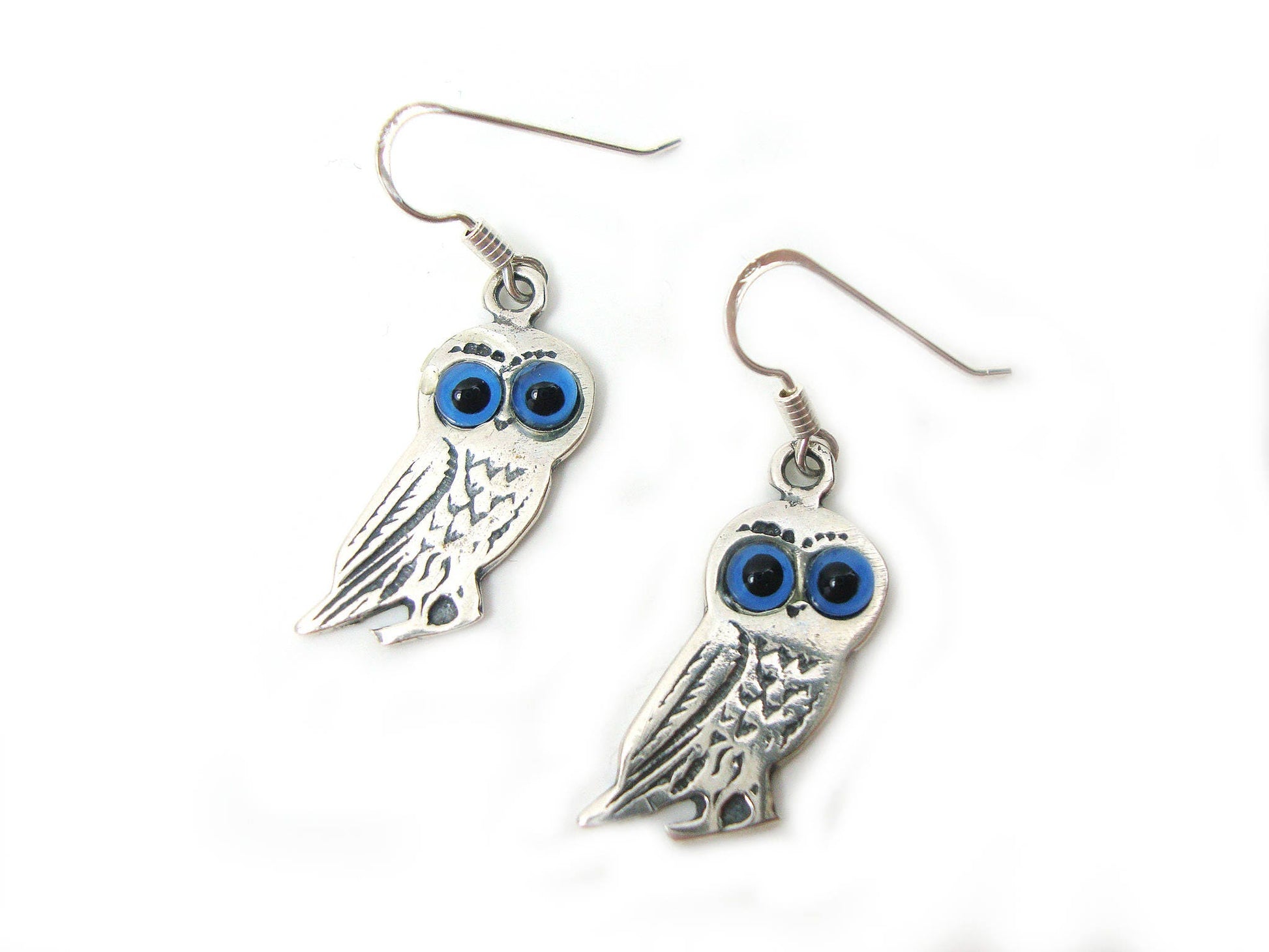 Sterling Silver 925 Ancient Greek Goddess Athena's Owl & Evil Eye Good Luck Charm Dangle Boucles d'oreilles, Griechische Silber Eule Ohrringe