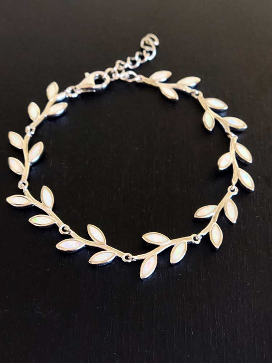 Sterling Silver 925 White Opal Leaf Leaves Adjustable Bracelet