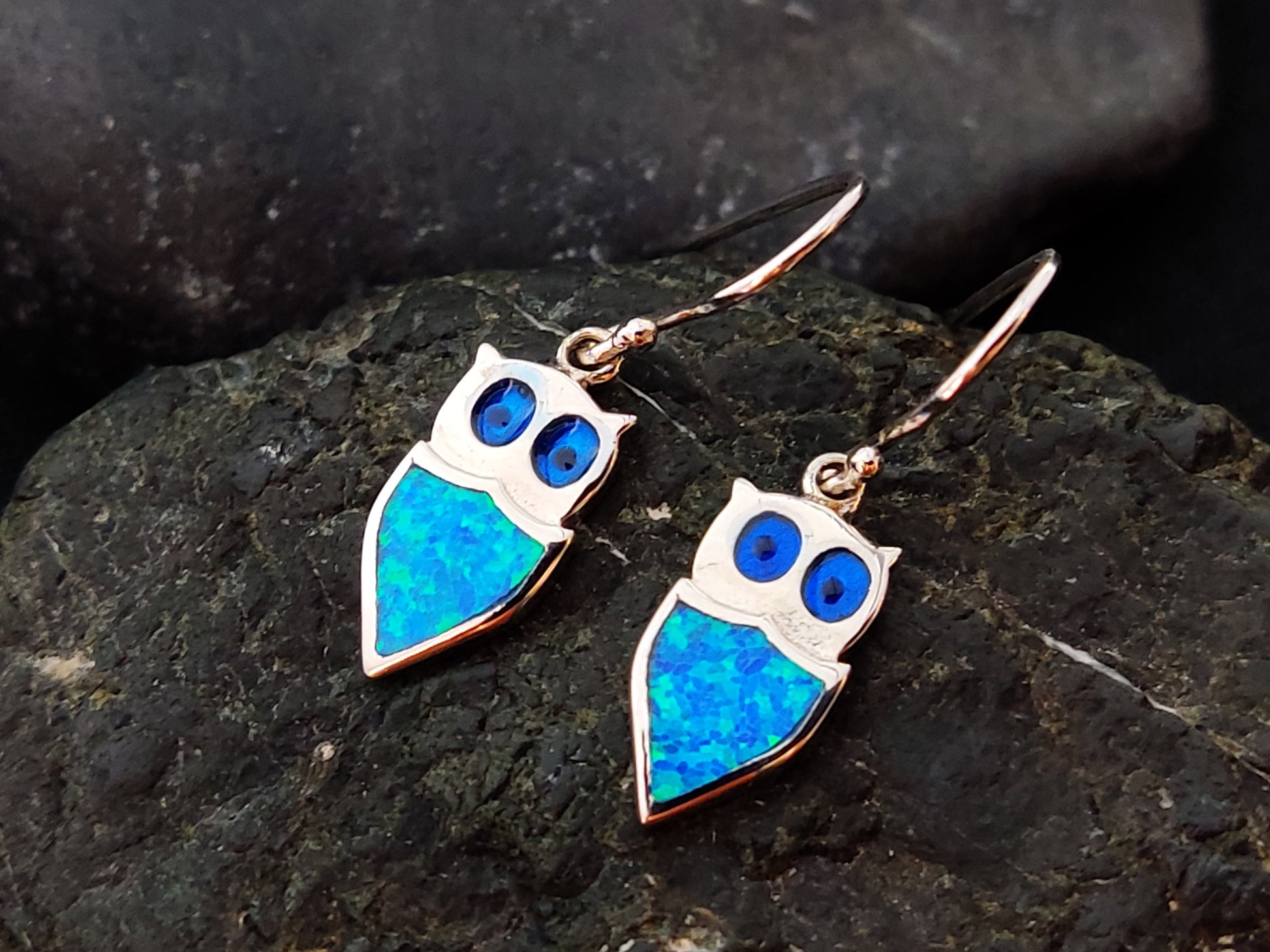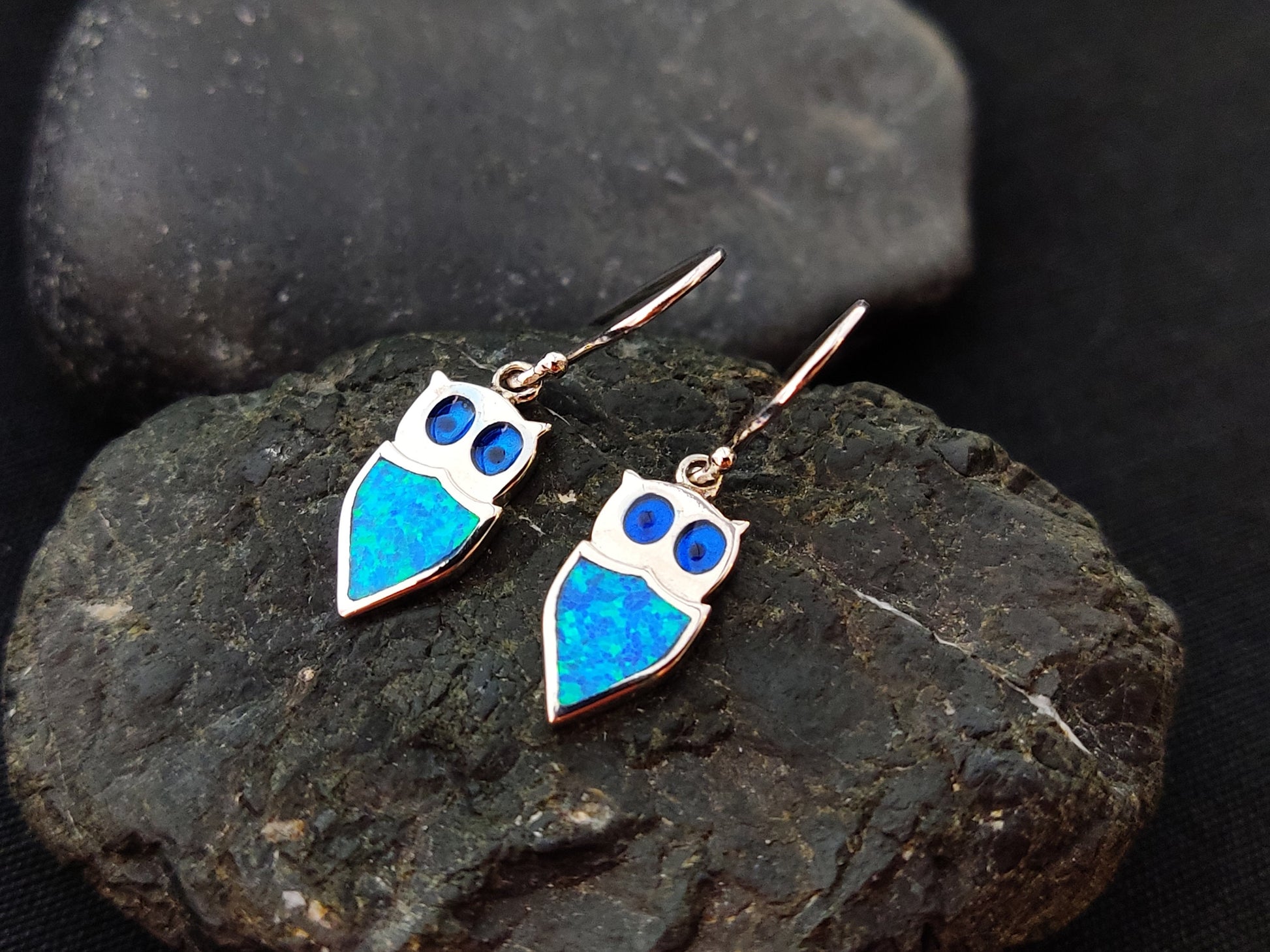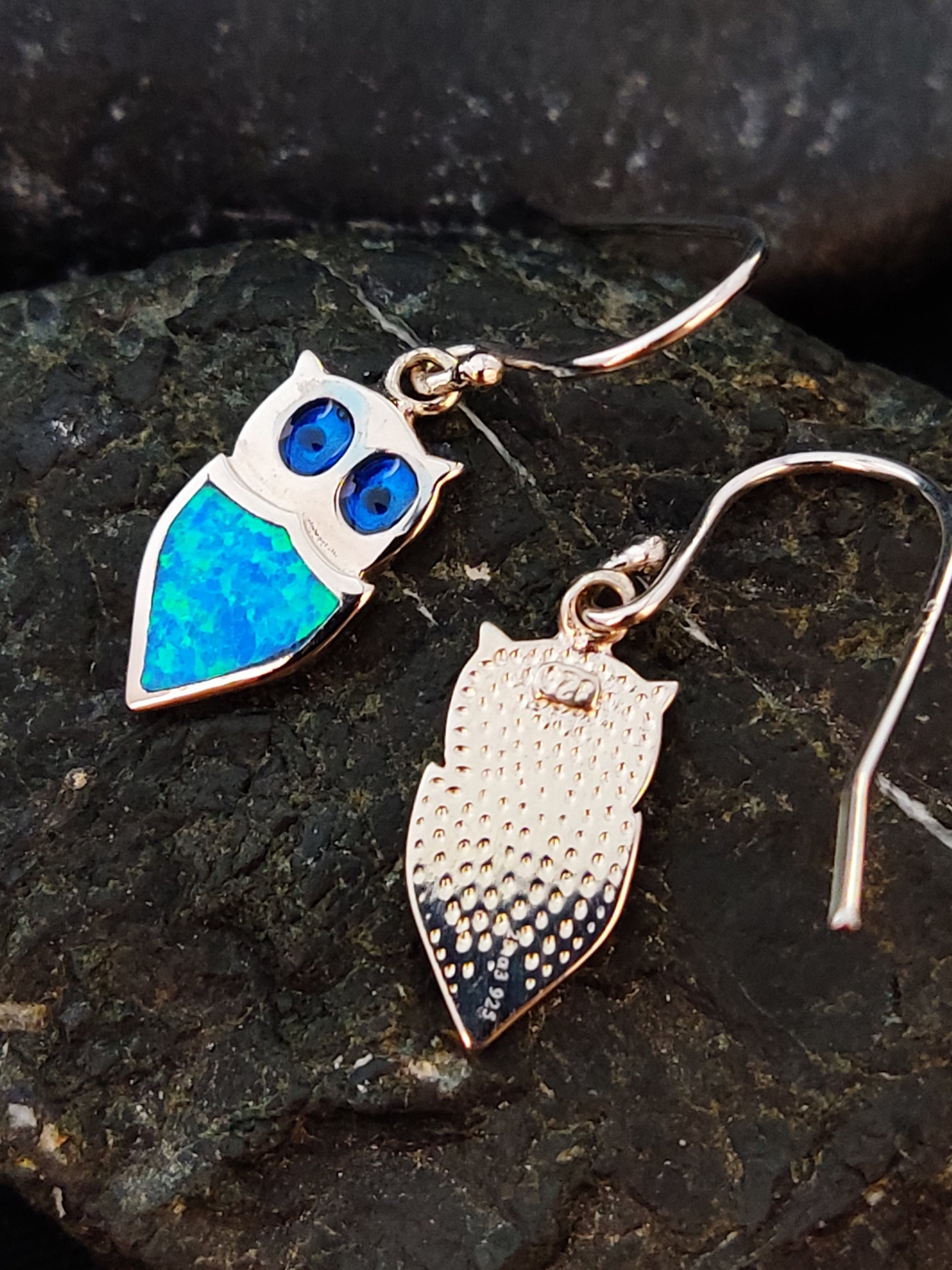 Sterling Silver 925 Ocean Blue Opal Greek Owl Dangle Small Earrings, Eule Schmuck, Griechisches Ohrringe, Bijoux Grecque, Bijoux Grecque
