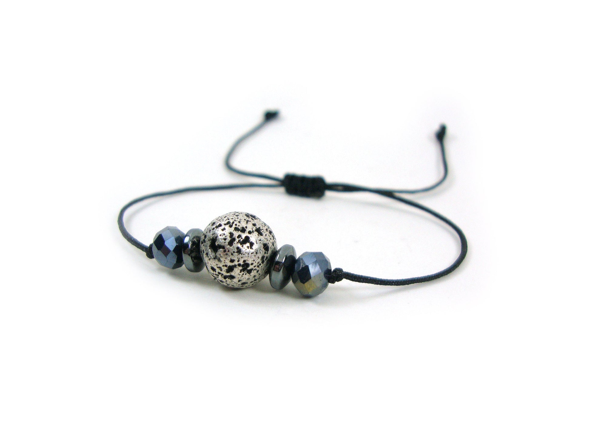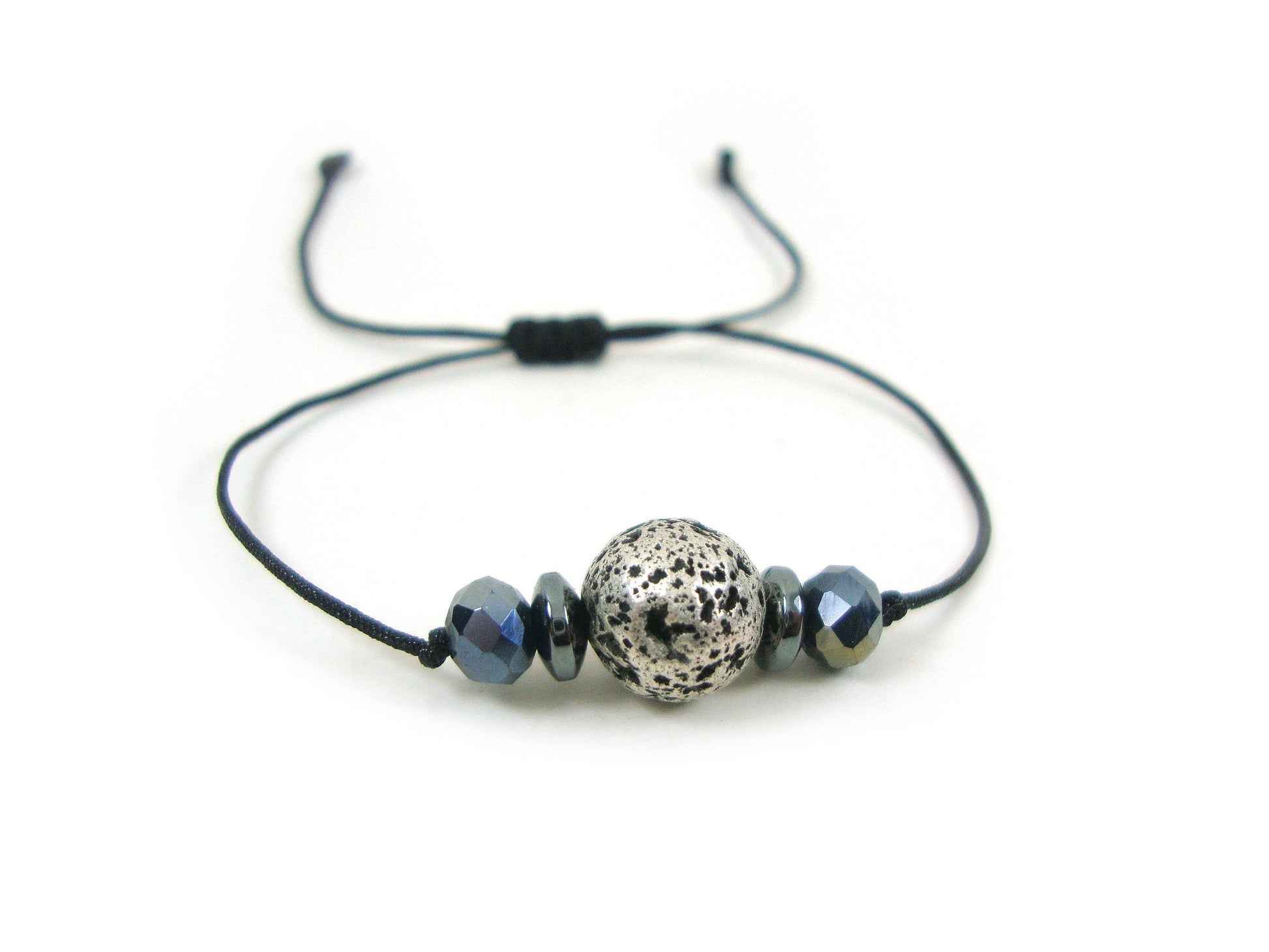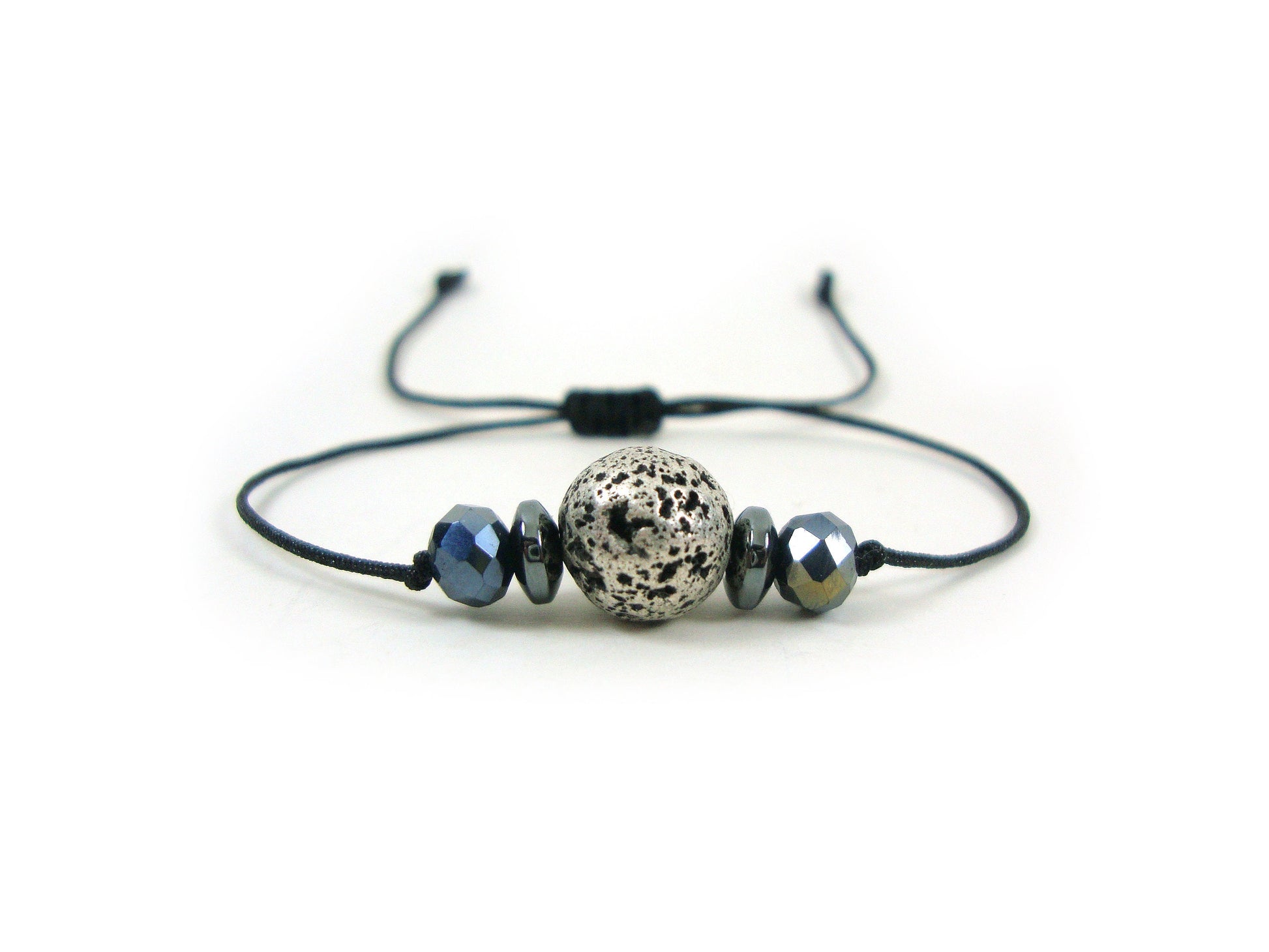 Volcanic Silver Color Lava & Crystal Stones Adjustable Bracelet, Men Women Unisex Bracelet, Meditation Relaxing Greek Lava Bracelet Gift