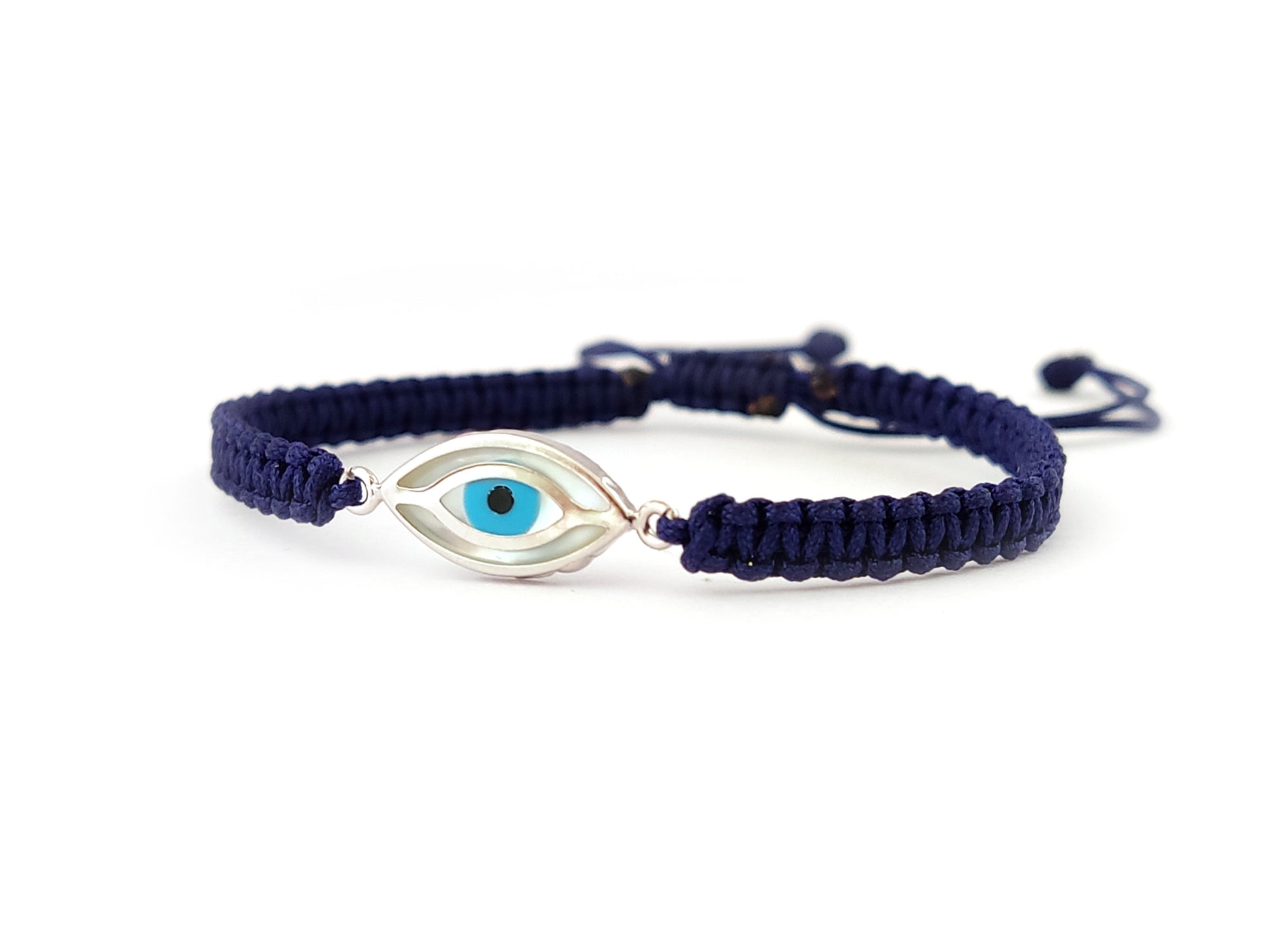 Handmade macrame adjustable bracelet with silver evil eye from Greece measuring 8 x 14 mm. It uses blue cord for a casual and trendy look and can be worn anytime of the day. Our shop has a big collection of silver Evil Eye jewelry and enjoy free shipping worldwide with all your purchases.