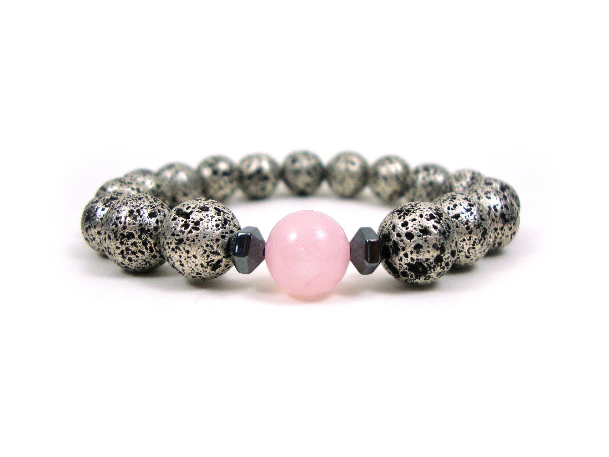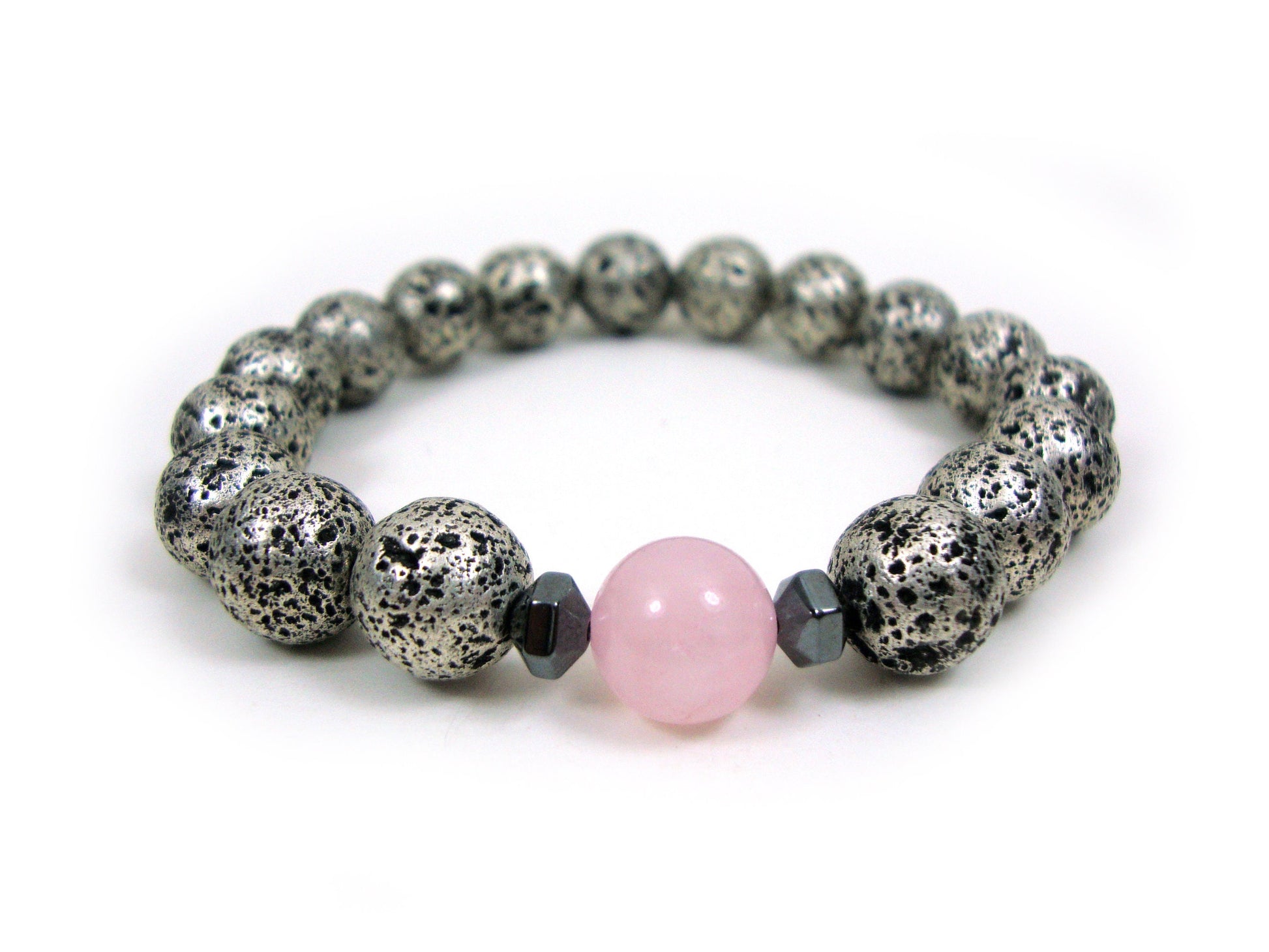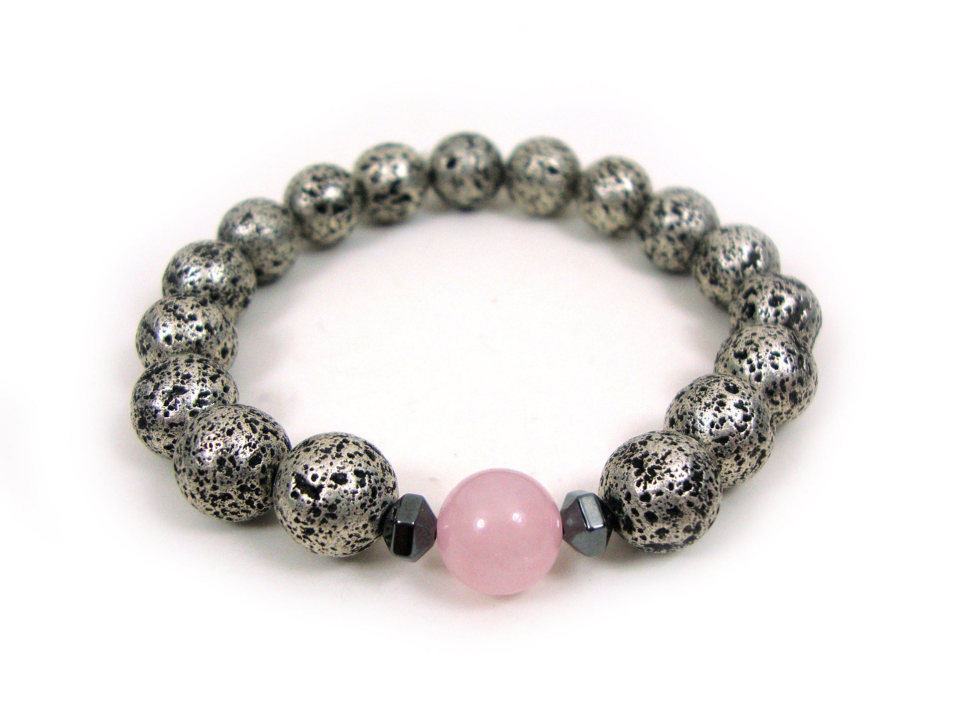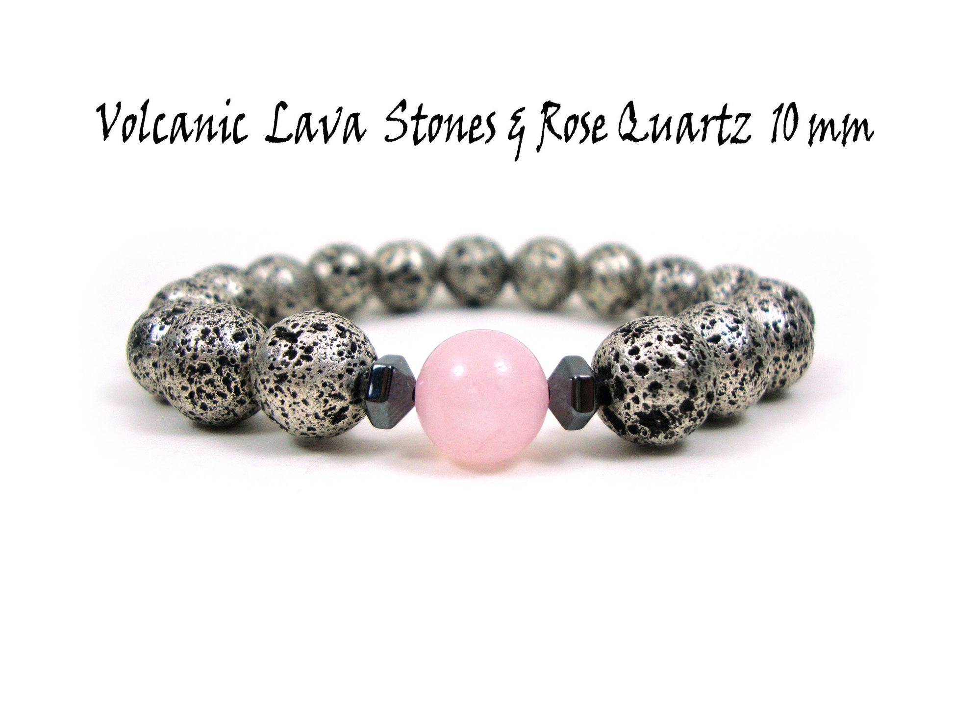 Natural Volcanic Greek Santorini Lava & Rose Quartz Stones 10mm Bracelet, Silver Color Lava Stones, Lava Bracelet, Mens Womens Lava Bracelet