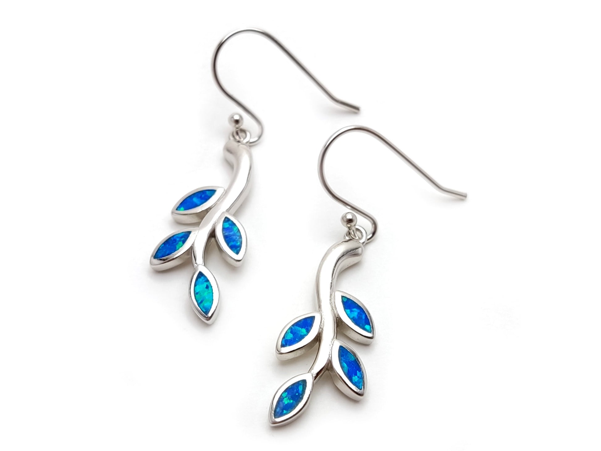 Greek Silver Leaf Leaves Fire Ocean Blue Opal Dangle Earrings, Jewelry From Greece, Griechischer Silber Ohrringe, Bijoux De Grece, 25x10mm