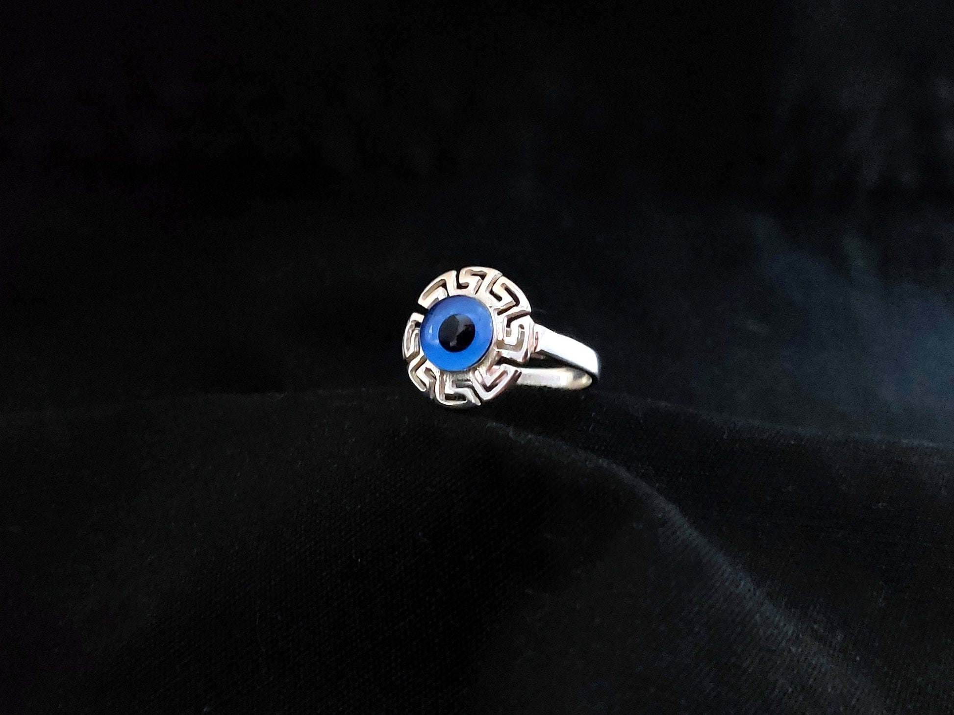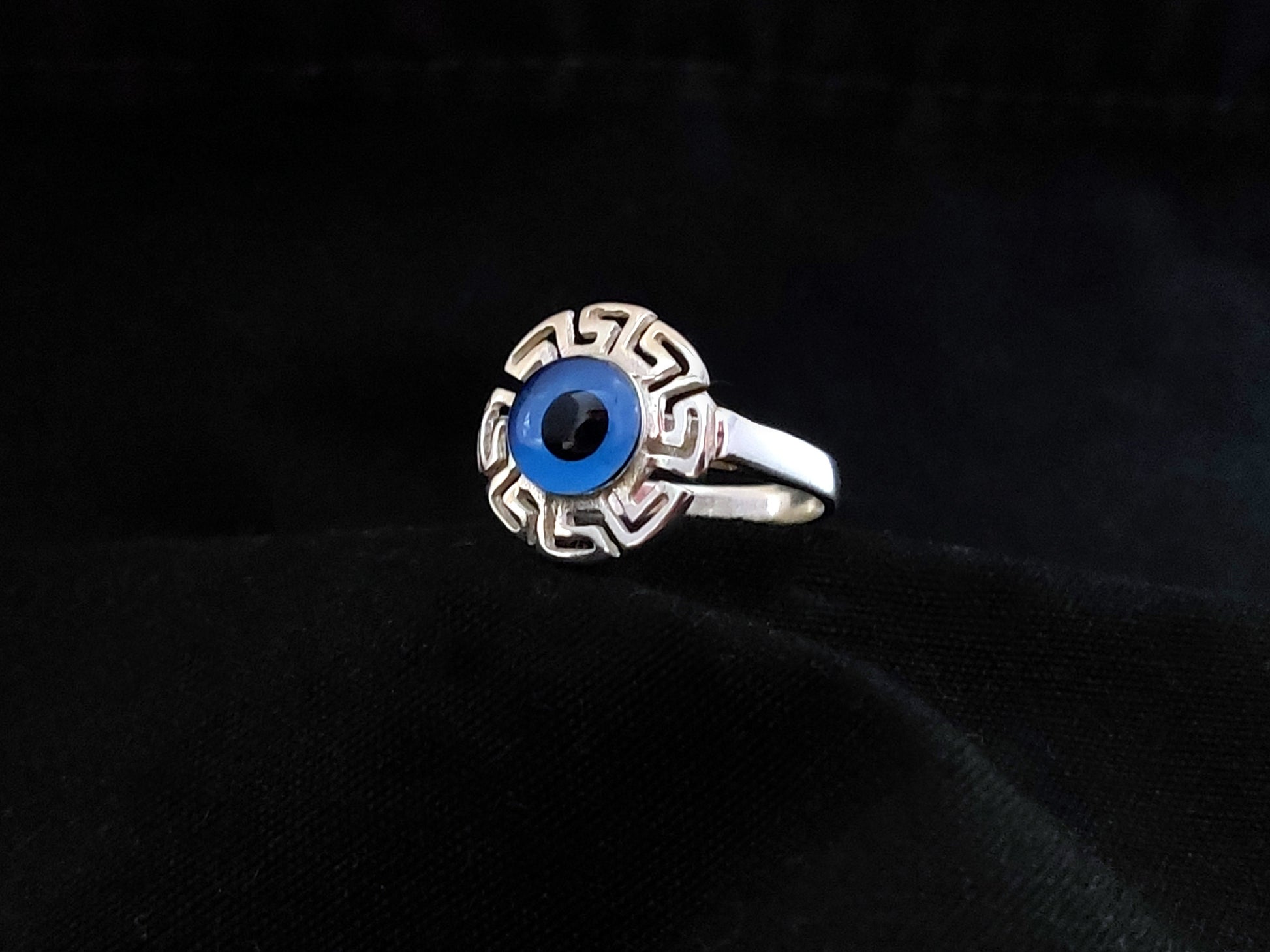 Sterling Silver 925 Ancient Greek Meander Blue Evil Eye Mati 17mm Round Ring , Greek Jewelry, Griechische Ring, Bague Grecque, Evil Eye