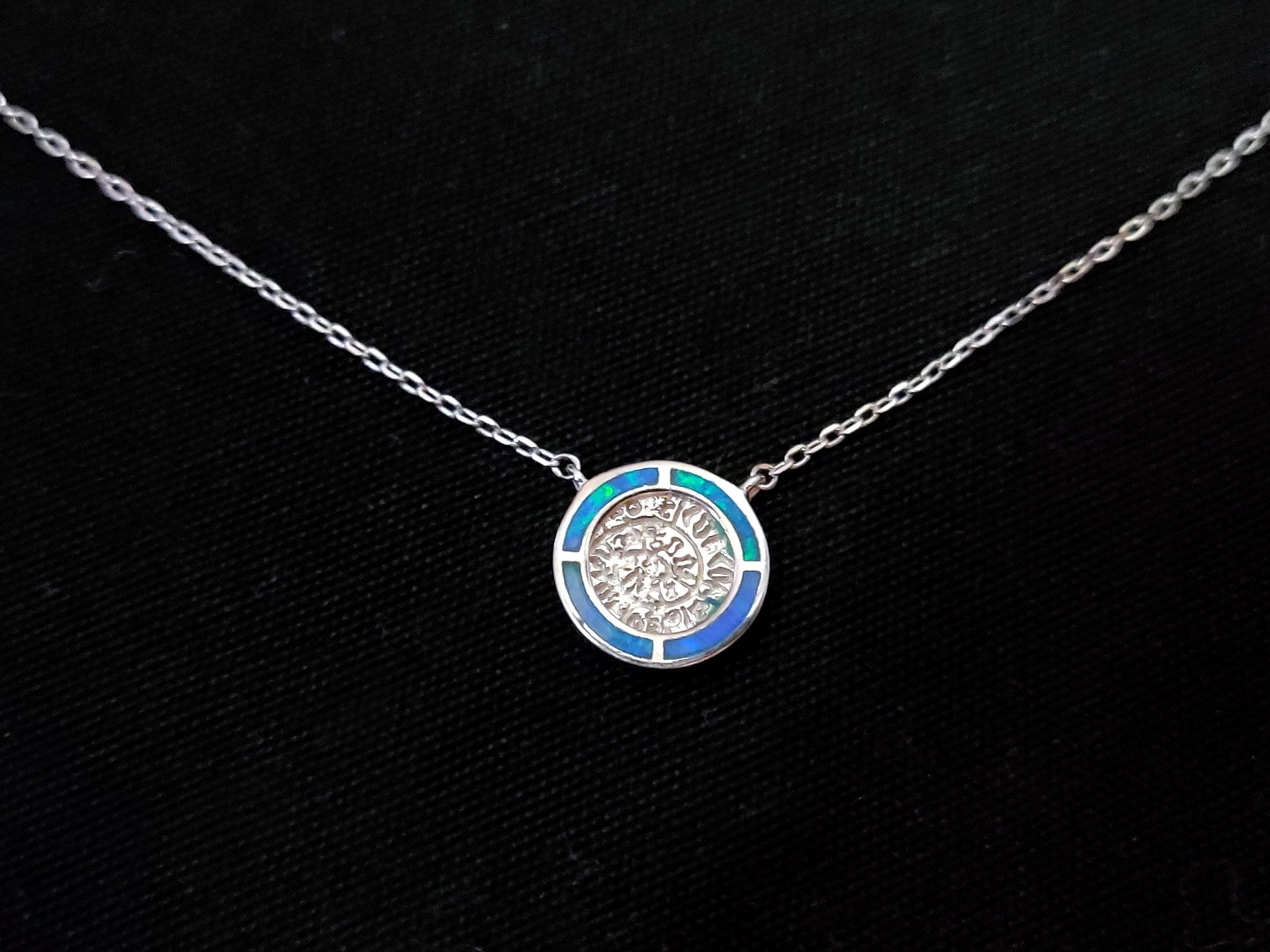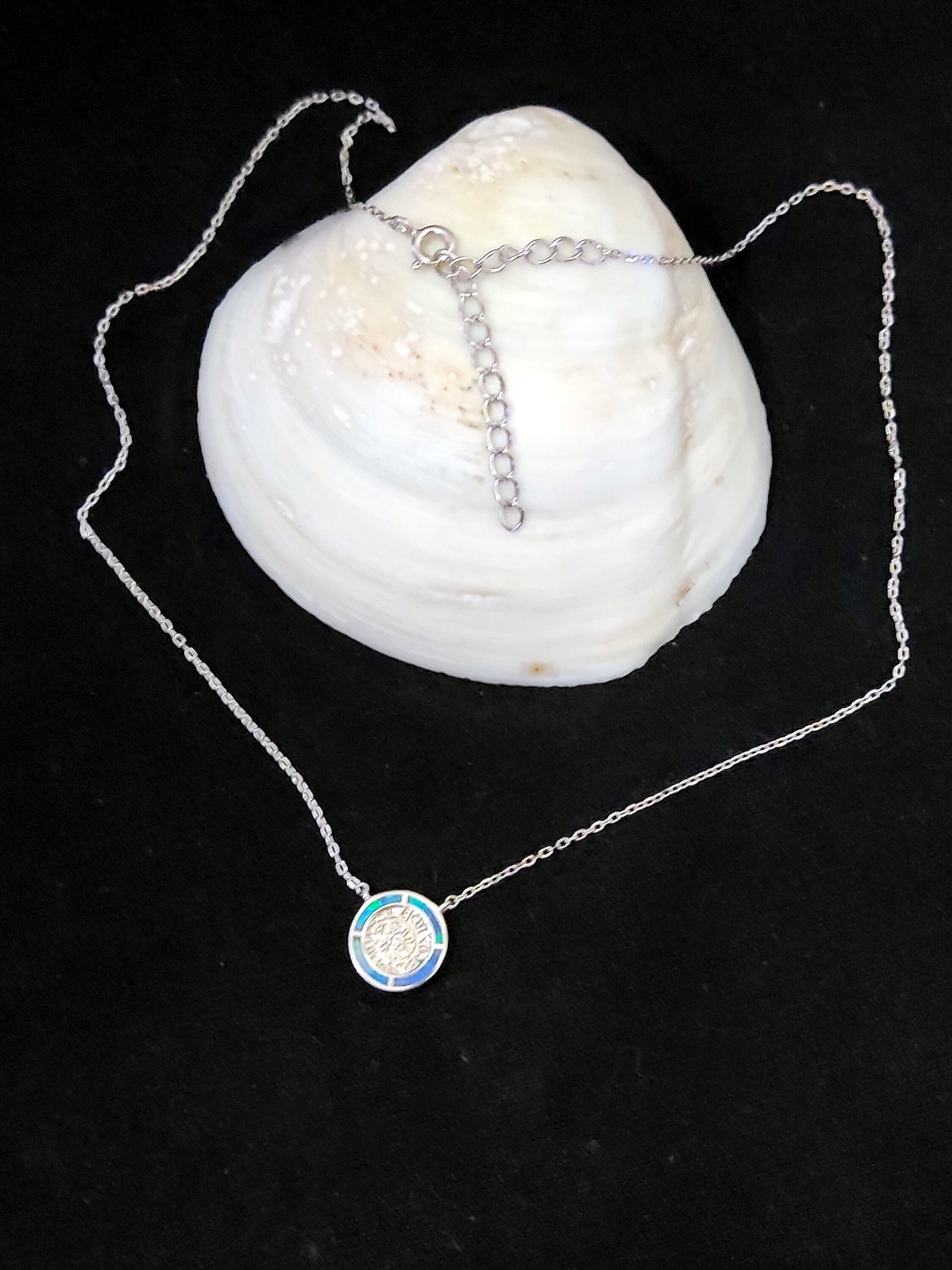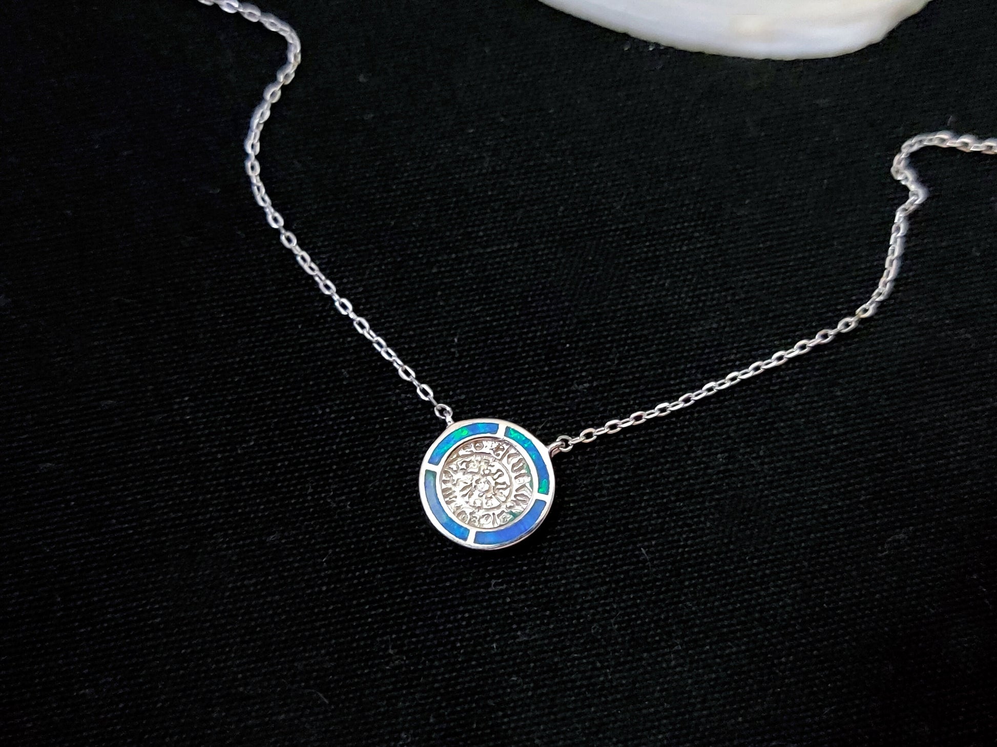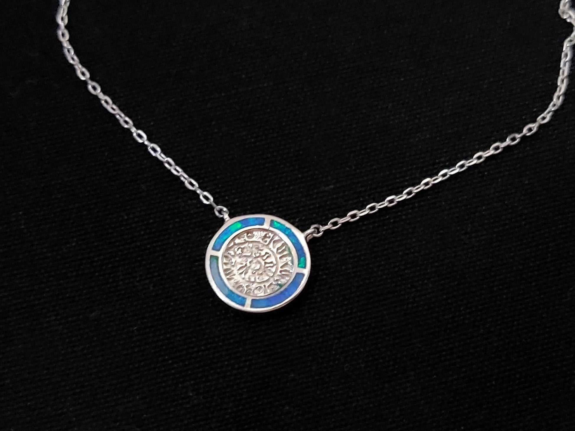 Sterling Silver 925 Fire Rainbow Blue Opal Phaistos Disc Chain Pendant Necklace, Griechischer Opal Kette, Bijoux Grecque, Greek Jewelry