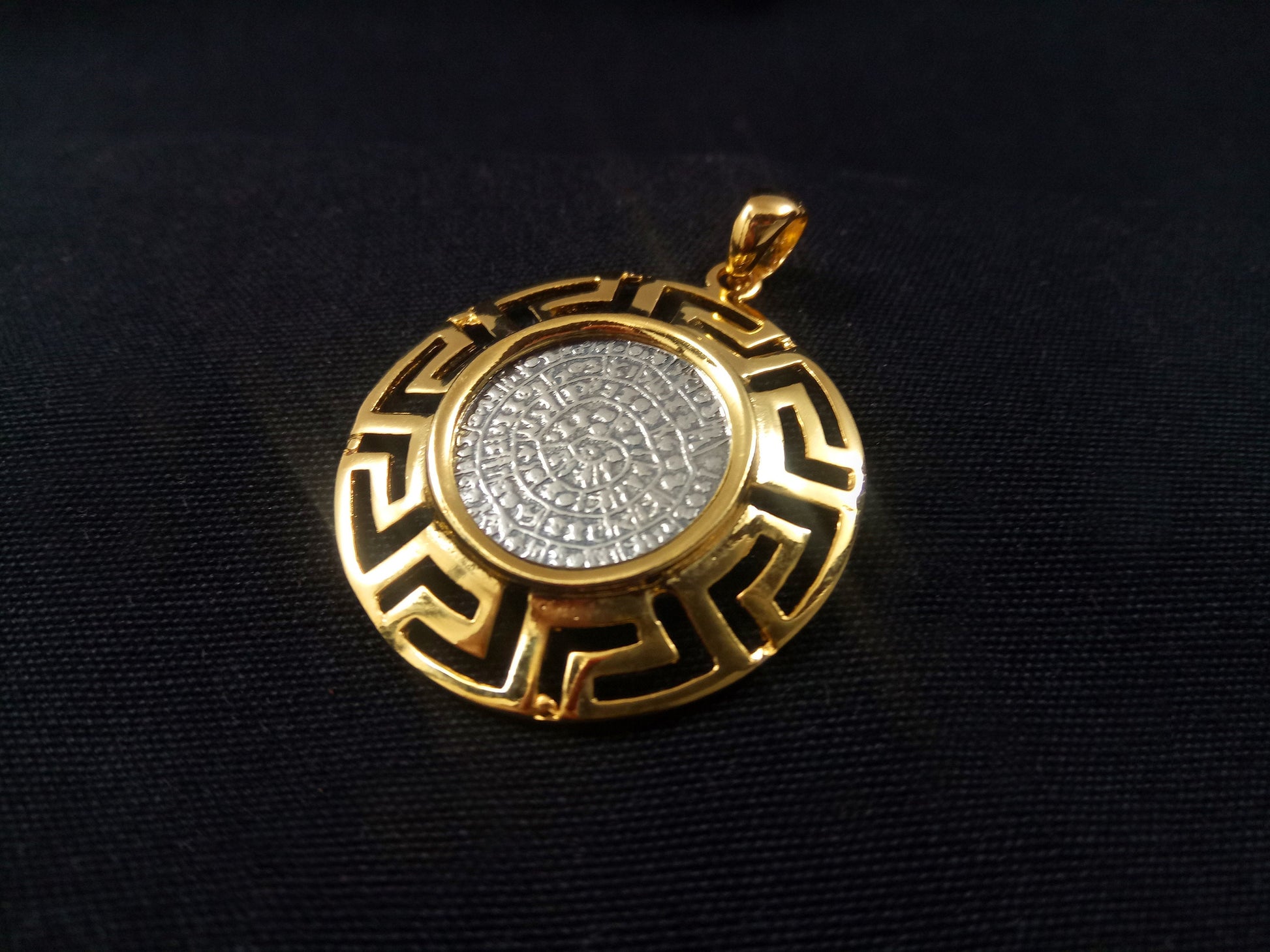Sterling Silver 925 Meander Greek Key & Phaistos Disc Gold Plated 32mm Pendant, Greek Key Pendant, Griechisches Vergoldete Anhanger Schmuck